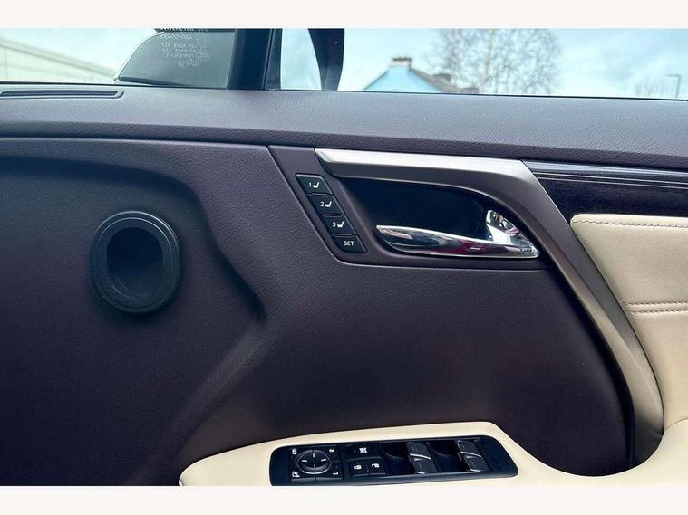 Adaptive cruise control + pre-crash system, Analogue clock, Blind spot monitoring, Bluetooth system, Drive mode selector, Driver alert system, EPAS, Hands free power tailgate, Head up Display, Intelligent parking assist, Lane keep assist, Multi-information display, Park assist system, Premium navigation system, Push button starter, Service interval indicator, Surround camera system, Traffic sign recognition, Trip computer, Wireless Smartphone charger, Adaptive variable suspension, VDIM, Vehicle Stability Control (VSC), Auxiliary input socket, DAB Digital radio, DVD System, Mark Levinson premium surround system, Steering wheel mounted audio/telephone controls, USB connection, Adaptive front lighting system, Adaptive high beam assist, Auto dimming interior mirror + dimming door mirrors, Body colour bumpers, Door mirror memory, Electric folding door mirrors, Electric sunroof, Electrochromatic rear view mirror, Front and rear electric windows, Front windscreen de-icer, Headlight washers, Heated door mirrors, Laminated front side windows, LED daytime running lights, LED front fog lights with static cornering light function, LED Headlights, LED rear lights, Privacy glass (rear side windows and rear screen), Puddle lights, Rain sensor windscreen wipers, Rear side window blinds, Rear wiper, Sunroof, UV reducing glass, 10 way electric power front seats, 2 bag hooks in luggage compartment, 3 rear headrests, 3 x 12V power sockets, 4 load securing hooks in luggage area, 4 way adjustable lumbar support, 60/40 split sliding rear seats, Auto air recirculation, Carpet mats, Centre armrest with storage box, Clean air filter, Driver and passenger seat memory, Driver/passenger temperature controls, Dual zone climate control, Electric adjustable steering column, Front centre armrest with 2 cupholders, Front head restraints, Front seat back map pockets, Heated and ventilated front seats, Illuminated entry system, Illuminated scuff plates, Isofix standard child seat restraint mounting, Leather gear knob, Leather gear lever, LED interior illumination, Memory for steering column, Multi function steering wheel, Rear armrest with storage + cupholders, Rear door map pockets, Semi-aniline leather upholstery, Sunglasses holder, Sunvisors with illuminated vanity mirrors, ABS, Curtain airbags, Driver/Front Passenger airbags, Driver/front passenger side airbags, Drivers knee airbag, EBD + Brake Assist, Electronic parking brake, Electronically controlled braking, Front/rear seatbelt pre-tensioners, Hill start assist, Passenger airbag cut-off device, Passenger knee airbag, Rear cross traffic auto brake, Rear passenger side airbags, Sway warning system, Three 3 point rear seatbelts, Traction control, Tyre pressure warning, WIL whiplash protection front seats, Anti theft alarm, Deadlocks, Immobiliser, Intrusion sensor and alarm, Locking wheel nuts, Remote central double locking, Smart card entry, Smart keyless entry, Laser cut dark wood with aluminium inlay, 20" Alloy wheels, Space saver spare wheel,