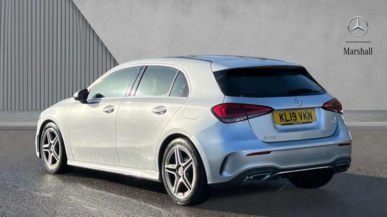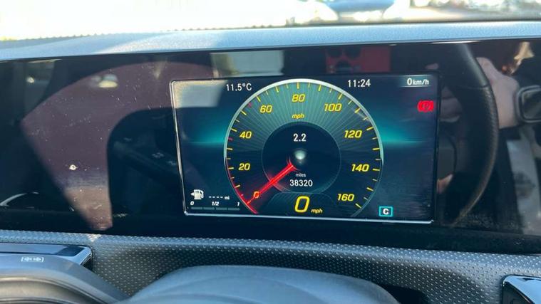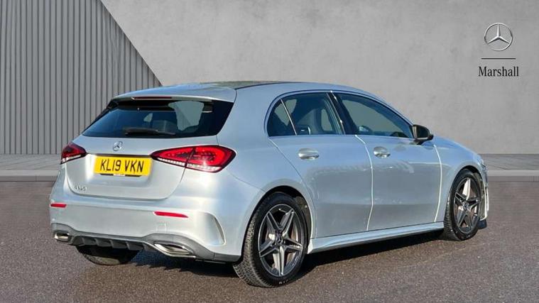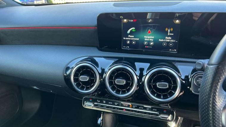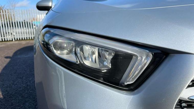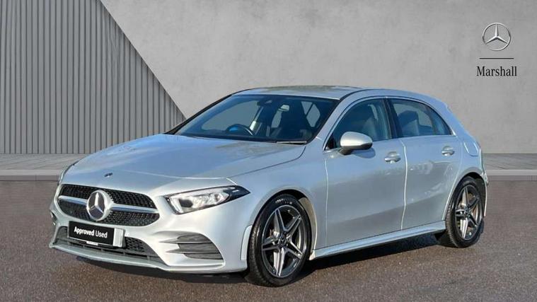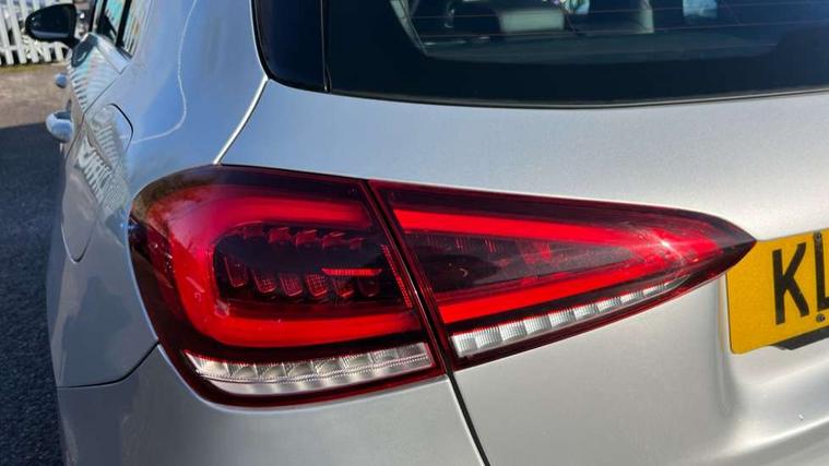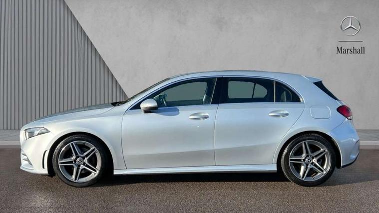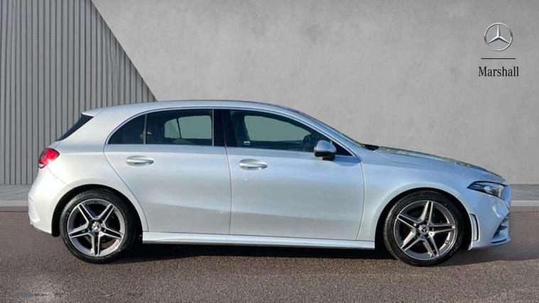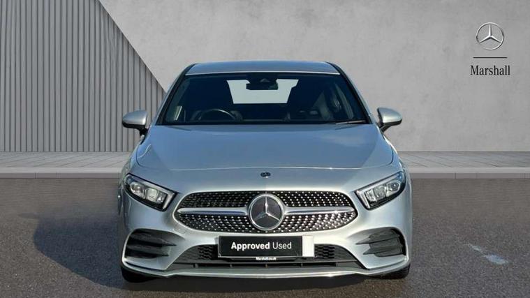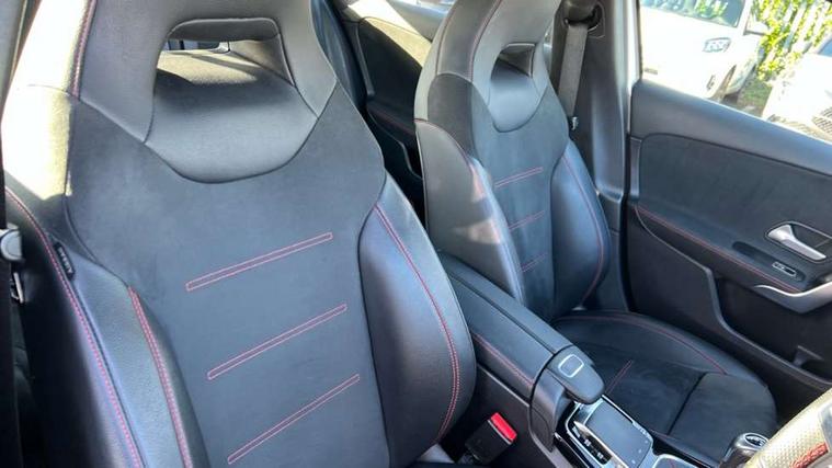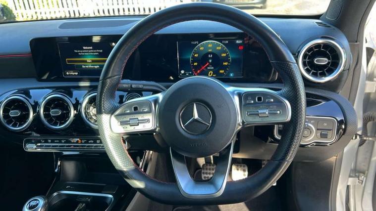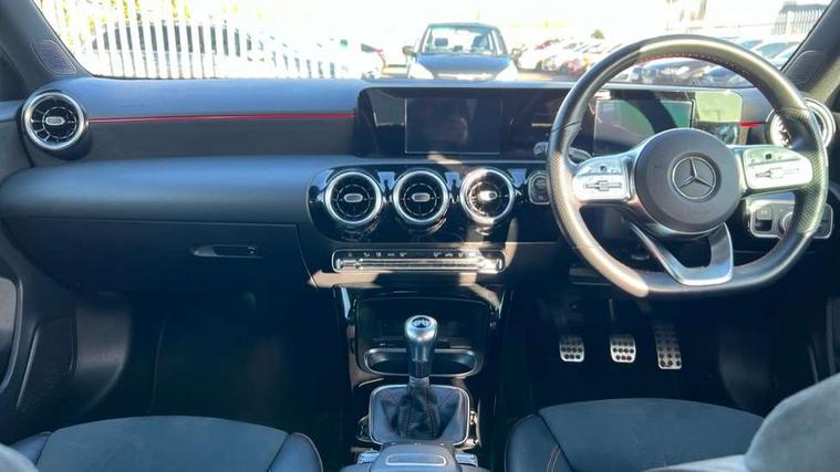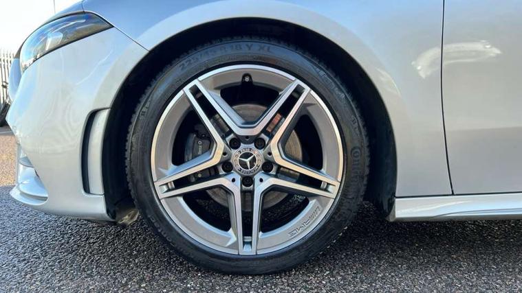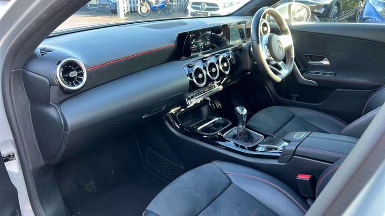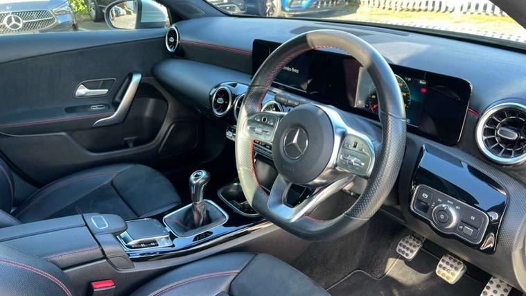 180 degree rear view camera with parking guidelines, 7" colour screen in instrument panel, 7" touchscreen media display, Active lane keep assist, Attention assist, Brake pad wear indicator warning light, Cruise control + speed limiter, Direct steering, DYNAMIC SELECT with a choice of driving modes (ECO, Comfort, Sport and Individual), ECO start/stop function, Fluid level warning indicator for fuel, oil, coolant and washer fluid, Hard-disk navigation, Hey Mercedes Voice activation, Lamp failure indicator, Mercedes me connect including emergency call system, accident recovery, breakdown and maintenance management, Outside temperature gauge, Radio aerial integrated into roof spoiler, Service indicator (ASSYST), Speed sensitive power steering, Trip computer, Lowered comfort suspension, DAB Digital radio, Dual bluetooth interface, 2 USB ports (type C), MBUX multimedia system with DAB digital radio and touchpad including satellite navigation, 4 Electric Front and Rear windows, Active aerodynamics with AIRPANEL in the front apron, Adaptive brake lights, AMG front, rear apron and side skirts, Blue tinted glass, Body colour bumpers, Body colour door handles, Body colour side skirt, Body coloured door mirrors, Chrome beltline trim, Diamond radiator grille with chrome pins and silver louvre + chrome insert, Electric adjustable and heated door mirrors with integrated LED side indicators, Exhaust system - Twin trapezoidal tailpipes in polished stainless steel, Headlamp assist automatic headlamp activation, Heated glass rear windscreen + timer control, LED high performance headlamps with integrated LED daytime running lights, LED tail lamp, LED third brake light, Privacy glass, Rain sensor windscreen wipers, Rear fog lights, Rear wiper, 12V socket, 3 Spoke flat bottom leather multi function steering wheel with perforated leather in grip area, 40:20:40 split folding rear seats, Air vents surround and cruciform nozzle in silver chrome, AMG floor mats with red stitching, Artico man-made leather/Microfibre Dinamica upholstery with red contrast stitching, Auto Mercedes-Benz child seat recognition sensor, Black roof lining, Brushed stainless steel sports pedals with rubber studs, Controller on centre console with chrome surround, Cup holder and stowage compartment lighting, Freight packaging without tie-down hooks, Front centre armrest with storage compartment, Front door sills with Mercedes Benz lettering, Front doors with ambient and signal light, Front footwell lights, Front reading lamps in left and right console downlighter, Front seat backs luggage nets, Front seat cushion length adjustment, Front signal exit lamp, Front vanity lights, Handle recess/closing light, Height/reach adjustable steering column, Illuminated glove compartment stowage, ISOFIX Child seat top tethers and anchor fixings, Manual height adjustable front seats, Oddments tray lighting, Rear head restraints, Rear Reading Lamps, Seat occupancy sensor for front passenger seat, Spectacles compartment for driver, Sports seats with integrated headrests, Storage compartment under load area floor, Sunvisors with illuminated vanity mirrors, Touchpad, Touchpad illumination, Twin front cupholders, Two zone thermotronic luxury automatic climate control, Light and sight pack - A Class, Seat comfort pack - A Class, 3 rear 3 point seatbelts, ABS with Brake Assist, Active bonnet, Active brake assist includes forward collision warning system with autonomous braking, Adaptive brake assist with hold function and hill start assist, Black seatbelts, Childproof locks manually operated for rear doors and electrically operated for rear power windows, Crash responsive emergency lighting, Driver and passenger head and side airbags, Drivers knee airbag, Dual stage driver/passenger airbags, Electronic parking brake, ESP curve dynamic assist, ESP with ASR, Front and rear seatbelt reminder, Front brake callipers with Mercedes Benz lettering, Tyre pressure monitoring system, Warning triangle and first aid kit, Window airbags, Alarm system/interior protection/immobiliser, Keyless Go, Remote central locking and crash sensor with emergency opening function, 18" AMG 5 twin spoke light alloy wheels in titanium grey with highsheen finish, Summer tyres, Tirefit sealant kit,