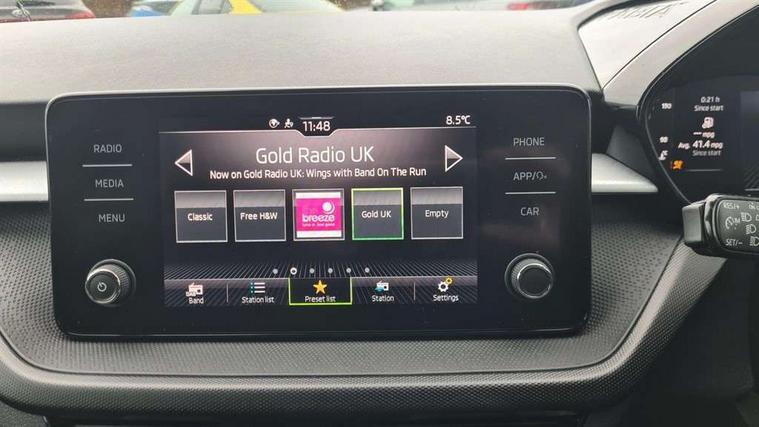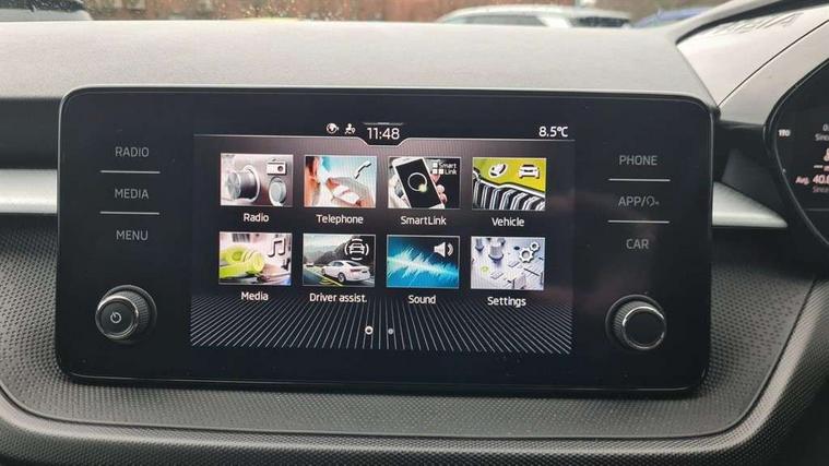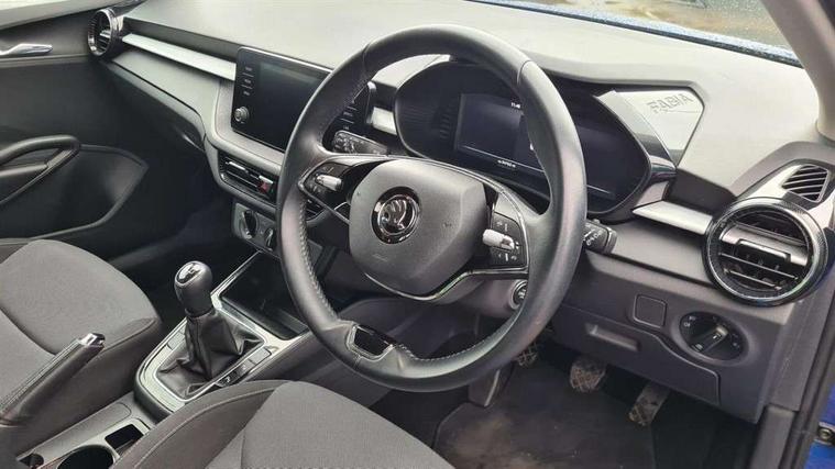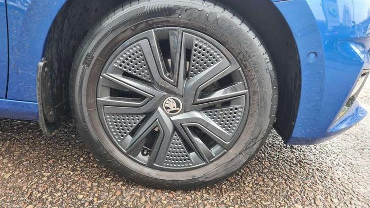 Bluetooth connection, Driver alert system - DAS, Electromechanical power steering, Exterior temperature gauge, Lane assist including road edge detection, Service interval indicator, Virtual cockpit with 10.25" colour display, 2x USB-C in the front (for data transmission and charging), 6 Speakers (4 in front and 2 in rear), Auxiliary socket for external MP3 player, Bolero radio with 8" colour display, DAB digital radio reception, Basic rear lights, Body coloured bumpers, Dimming rear view mirror with black frame, Door mirror integrated indicators, Electrically adjustable and heated door mirrors, Electrically adjustable front windows with function auto up/down, Front window wiper intermittent control, Headlight range control - Automatic, Ice scraper in fuel cap, LED daytime running lights with coming and leaving home feature, Mechanical adjustable rear windows, Privacy glass, Rear LED fog light, Rear side wing doors, Rear window wiper with washing nozzles, Roof mounted spoiler, SKODA tailgate lettering in chrome, Third brake light, 3 rear headrests, Backrest split and folding, Central console with fixed cup holder and storage box, Chrome handbrake release button, Fabric upholstery, Gearshift knob/handle in leather, Grain satin black interior door handles, Hand brake lever handle in leather, Height adjustable front headrests, Height adjustable steering wheel, ISOFIX and TopTether anchorage points to the outer rear seats, ISOFIX and TopTether on the front passenger seat, Luggage compartment lighting, Pollen filter, Rear seat bench unsplit, Single front passenger seat, Storm grey headlining, Sun visors with mirror and airbag label on passenger side, Ticket holder, Umbrella in drivers door, 3-point height adjustable front seats belts with pretensioner and force limiter, Automatic warning lights in case of crash, Driver and passengers airbag with switch off function, e-Call+, ESC including ABS, MSR, ASR, EDS, HBA and XDS, Front and rear seat belt warning, FRONT ASSIST (AEB City and AEB Inter Urban), Front side airbags, Head airbags, One tone horn, Pedestrian protection, Three rear 3-points safety seat belts with pretensioner and force limiter including stop function for outer rear seat belts, Tyre pressure monitoring system, Anti-theft alarm system including immobiliser, interior monitoring, backup horn, and towing protection, Anodized cross line upper decorative trim, Colour Edition air vents, Grain satin black central console cover, Grain satin black lower decorative trim, Satin black door and side trim panel in front, Anti-theft wheel bolts protection, Super-low rolling resistance tyres,