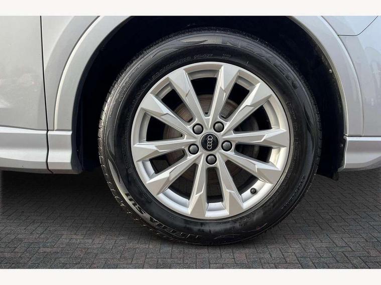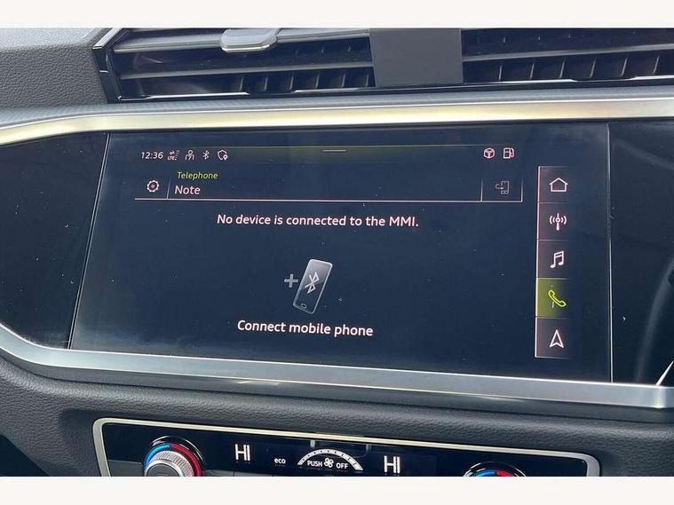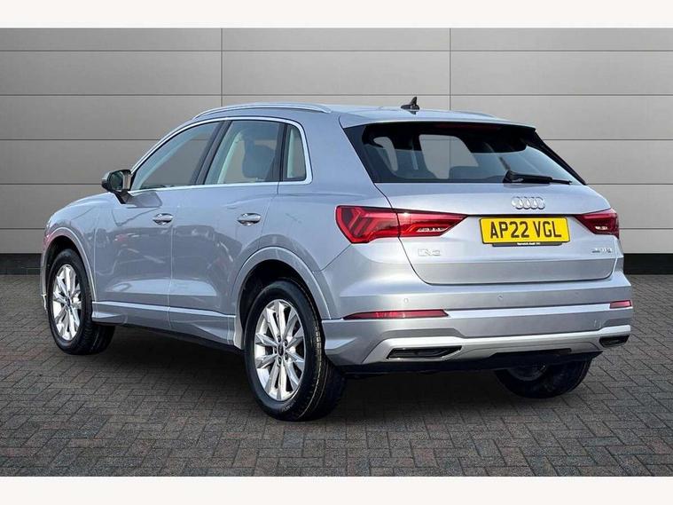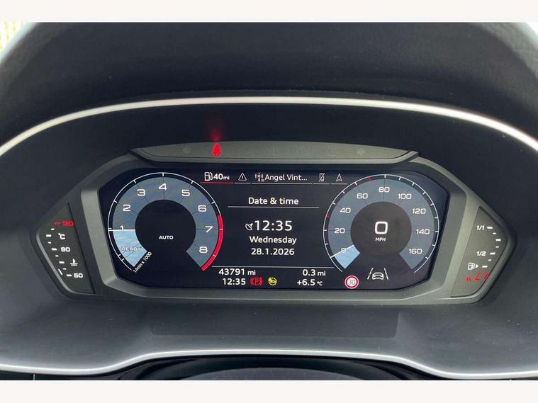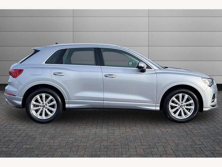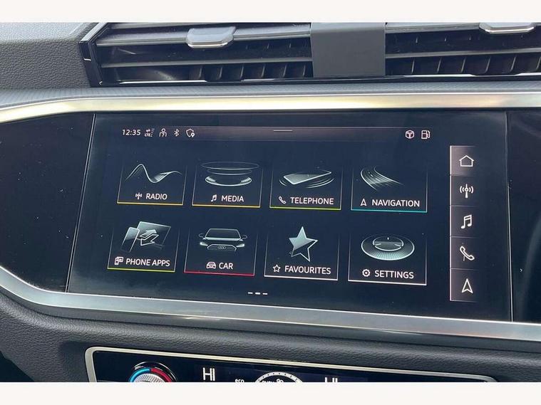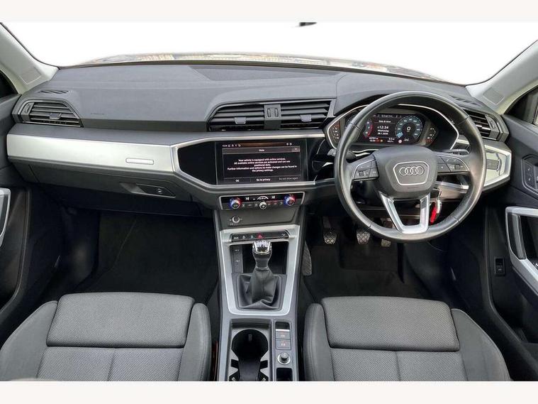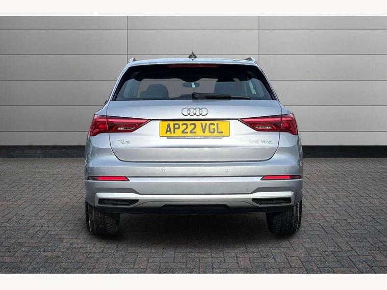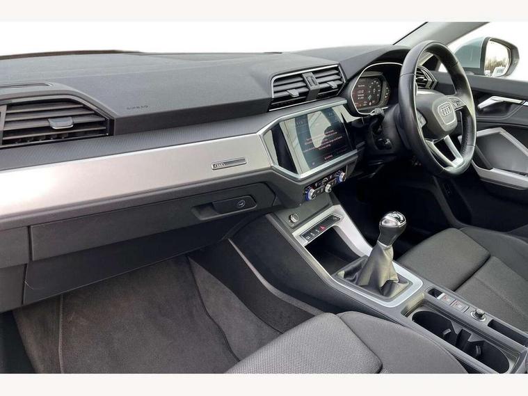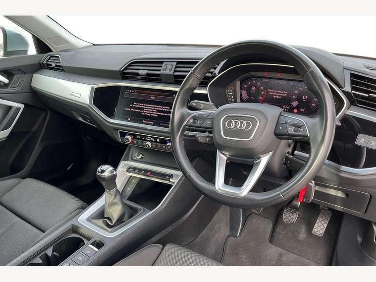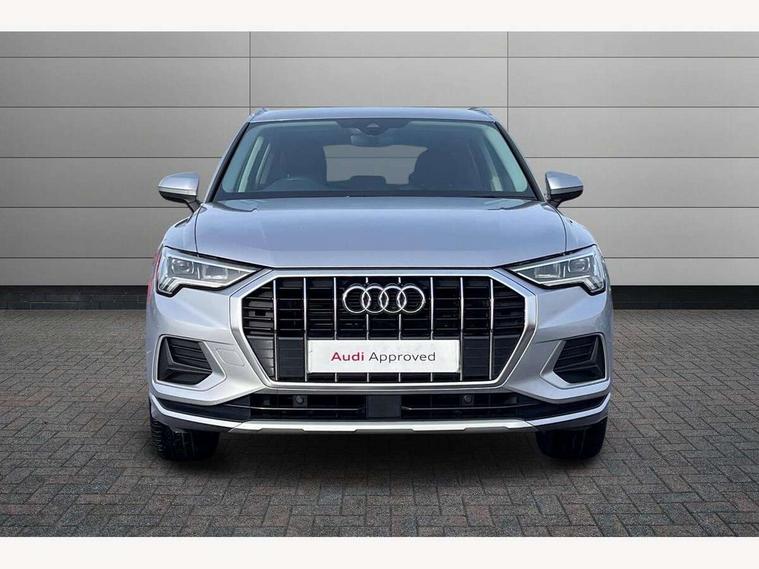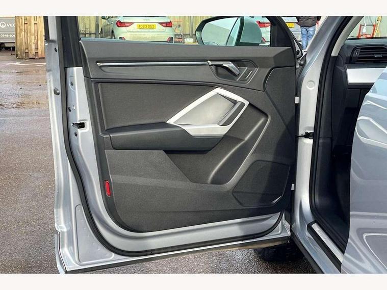 Amazon alexa Integration, Audi drive select, Audi lane departure warning, Audi Virtual Cockpit - 10.25" display, Bluetooth interface, Camera based traffic sign recognition, Cruise control + speed limiter, Legal emergency call, MMI Navigation Plus with high resolution 10.1 inch touchscreen colour display, Power operated tailgate, Progressive steering, Rear parking sensors, Service interval indicator, Smartphone interface includes wireless Apple carplay/Android Auto, Start stop system with recuperation, Voice control system with natural language interaction, Standard suspension, 2 USB-C ports with charge and data functions, 6 passive loudspeakers, DAB digital radio module, Acoustic windscreen, Aluminium roof rails, Aluminium window trim, Auto dimming frameless rear view mirror, Body coloured bumpers, Electrically folding, adjustable and heated door mirrors with integrated LED side indicators and kerb view function for passenger side, Front and rear electric windows, Front fog lights, Front side air inlets in matt selenite silver, Front spoiler in matt selenite silver, Grille vertical bars in aluminium silver/Matt, High gloss black finish B and C pillars, LED headlights with LED daytime running lights, LED rear lights, LED third brake light, Rain and light sensors, Rear diffuser strip in matt selenite silver, Rear side wing doors, Rear wiper, Titanium black radiator grille, Variable front intermittent wipers, 12V socket in rear centre console, 3 seat bench in 2nd row, 3 spoke multi-function leather steering wheel, 40:20:40 folding with manual adjustment for 60:40 forwards/backwards position and backrest angle, Door sill trims with aluminium inlay, Dual zone electronic climate control, Front and rear floor mats, Front and rear headrests, Front and rear roof module including reading lights, Front centre armrest, Glove compartment lighting, Height and reach adjustable steering wheel, ISOFIX child seat mounting for front passenger with airbag deactivation and outer rear seat including top tether attachment point for outer rear seats, Luggage compartment light, Lunar silver cloth headlining, Manual front seats with height adjustment, Single front passenger seat, Stainless steel luggage compartment sill finisher, Non smoking pack - Q3, 3x3 point rear seatbelts, 6 airbags - Driver, front passenger, curtain and side windows, Audi pre-sense front with pedestrain and cyclist recognition, Electromechanical parking brake, Electronic stabilisation control including ABS, ASR and EDL, Front seatbelt reminder, Hill descent control, Hill hold assist, Manual child lock in rear doors, Pre sense basic, Seatbelt monitoring, Tyre pressure warning, Warning triangle and first aid kit, Anti theft alarm, Anti theft wheel bolts, Immobiliser, Remote central locking, Detail dashboard around MMI touch colour display in glass look, black with surround in aluminium look, Micrometallic silver inlay,