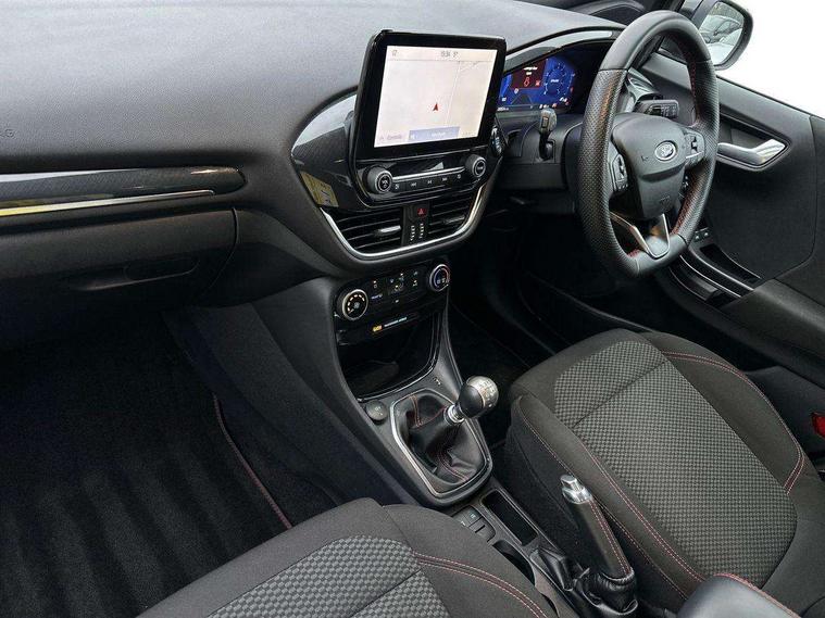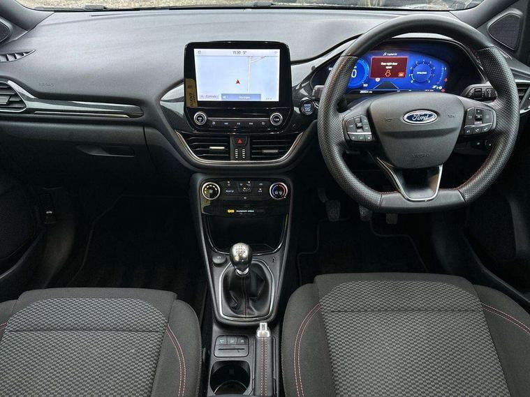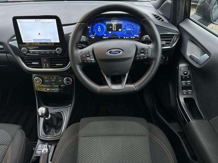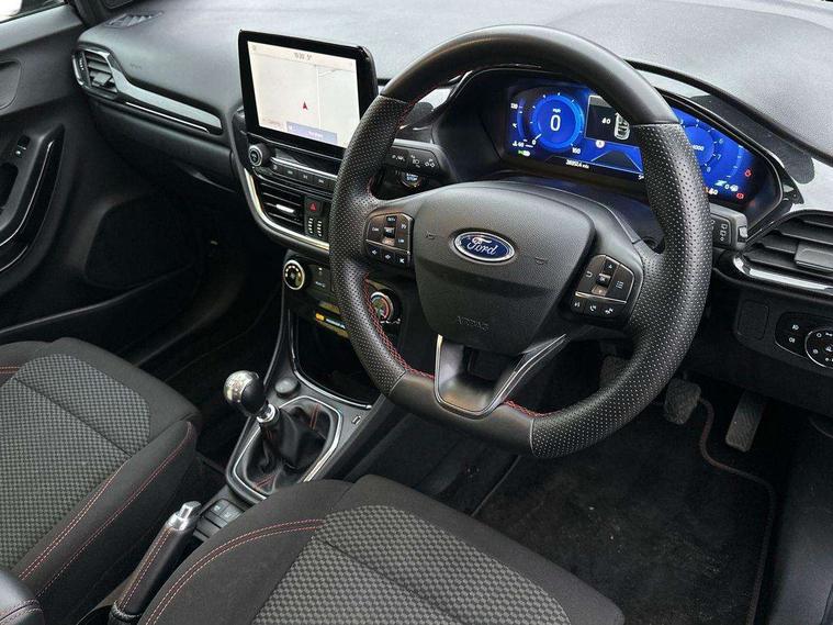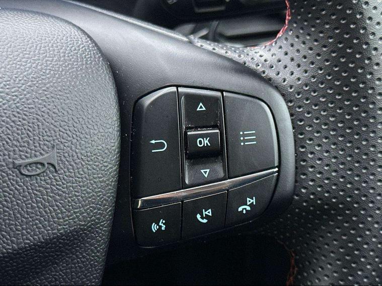 Driver impairment monitor, Emergency call service, Ford easy fuel, Full digital 12.3" instrument cluster, Lane keeping aid with lane departure warning, Power assist steering, Power start button, Rear parking sensor, Selectable drive modes(Normal, Eco, Sport, Slippery and Trail), Speed sign recognition, Sport suspension, Automatic headlights with auto high beam, Automatic rain sensing wipers, LED rear lamps, Power foldable heated door mirrors with puddle lamps, Projector headlamps with LED day time running lights and front fog lamps, Quickclear heated windscreen, Rear side wing doors, Rear wiper, ST-Line body styling kit with unique grille, Third brake light, 3 seat bench in 2nd row, Centre console with armrest and stowage, Ford megabox extended bootspace, Front and rear head restraints, Front floor mats, Manual 2 way passenger seat adjustment, Manual 4 way driver seat adjust with lumbar adjustment, Single front passenger seat, ST- Line cloth trim with red stitching, ST-Line flat bottomed sensico leather steering wheel with leather handbrake and aluminium gear knob, Ford SYNC 3 navigation pack - Puma, 3 rear seatbelts, Child safety lock, Electronic stability control (ESC) and hill start assist, Pedestrian/cyclist detection & post-collision braking, Pre collision assist system, Tyre pressure monitoring system (TPMS), Thatcham alarm,