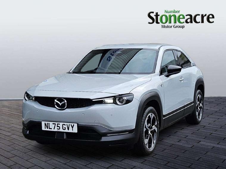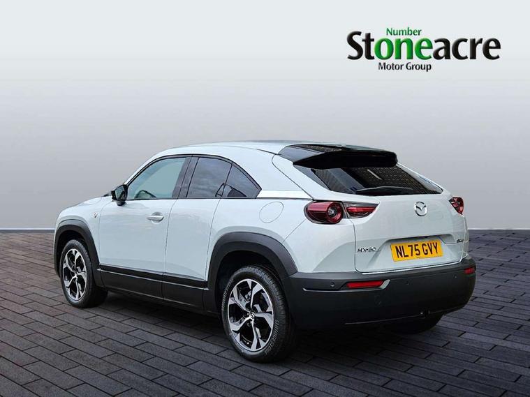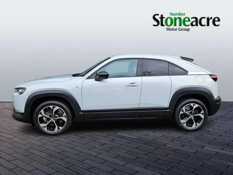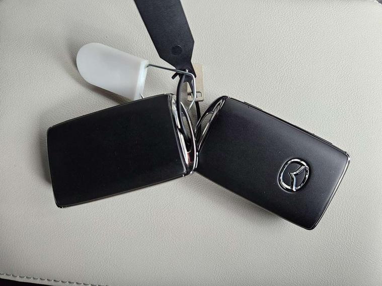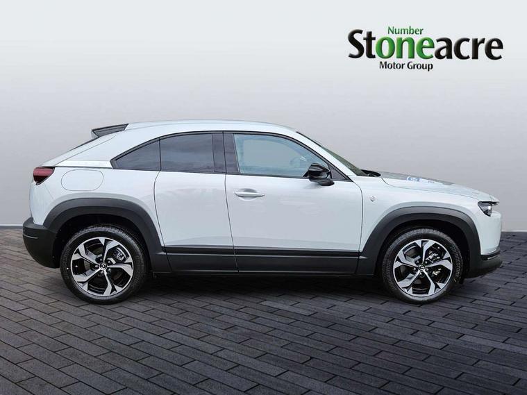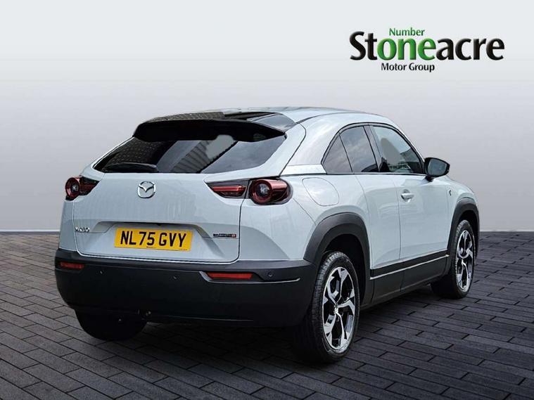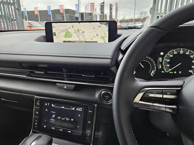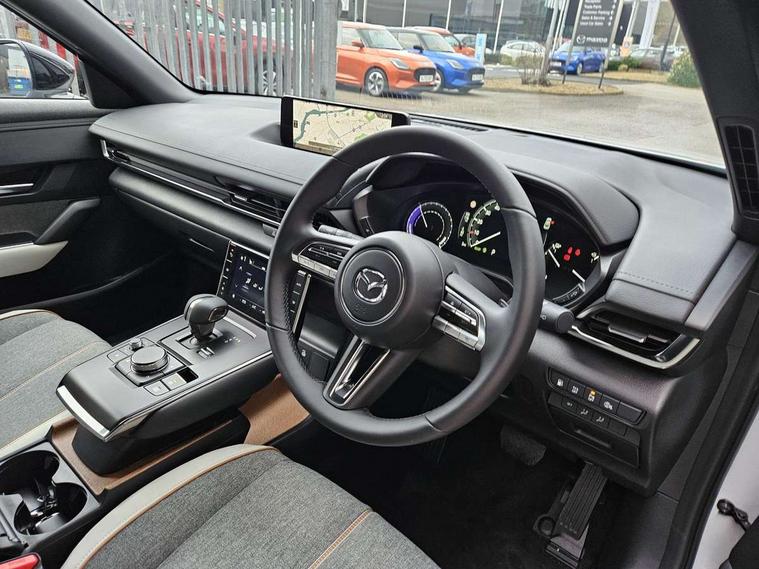 10.25" TFT colour centre display with Mazda Connect infotainment, 7" TFT Colour driver instrument panel display, Adaptive cruise control (Mazda radar cruise control) features stop and go, Apple car play/Android Auto, Blind spot monitoring with rear cross traffic alert, Drive mode switch, Driver attention alert system, E-call with GPS, Emergency lane keeping with blind spot assist and road keep assist, Emergency stop signalling system, Front and rear parking sensors, Integrated bluetooth, Integrated Mazda navigation system, Intelligent speed assist, Lane keep assist system (LAS) with Lane departure warning system (LDWS), PAS, Power start/stop button, Reversing camera, Service indicator, Trip computer, Windscreen projected colour active driving display (head up display) with traffic sign recognition, 11 kW triphase onboard charger, DC socket for rapid charging up to 40KW, Internal Combustion Engine Sound Emulator, Type 2 for mode 2 AC charging via 3-point plug, Type 2 for mode 3 AC charging via home or public charge points, 8 Speakers, DAB Digital radio, FM, Multimedia Commander including separate volume dial, Steering wheel mounted audio/bluetooth controls, Satin black - Lower bumper and wheel arch and side mouldings, Auto dimming driver's door mirror, Auto headlight levelling, B-pillar and C-pillar garnishes in gloss black finish, Black front grille, Body coloured bumpers, Coming/leaving home lights, Door mirrors with adjustable memory and tilt down function when in reverse, Dusk sensing headlights, Electric front windows with one touch auto up/down, Electrically adjustable door mirrors, Frameless auto dimming interior rear view mirror, Front, rain-sensing wipers with adjustable sensitivity and speed, Gloss black rear roof spoiler, Heated and auto power-folding door mirrors in black with integrated indicator lights, High beam control, Kodo turn signal, LED 3rd brake light, LED daytime running lights, LED Headlights, LED rear combination lights, Privacy glass (rear side windows and rear screen), Rear side wing doors, Rear wiper, Unique R-EV exterior badging, 12v electrical power outlet, 2x USB C and 12V Outlet, 3 seat bench in 2nd row, 60/40 split fold down rear seats, 8-way power adjustable driver seat with memory linked to door mirror and Active Driving Display, Black roof lining, Bright finish power button surround, Bright interior trim accents with steering wheel centre bezel, surround of engine start / stop button and glove box handle, Climate control air conditioning operated by the central 7" touchscreen control panel, Cloth/artificial leather upholstery, Door panel trim - cloth with artificial leather armrest and cork inserts around inner door handle, Driver and front passenger two rear grab handles with rear coat hooks, Driver, front passenger and two rear door pockets, Drivers and front passengers sun visors with vanity mirrors and driver's ticket holder, Front and rear LED lighting, Front centre armrest with storage and two cupholders, Front passenger seat manual slide, recline and height adjust, Heated front seats with 3 stage setting, Illuminated glovebox, ISOFIX child seat anchorage points attached on outer rear seats, Leather wrapped steering wheel and shift lever, Luggage compartment LED lighting, Mazda heritage cork accents on the console tray and cupholder lids, Power driver lumbar support, Rear centre armrest with two cup holders, Remote pre-heating/cooling, Roof mounted sunglasses holder, Seatback pocket at rear of the front passenger seat, Single front passenger seat, Steering wheel telescopic and tilt adjustment, Tonneau cover, Two front and three rear height-adjustable head restraints, 3 point ELR front seat belts x2 with pretensioners, 3x3 point rear seat belts, Anti-lock braking system (ABS), Collision avoidance braking, Driver central airbag, Drivers knee airbag, DSC - Dynamic Stability Control, Electric G-Vectoring control plus, Electronic parking brake with auto disengage function and auto hold function, Front and rear curtain airbags, Front dual stage driver and single stage front passenger airbags, Front passenger airbag cut-off switch, Front side airbags, Hill hold assist, Pre-crash safety system - Smart brake support (SBS) with turn-across traffic, Rear door child safety locks, Regenerative braking system (5 modes. Selected via paddle shift switches), Seatbelt reminder audible warning for driver, passenger and rear seats, Traction control system (TCS), Tyre pressure monitoring system (TPMS), Keyless Go, Remote central locking with deadlocking and automatic door lock when driving, Smart keyless entry, Thatcham accredited alarm and immobiliser, 18" Black diamond cut alloy wheels, Emergency tyre repair kit,