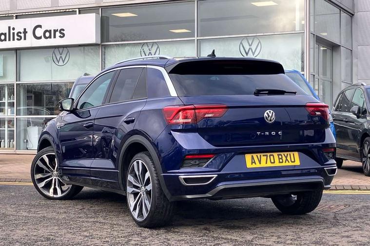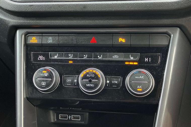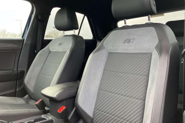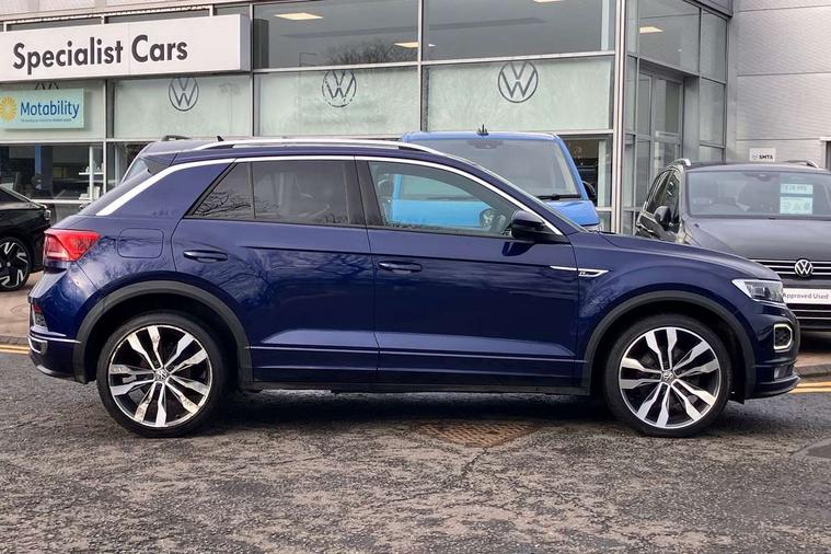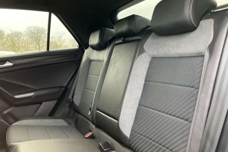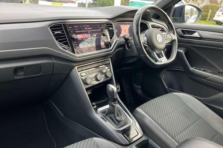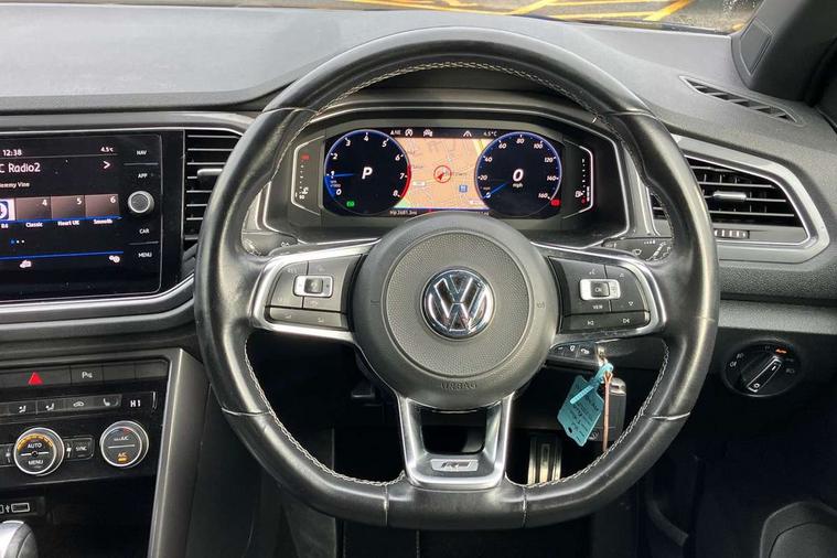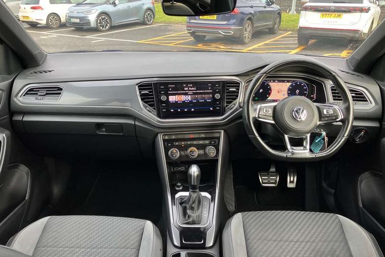 'Lights On' Reminder warning buzzer, Adaptive cruise control with front assist, radar sensor controlled distance monitoring, city emergency braking, Automatic start/stop system, Bluetooth telephone and audio connection for compatible devices, Car information display, Digital Cockpit Pro - Active info display, Discover navigation including 8" touch screen display, streaming and internet, Driver alert system with audible and visual fatigue detection system, Driver tips and journey analysis, Lane assist with warning text instrument cluster, Modified key software - reduce switch off time for key status change to Long no motion, Multifunction computer with visual gear change recommendation for fuel consumption, Service interval indicator, Think blue trainer driver tips and journey analysis, Voice activation, Wireless app connect for apple carPlay, Battery regeneration during braking, Centre arm rest including USB type C interface and USB charging socket, DAB Digital radio, Diversity antenna for FM reception, Front USB type C Interface 2X and USB charging socket, Music playback - MP3, WMA and AAC files, Premium USB cable in choice of either Apple or Android smartphone compatibility, SD card slot, Simultaneous pairing of 2 compatible mobile devices, SMS functionality - read, compose and send SMS messages using touch-screen display, Storage compartment with longitudinal and height adjustable in armrest and two rear air vents, Three route options - Fast, Short, Eco, Title and cover art display, Auto dimming interior rear view mirror, Black grained lower door protectors, Body colour door handles, Body colour rear roof spoiler, Chrome effect left and right trapezoid exhaust tailpipe fascia surround, Chrome trim on upper and lower radiator grille, Dusk sensor, Electrically foldable, adjustable and heated door mirrors with puddle lights and reverse activated kerb-view adjustment on passenger's door mirror, Front and rear electric windows, Front fog lights with static cornering function, Front windscreen wiper with intermittent wipe and 4 position delay, Fully galvanised body, Heated rear window, High level 3rd brake light, LED darkened rear light clusters, LED rear number plate lights, Manual coming/automatic leaving home lighting function, Rain sensor, Rear tinted glass from B-pillar backwards approx 65% tinted, Rear wash/wipe with intermittent wipe setting, Volkswagen roundel, 2 Front and rear reading lights incorporating LED technology, 3 rear head restraints, 4 load lashing points in luggage compartment, Aluminium pedals, Ambient lighting in front footwell and light strips below trim in front doors, Black roof lining and sun visors, Branded points of interest, Carbon flag cloth upholstery, Climate control - 2 zone electronic air conditioning with automatic air recirculation and allergy filter, Drawer under drivers seat, Front + rear carpet mats, Front cupholders x 2, Front seat back storage pockets, Front sports seats with R-Line logo on seat backrest, Glovebox, Height adjustable front seats, Height/reach adjust steering wheel, Illuminated vanity mirrors, Instrument lighting, white adjustable panel illumination, Interior light delay, Isofix easy fit child seat preparation for 2 outer rear seats, Load through provision with single cup holder when folded down, Luggage compartment cover, removable, Luggage compartment lighting, R Line badge, Split folding rear seat backrests with centre armrest, Storage compartment in left and right luggage area, Storage compartment in rear doors, Storage compartments in driver and front passenger doors, Three spoke multi function leather trimmed steering wheel and gear knob including paddle shift, Unique R Line door sill protectors, R line styling pack - T-Roc, 3 rear three point seatbelts, ABS, Curtain airbags, Driver and front passenger safety-optimised head restraints, Drivers and front passengers airbags with passengers deactivation switch, Drivers seatbelt reminder, Electronic parking brake with auto hold, Electronic stability control (ESC) includes ASR, EDL, EDTC and trailer stabilisation function, Front seat side impact airbags, Predictive pedestrian protection, Rigid safety cell with front and rear crumple zones, Three point height adjust front seatbelts + pretensioners, Tyre pressure loss indicator, Ventilated front and rear disc brakes, Volkswagen roadside assistance, Alarm with remote central locking and interior protection, Electronic engine immobiliser, Remote central locking with 2 remote folding keys, Shadow steel decorative inserts in dash and door panel, 19" Suzuka alloy wheels with low rolling resistance tyres and anti wheel bolts,