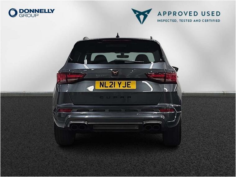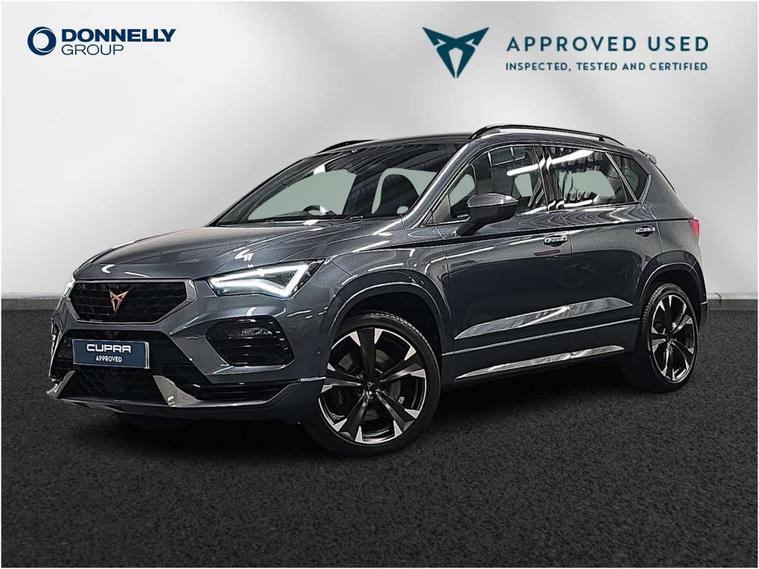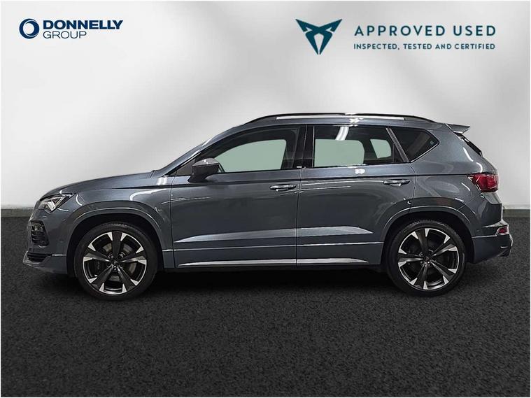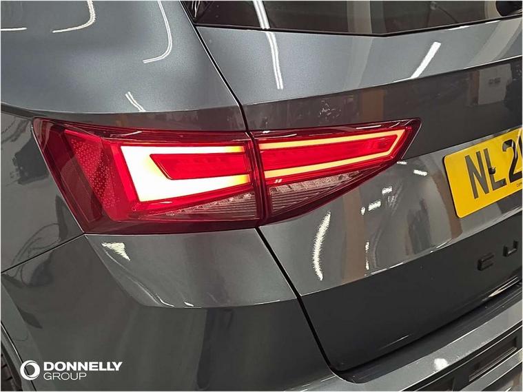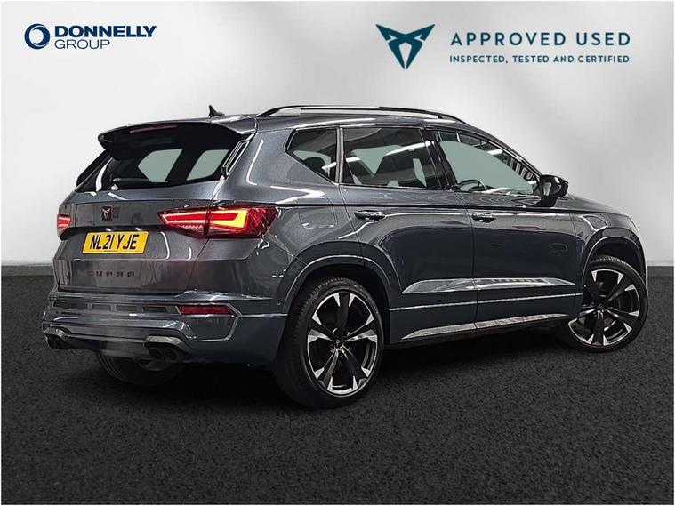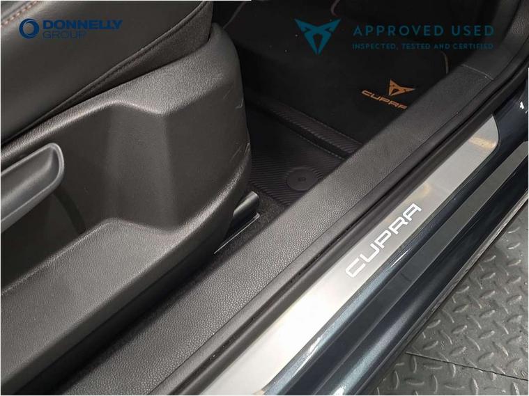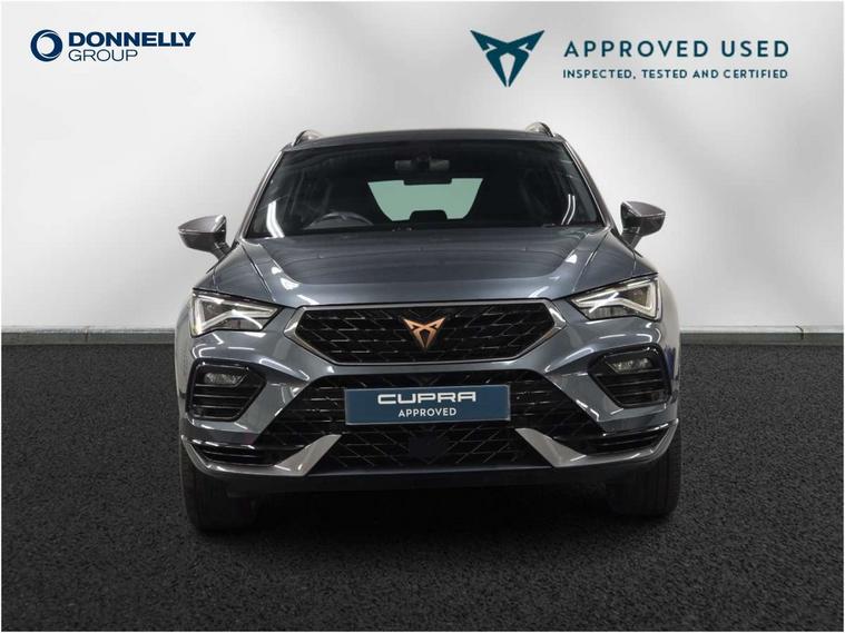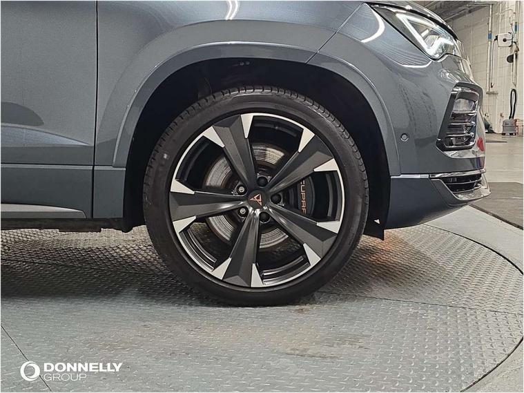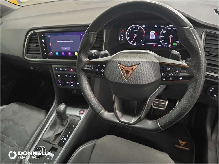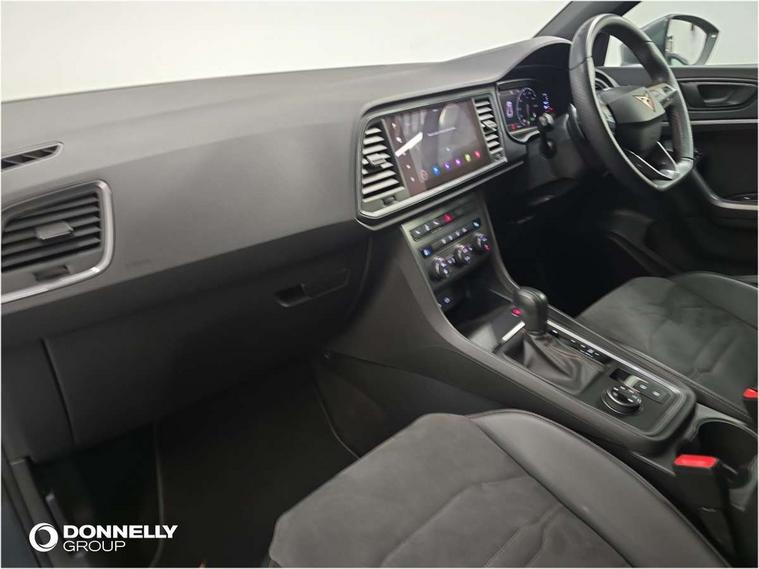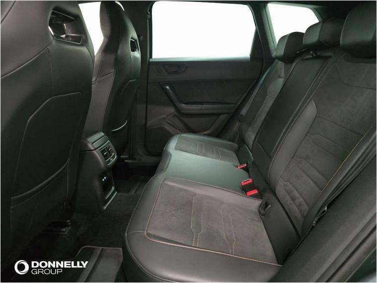 Cruise control system with speed limiter, CUPRA drive profile -Normal, Sport, CUPRA and Individual modes, steering/throttle response, gearshift mode, sound actuator and dynamic chassis control, Digital cockpit, Outside temperature gauge, Progressive power assisted steering, Rear view camera, Self parking functionality (includes front and rear parking sensors), Top view camera, Trip computer, Wireless full link smartphone integration, Wireless phone charger, CUPRA sport suspension, Beats audio system, Steering wheel mounted audio/phone controls, Body colour bumpers with dark aluminium diffusor, Body coloured wheel arch surrounds, Dark tinted rear windows, Daytime running lights, Door mirrors with welcome CUPRA light silhouette, Dynamic headlight range control with self adjusting whilst driving, Electric adjustable/heated/folding door mirrors, Front and rear electric windows, Front grille frame in chrome, Full LED headlamps with lens and LED front fog lamps with cornering function, Gloss black door mirrors, Gloss black roof rails, Gloss black side mouldings, Gloss black side window trim, Illuminated aluminium front door sill, LED rear tail lights with dynamic indicators, Rear fog lights, Rear spoiler, Rear wash/wipe, Specific CUPRA design front bumper, Visible twin black exhaust pipes in both sides with dark aluminium diffuser, 12V socket in front, 60/40 split folding rear seat, Aluminium pedals, Dual zone climate control, Front and rear head restraints, Front bucket seats in Alcantara upholstery, Front centre armrest, Front seat back storage pockets, Heated steering wheel, Height adjustable driver and passenger seat with lumbar adjustment, ISOFIX points in outer rear seats with top tether anchorage points, Leather steering wheel and gear knob, Multicoloured ambient lighting with LED interior illumination, Rear armrest and easy back seat release mechanism from boot, Steering wheel mounted gearshift paddles, Storage compartment in roof console for sunglass, Storage compartment under driver's seat, Convenience pack - Ateca, Interior lighting pack - Ateca, Navigation system plus pack with DAB - Ateca, 3x3 point rear seatbelts, ABS, Traction control system (TCS), Electronic stability control (ESC) and Electronic differential lock system (XDS), Airbags - Driver and front passenger airbag with deactivation, front side, two curtain and driver's knee airbags, Black brake callipers with CUPRA logo, Electric parking brake with auto hold function, Front and rear seatbelt reminder, Front assist with autonomous emergency braking, Hill hold control, Tiredness recognition system, Tyre pressure monitoring system, Alarm, Keyless entry, Locking wheel bolts,