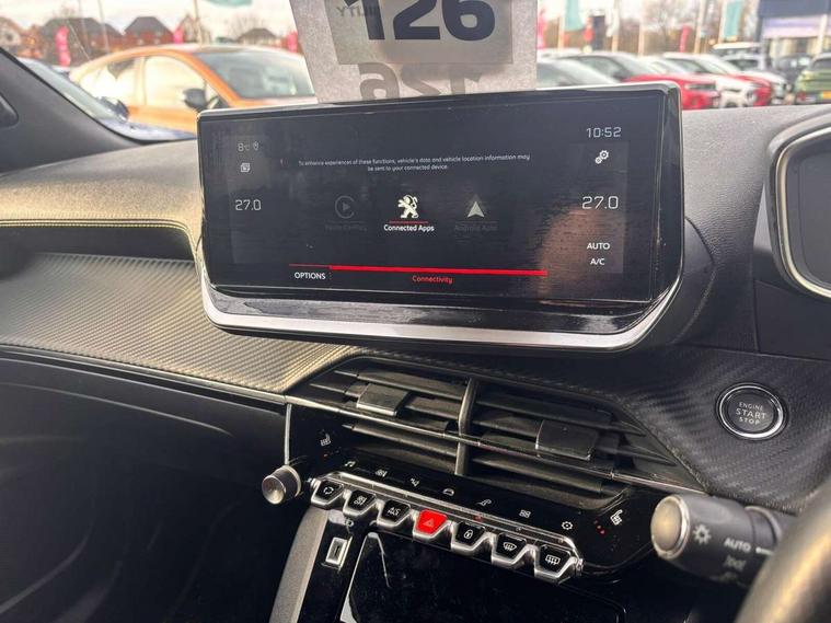 Blind spot monitoring, Bluetooth telephone facility, Connected 3D navigation, Driver attention warning, Exterior temperature indicator with ice warning, Lane keep assist, Mirror screen with mirror link, apple carplay and android auto, Multi function trip computer, PEUGEOT i-Cockpit with 10" capacitive colour touchscreen, PEUGEOT i-Cockpit with compact steering wheel, PEUGEOT i-Cockpit with configurable 3D headup instrument panel, PEUGEOT SOS and assistance, Smart phone docking station, Smartphone charging plate, Speed limit recognition and recommendation, Start/stop system, Visio Park 1 with 180 degree Colour reversing camera, 2 front USB socket with USB-C, 2 USB sockets in rear, DAB Radio (Digital Audio Broadcasting), Voice recognition for radio, navigation and telephony features, 2 X Rear number plate lights, Acoustic windscreen, Automatic front windscreen wipers, Automatic hazard light activation upon heavy brake application, Black diamond roof, Black front wing trim with gloss black detail and GT badging, Body coloured exterior door handles, Chrome exhaust tailpipe, Chrome Lion Badge front and rear, Dark tinted rear side and tailgate windows, Diamond black mirror shells, Diamond black rear spoiler (roof), Electric, heated, and power folding door mirrors, Frameless electrochrome interior rear view mirror, Front bumper - Silver lower trim, Full LED headlights with smartbeam assist, Gloss black finish on B pillar, Gloss black longitudinal roof rails, Gloss black rear cluster connecting strip, Gloss black roof bars, Gloss black window surround, GT model designation badging on tailgate, Headlights left on audible warning, LED daytime running lights with 3 claw headlight with distinctive tooth design, LED front fog lamps with remote cornering function, LED side indicator lights integrated into door mirrors, LED third brake light, Model designation badges front and rear, One touch electric front/rear windows with pinch protection, Radiator grille - Dark chrome chequered and gloss black edge trim, Radiator grille - gloss black top edge trim, Rear full LED 3D peugeot signature claw effect lights with daylight function, Rear reversing lights, Rear side wing doors, Rear windscreen wiper triggered automatically in reverse gear, Stainless steel door sill scuff plates, Tailgate with heated rear windscreen and wiper blade, Trailer Stability Programme, Variable front intermittent wipers, Welcome lighting, Wheel arch extensions, 1/3 to 2/3 split folding rear seats, 12v power outlet - front, 12V socket, 3 seat bench in 2nd row, 8 Colour personalisable ambient lighting, Aluminium pedals, Automatic air conditioning with pollen and active carbon filter, Central front armrest with storage compartment, Driver and front passenger sport seats, Electric power steering with reach and rake adjustable steering column, Front and rear carpet mats in black with lime green stitch detail, Front centre armrest, Front LED interior light with 2 reading spotlights and rear interior light with timer, Front passenger seat manual adjustment - height, longitudinal and back rest angle, Gear lever top - manual in full grain leather, Gear shift indicator, Heated front seats, High centre console, ISOFIX child seat mounting points on passenger seat, Lime green contrast stitching to front centre console, door panels and dashboard facia, Mistral full-grain perforated leather steering wheel with Lime Green stitch detail and satin chrome 'GT' emblem, Modular boot floor, Multifunction steering wheel, Piano keys: Gloss black and chrome toggle switches to access main functions of the vehicle and touchscreen functions, Roof lining - Mistral black, Seatbelt unfastened on the move audible and visual alert for front and rear seats, Single front passenger seat, Switch for Push Button Start finished in black with chrome surround, Visibility pack - 2008, 2x 2nd row ISOFIX child seat mountings, ABS (Anti-lock Braking System) with EBD (Electronic Brakeforce Distribution) and EBA (Emergency Braking Assistance), Acoustic vehicle alerting system, Active safety brake with night function/cyclists/pedestrians, Adaptive driver and front passenger airbags with passenger airbag deactivation function, Child locking functionality on rear doors, Driver/front passenger side airbags, Electric parking brake, ESP (Electronic Stability Program) + Hill Start Assist, Front and rear curtain airbags, Front and rear disc brakes, Front and rear three-point retractable seatbelts, with force limiters, Front optimised safety headrests and rear retractable headrests (x3), height adjustable, Tyre pressure sensor, Alarm system with anti-lift sensor, Automatic door locking when moving off, Deadlocks, Electronic code immobiliser, Exterior door lock x1 (Left-hand or passenger’s side), Remote central locking, Carbon effect Dashboard, front and rear door panel finish, 17" Salamanca diamond cut alloy wheels,