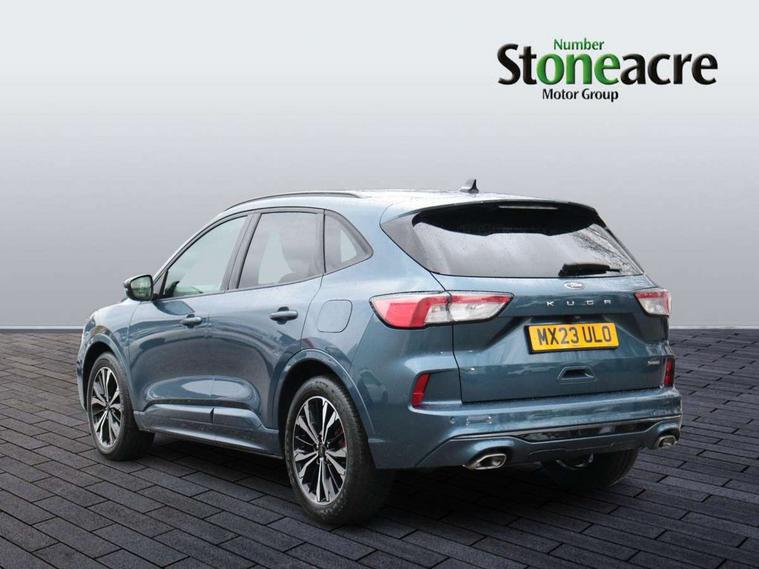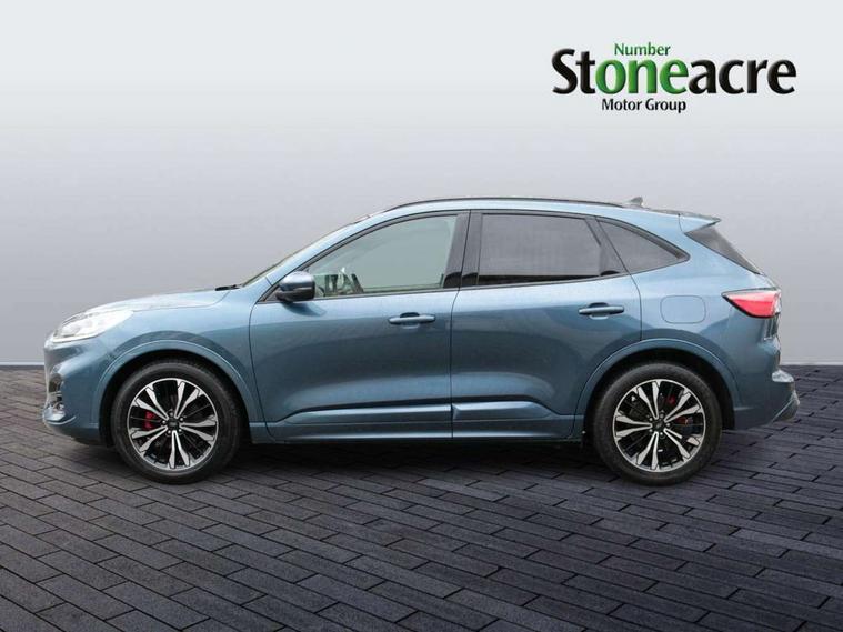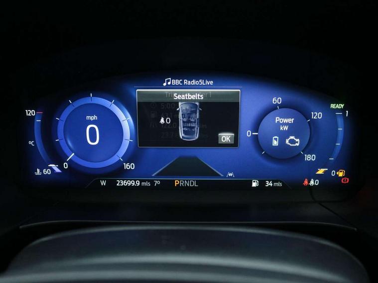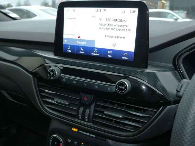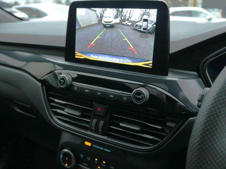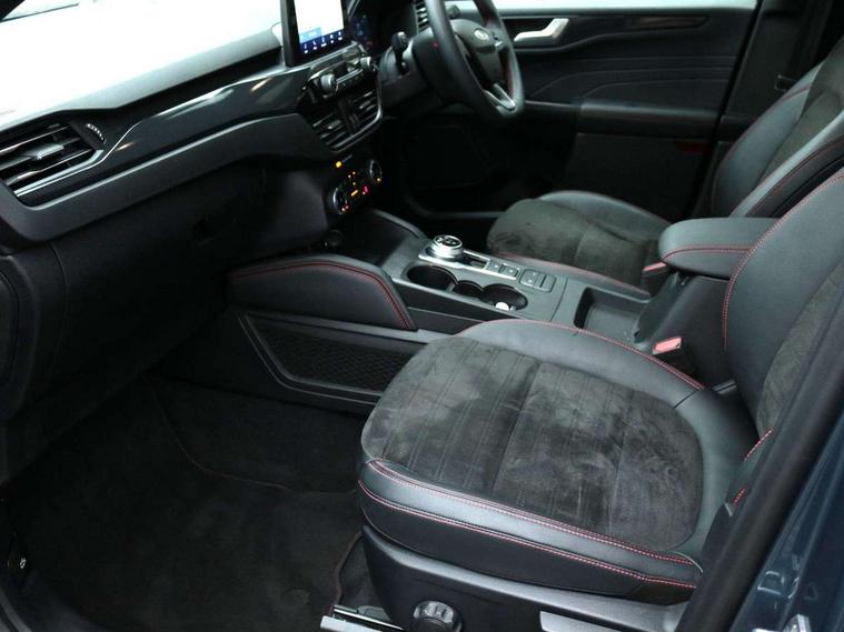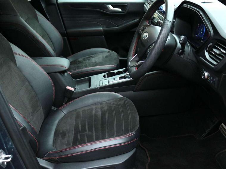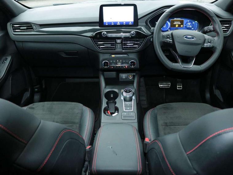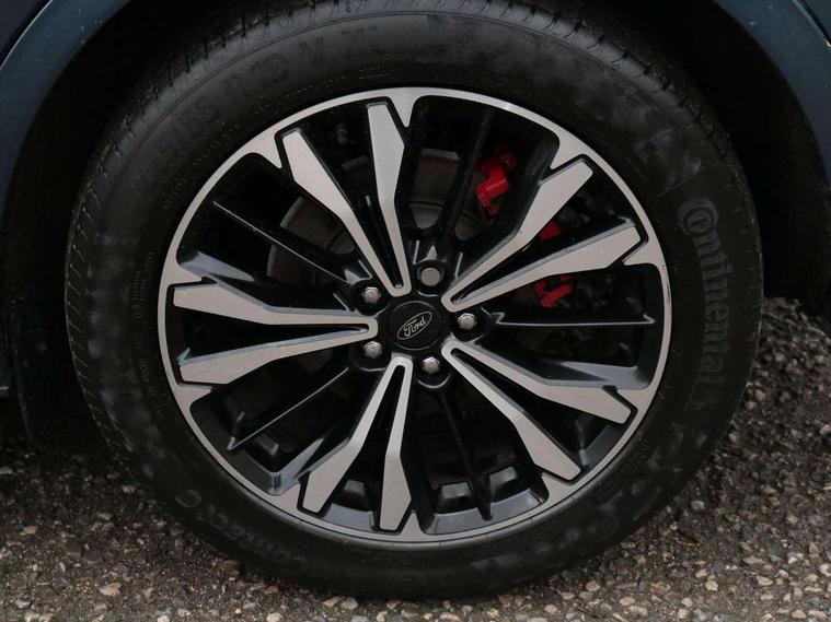 12.3" digital colour instrument cluster, Ford easy fuel, Ford SYNC 3 with 8" TFT LCD touchscreen, App Link, andriod auto/apple carPlay, emergency assistance and navigation with Ford pass connect, Front and rear parking sensors, Hands free power tailgate, Lane keeping aid with lane departure warning, Power assist steering, Rear view camera, Selectable drive modes, Service interval indicator, Sports suspension, Twist beam rear suspension, B&O premium audio system with 10 speakers and subwoofer, 2 USB ports, DAB radio/CD, Auto headlamps with high and low beam, Black roof rails, Day/night rear view mirror, Front LED fog lamps, Large rear spoiler, LED daytime running lights, LED rear lights, Power folding heated door mirrors with puddle lights, Power front/rear windows with global close, Power opening panoramic roof, Privacy glass, Quickclear heated windscreen, Rear side wing doors, Rear wiper, ST Line body styling kit with unique front and rear fascia and bumper, rear painted diffuser, front painted skid plates, dark mesh upper grille, ST Line front scuff plates, Third brake light, Twin exhausts, 10 way power adjustable drivers seat, 2nd row sliding seats with 60:40 split, 8 way manual passenger seat including lumbar support and height adjust, Alloy pedals, Centre console with electronic parking brake, Dark headlining and pillars, Electronic automatic temperature control (EATC), Flat bottomed leather steering wheel in sensico with red stitching, Front and rear head restraints, Heated passenger and driver seats, Heated rear seats, Heated steering wheel, Partial premium touch sensico leather upholstery with black cloth inserts and red stitching, Rear charging point, Single front passenger seat, Sports seats, ST Line front and rear floor mats, 3x3 point rear seatbelts, Airbags - front driver/passenger, front and rear curtain, Drivers knee airbag, Electronic stability control (ESC) and ABS, Ford MyKey Gen 2 safety system, Manual child proof rear door locks, Post collision braking, Pre collision assist with autonomous emergency braking, Rear seat Occupancy alert, Red brake calipers, Tyre pressure monitoring system, Engine immobiliser, Keyless entry and Ford power start button (Keyless start), Locking wheel nuts, Remote powered central double locking doors, Thatcham category 1 alarm,