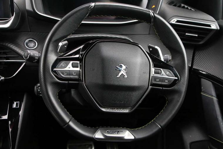 Bluetooth telephone facility, Driver attention warning, Exterior temperature indicator with ice warning, Front and rear parking sensors, Mirror screen with mirror link, apple carplay and android auto, Multi function trip computer, PEUGEOT i-Cockpit with compact steering wheel, PEUGEOT i-Cockpit with configurable 3D headup instrument panel, PEUGEOT SOS and assistance, Push button start, Smart phone docking station, Smartphone charging plate, Speed limit recognition and recommendation, Visio Park 1 with 180 degree Colour reversing camera, 2 front USB socket with USB-C, 2x USB sockets in rear, 6 speakers radio with mp3 compatible, DAB Digital radio, Voice recognition for radio, navigation and telephony features, 2 X Rear number plate lights, Automatic hazard light activation upon heavy brake application, Automatic lights, Automatic windscreen wipers, Body coloured exterior door handles, Dark tinted rear side and tailgate windows, Diamond Black roof, Electric front windows + one touch + anti-pinch, Electric rear windows with one touch/anti-pinch, Electrically adjustable, heated and power folding door mirrors, Extended diamond black rear spoiler, Follow me home headlights, Frameless electrochrome interior rear view mirror, Front windscreen wiper with magic wash cleaning system, Full LED headlights with smartbeam assist, Gloss black finish on B pillar, Gloss black rear cluster connecting strip, Gloss black wheel arch extensions, Gloss black window surround, GT Line model designation badging on C pillar, GT Line model designation badging on tailgate, Headlights left on audible warning, LED daytime running lights with 3 claw headlight with distinctive tooth design, LED side indicator lights integrated into door mirrors, Model designation badges front and rear, Nera black door mirror shells, Radiator grille - Dark chrome chequered and gloss black edge trim, Rear bumper with gloss black finish, Rear full LED 3D peugeot signature claw effect lights with daylight function, Rear lower bumper diffuser effect trim in gloss black, Rear reversing lights, Rear windscreen wiper triggered automatically in reverse gear, Stainless steel door sill scuff plates, Tailgate with heated rear windscreen and wiper blade, Twin chrome exhaust tailpipes, 1/3 to 2/3 split folding rear seats, 12V socket, 8 Colour personalisable ambient lighting, Aluminium pedals and foot rest, Automatic gear lever in full grain leather and satin chrome, Driver and front passenger seat manual adjustment in longitudinal and back rest angle, Driver and front passenger seat mechanical height adjustment, Driver and front passenger sport seats, Dual zone electronic climate control, Electric power steering with reach and rake adjustable steering column, Front and rear carpet mats in black with lime green stitch detail, Front centre armrest with storage compartment, Front LED interior light with 2 reading spotlights and rear interior light with timer, High centre console with 2 cup holders, ISOFIX child seat mounting points on passenger seat, Lime green contrast stitching to armrest, front centre console, door panels and dashboard facia, Map pockets on the backs of the front seats, Mistral full grain perforated leather steering wheel with aikinite stitch detail and satin chrome 'GT' emblem, Piano keys gloss black plated toggle switches to access main functions of the vehicle, Roof lining - Mistral black, Seatbelt unfastened on the move audible and visual alert for front and rear seats, 2x 2nd row ISOFIX child seat mountings, 3 point seatbelts on all rear seats, ABS (Anti-lock Braking System) with EBD (Electronic Brakeforce Distribution) and EBA (Emergency Braking Assistance), Active safety brake with night function/cyclists/pedestrians, Child locking functionality on rear doors, Driver and passenger airbags with Passenger airbag deactivation system, Driver/front passenger side airbags, Electric parking brake, ESP with Hill Assist, Front and rear curtain airbags, Front and rear disc brakes, Front optimised safety headrests and 3 x rear retractable headrests with height adjustable, Front three point retractable seatbelts with force limiters, Tyre pressure sensor, Automatic door locking when moving off, Deadlock, Electronic code immobiliser, Thatcham Cat.1 alarm, Carbon effect Dashboard, front and rear door panel finish, 17" Camden diamond cut two tone alloy wheels, Space saver spare wheel,