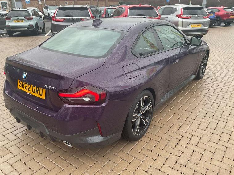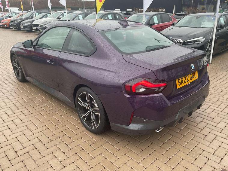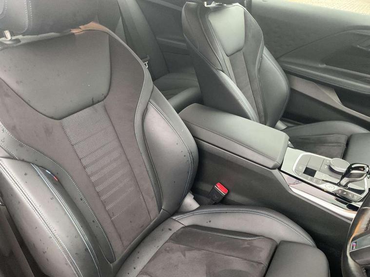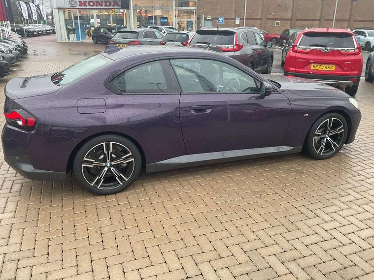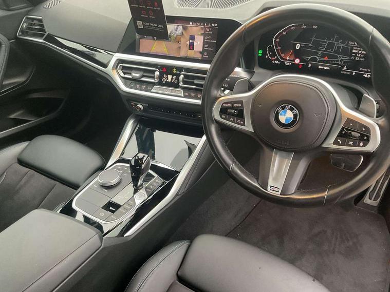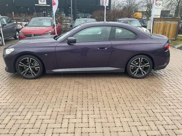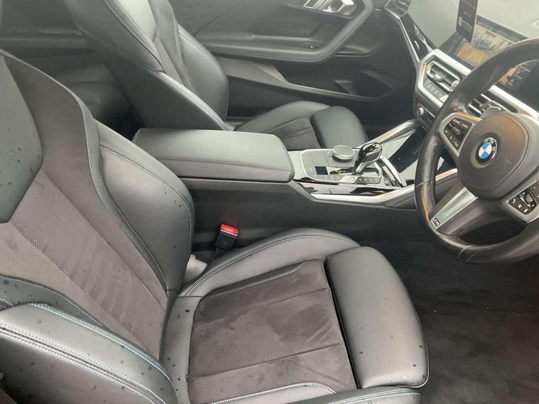 Attentiveness assist, Auto start-stop, Bluetooth, BMW ConnectedDrive online services, BMW Teleservices, Check Control warning system for monitoring of lights and door/luggage compartment open warning, Direct selection buttons, Drive off assistant, Eco pro mode, Electric power steering, Front/rear Parking distance control, iDrive controller with turn and press function, Integrated owners handbook, Intelligent functions, Live cockpit plus with nav function 12.3" instrument cluster and 14.9" centre display, Oil sensor for level and grade, Optimum shift indicator, Personal Profile, Touch operation on control display, Variable sport steering, Widescreen multi-media display, Aluminium lightweight construction, Balancer shaft, BMW TwinPower Turbo four-cylinder petrol engine, Double VANOS, Drive performance control with ECO PRO comfort + sport mode, Electronic differential lock, High precision injection, M sport suspension, Petrol Particulate Filter, Sport automatic steptronic transmission with gearshift paddles, manual gearshift time display, launch control, coasting idle ECO PRO/COMFORT modes, Twin scroll turbocharger with Valvetronic, DAB tuner, Acoustic windscreen wipers for reduced driving noise, Adaptive LED Headlights, Automatic windscreen wipers and automatic headlight, Automatically dimming rear view mirror, Body colour door handles flush with door surface, Body colour door mirrors, Body colour front and rear bumpers, Daytime running lights, Electric windows - front and rear, with open/close fingertip control and trap release, Exhaust tailpipes x2 - 90mm in left and right, Fading support, Front and rear bumper system with replaceable deformation elements, Front door sill finishers in black plastic with BMW designation, Front windscreen wipers with integrated washer jets, Green tinted heat protection glazing, High beam assistant, High gloss shadowline exterior trim in mirror triangle cover, mirror cover panel, mirror bezel and window border, High level third brake light, Indicators integrated int mirror housing, LED registration plate light, LED technology rear tail lights, brake lights and turn indicators, Lightweight engineering, Model designation on right side of tailgate, One piece kidney grille with hight gloss chrome surround, Rear boot, Rear fog lights, Reversing light in rear light cluster, Shark fin antenna, Single part LED rear lights with smoked glass components, Trailer stabilisation logic, Visible VIN plate, 12V power socket in front centre console with blanking plug, 2 cupholders in front centre console, 3 zone automatic air conditioning, Ambient lighting, Compartment in front of cupholder, Conditioned based service, Driver seat backrest width adjustment, Front and rear side armrests integrated into door trim, Front armrest, Front door pockets, Front head restraints, Front sport seats, Heated front seats, Illuminated glove compartment with separate small compartment, M headliner Anthracite, M sport leather steering wheel, Manually adjustment steering wheel column, Rear seat backrest with manual 40:20:40 split folding, Rear seat centre foldable armrest with integrated cup holder, Single front passenger seat, Storage compartment between rear seats, Storage tray and compartment with cover in centre console, Sun visors with vanity mirrors and insert tab, Through loading system with 40/20/40 split folding 2 rear seat in 2nd row, Two folding rear seat headrests, Velour floor mats, Additional storage compartment pack without USB - 2 Series Coupe, Connected pack professional - 2 Series Coupe, Interior and exterior mirror pack - 2 Series Coupe, M Sport exterior styling aerodynamics pack - 2 Series Coupe, 2 tone horn, Anti lock braking system (ABS) with cornering brake control, Automatic Stability Control (ASC), BMW emergency call, Brake drying, Child seat ISOFIX attachment for the two outer rear seats, Crash sensor activating of airbags, Unlocking doors, hazard warning lights, interior light, safety battery terminal, Deactivation of fuel pump in the event of a crash, Driver and front passenger airbags, Driver and front passenger side airbags, integrated in the door side seat backrest bolsters for all seat variants, Dynamic brake control, Dynamic stability control + (DSC+), Dynamic Traction Control - DTC, Electrically operated hand brake including automatic hold function and automatic release when driving off, Front and rear disc brakes, Front passenger airbag deactivation, Head airbags for all 4 outer seats, Manual deactivation of front passenger airbag, Seat belt security check for driver and front passenger, Seatbelt warning, Side impact protection, Three point seat belts on 4 seats including front belt stopper, pyrotechnic belt tensioners and belt force limiters, Tyre pressure sensor, Warning triangle and first aid kit, Alarm system (Thatcham 1) with remote control and electronic engine immobiliser, Central locking switch for all doors, fuel filler cap and luggage compartment, Deadlocking function system to all doors, Drive away locking system on all doors and luggage compartment, Locking wheel bolts, Start/Stop button (illuminated) in centre console with keyless engine start and Auto Start-Stop deactivation button, Two remote control key with integrated key - one button for open and close doors/fuel flap/tailgate and separate button for unlock luggage compartment, BMW mobility tyre sealing system, Electrically powered 12V compressor, Reduced rolling resistance tyres,