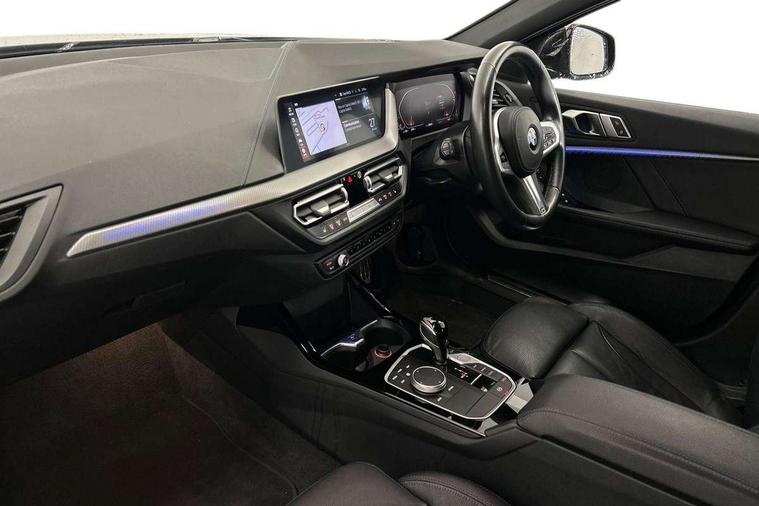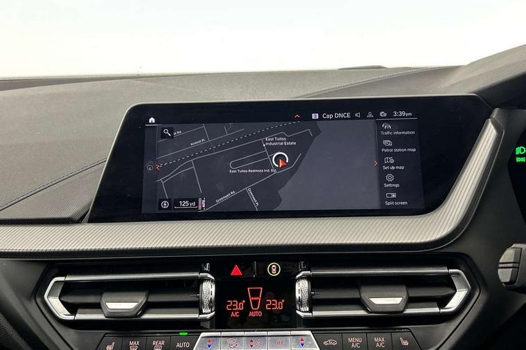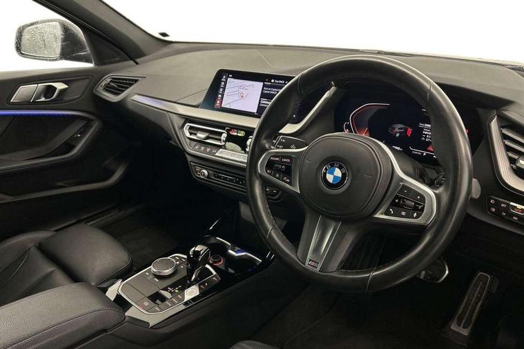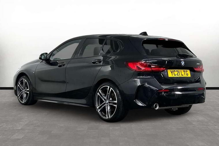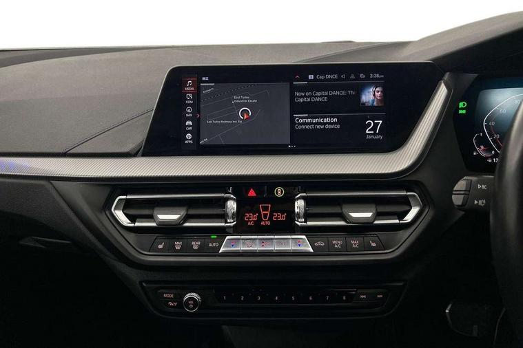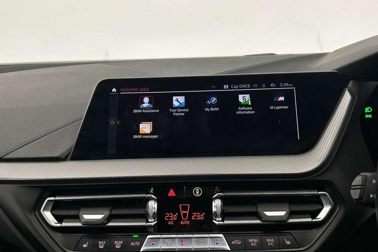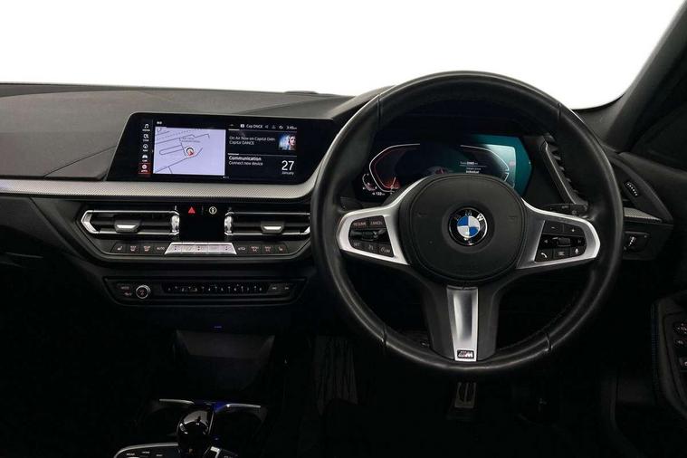 Active guard plus, Attentiveness assist, BMW Online services, BMW Teleservices, Check Control warning system for monitoring of lights and door/luggage compartment open warning, Connected eDrive Services, Eco pro mode, Integrated owners handbook, Oil sensor for level and grade, On board computer, Optimum shift indicator, Personal Profile, Pull away assistant, Speed limiter, Aluminium lightweight construction, Anti roll bar front and rear, Balancer shaft, Double VANOS, Drive Performance Control, Electronic differential lock, High precision injection, M sport suspension, Petrol Particulate Filter, VALVETRONIC engine management, Bluetooth audio streaming, DAB Digital radio, Auto dimming rear view mirror, Automatic headlight beam throw control, Automatic windscreen wipers and automatic headlight, Body colour door handles, Body colour mirror caps, Chrome 'M' logo side designation, Chrome exhaust tailpipe in single, round (Exhaust tailpipe, stainless steel - single, round), Chrome kidney grille frame with Satin Aluminium struts, Direction indicator side lights in exterior mirrors, Electric folding and anti dazzle exterior mirrors, Fading support, Follow me home headlights, Front and rear bumper system with replaceable deformation elements, Front and rear electric windows with open and close fingertip control, anti trap facility and comfort closing, Front door sill finishers in black plastic with M designation in metallic look, Green tinted heat protection glazing, Heated, electrically adjustable exterior mirror aspheric on driver side, convex on passenger side, High gloss shadowline window frame, Recess cover mirror frames and B/C pillar embelisher trim, High level third brake light, LED daytime running lights, LED eyebrow turn indicators, LED front fog lights, Lightweight engineering, Matt black air guide grilles, Model designation on right side of tailgate, Nearside reverse light in rear light cluster, Preparation for high beam assistant, Rain sensor including auto headlights activation, Rear fog lights, Rear window wiper, Shark fin antenna, Visible VIN plate, Welcome lighting, 12V power socket in centre console, 3 rear seat head restraints, 3 spoke M sports design leather steering wheel finished in nappa leather with specific M badge, Anthracite headlining, Anthracite Velour floor mats, Child seat ISOFIX attachment for two outer rear seats and front passenger seat with anchorage points, Conditioned based service, Dakota leather upholstery with perforation and contrast stitching, Driver and front passenger seat heating, Folding rear clothes hook, Four grab handles integrated in roof lining, Front and rear door pockets, Front and rear door pockets with bottle holders, Front and rear side armrest integrated into door trim, Front armrest foldable with integrated storage compartment, Front sports seats with electric side bolster adjustment, Glove compartment, Height adjustable front head restraints, Manual adjust steering wheel, Multi-function controls for steering wheel, Storage compartment in centre console, Sun visors with vanity mirrors and insert tab, Two zone automatic air conditioning, Additional interior lighting pack - 1 Series, Connected pack professional - 1 Series, Extended storage pack - 1 Series, Interior lights pack - 1 Series, Luggage compartment pack - 1 Series, M Sport exterior styling aerodynamics pack - 1 Series, 2 tone horn, 3 point seatbelts on all seats, front pyrotechnic belt tensioners, stopper and belt force limiters, rear coded belt buckles, Airbags - front driver/passenger, front & rear curtain, front side, Anti lock braking system (ABS) with brake assist, BMW emergency call, Brake drying, Braking readiness, Crash sensor activating central locking release, hazard warning lights, fuel cut off, interior lighting + activation of safety battery terminal clamp, Driver and front passenger seat belt security check, Dynamic stability control + (DSC+), Dynamic Traction Control - DTC, Electrically operated hand brake, Front and rear disc brakes, Front passenger manual airbag deactivation, Seatbelt warning, Side impact protection, Tyre pressure monitoring system, Warning triangle and first aid kit, Automatic drive away locking facility, Central locking switch for all doors, fuel filler cap and luggage compartment, Deadlocking function system to all doors, Locking wheel bolts, Remote control with integrated key with High-gloss Black inlay and M designation and 1 button for open/ close lock, window, open luggage compartment, Start/stop button with comfort go keyless engine start and auto start stop deactivation button, Thatcham Cat.1 alarm and immobiliser, Contrast stitching on instrument panel, Reduced rolling resistance tyres,