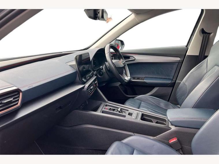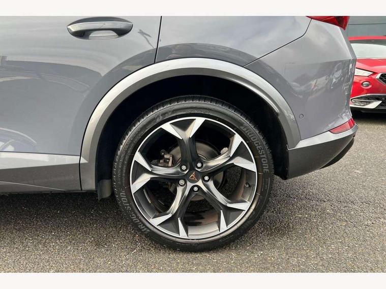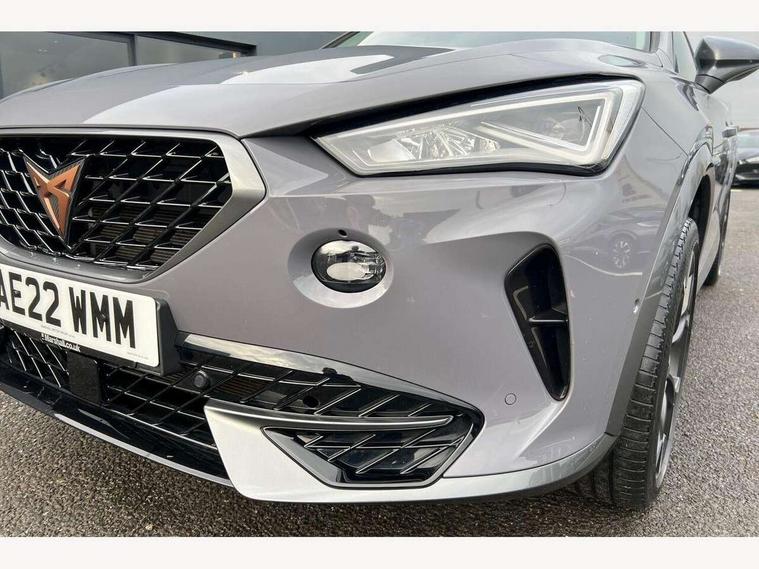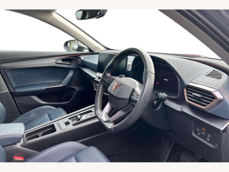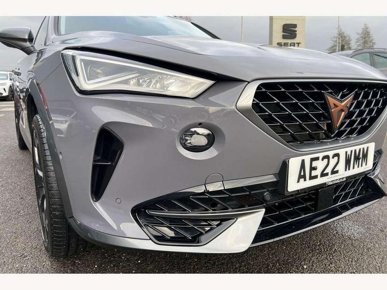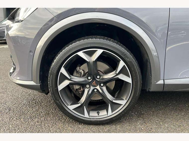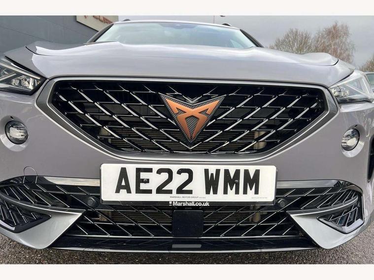 Digital cockpit and configurable dashboard, Driver alert system, Driving profile selection, E-call, Forward collision warning with automatic braking, Lane assist, Park assist (inc front/rear parking sensors), PAS, Predictive adaptive cruise control with speed limiter, Rear view camera, RPM, trip computer, outside temp gauge, instrument light brightness, low fuel warning light, lights on reminder, gearshift indicator, Service interval indicator, Start/stop system with regenerative braking, Wireless apple carplay, Wireless phone charger, Electronic locking differential and dynamic traction support, Standard suspension, 2 front and 2 rear USB type C sockets, Auxiliary input socket, DAB radio, Auto dimming rear view mirror, Body colour door handles, Body coloured bumpers, Dark grey wing mirror, Daytime running light with automatic headlight control and coming home feature, Dynamic headlight range control, Electric front/rear windows, Electrically adjustable heated and folding door mirrors with memory function, Front fog lamps with cornering function, Gloss black roof rails and window surrounds, LED Headlights, LED Taillights with dynamic indicator, Rain sensing wipers, Rear diffuser with black simulated exhaust pipes, Rear side wing doors, Rear wash/wipe, Third brake light, Tinted rear windows, Welcome lights, 12v power supply in centre console, 12V socket, 12v socket in loadspace, 2 front and 2 rear reading lights, 230V socket, 3 seat bench in 2nd row, 60/40 split rear bench seat with armrest and mechanical seat release, Dust/pollen filter, Front and rear head restraints, Front centre armrest, Height/reach adjust steering wheel, Illuminated interior front door sills, Illuminated sunvisor with mirror, Isofix, Leather multi function heated steering wheel with gear shift paddles, Luggage tie-down hooks, Single front passenger seat, Three zone climate control with control panel in rear, Variable luggage/load compartment floor, Wraparound lighting, Genuine Nappa leather Pack - Cupra, Navigation system pack with 10" navigation system - Formentor, 3 point seatbelts on all rear seats, ABS, Brake control system - ESC and brake booster, Child proof door locks, Driver and front passenger airbags with front passenger airbag de-activation, Electronic parking brake, Front and rear disc brakes, Front side curtain airbags, Hill hold control, Seat belt reminder for front and rear seats, Tyre pressure monitoring system, Anti theft alarm system, Keyless entry and start system (KESSY), Locking wheel bolts, Copper and aluminium interior detailing, 19" 'Exclusive' machined sport matte black and silver alloy wheels,