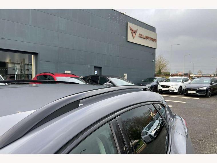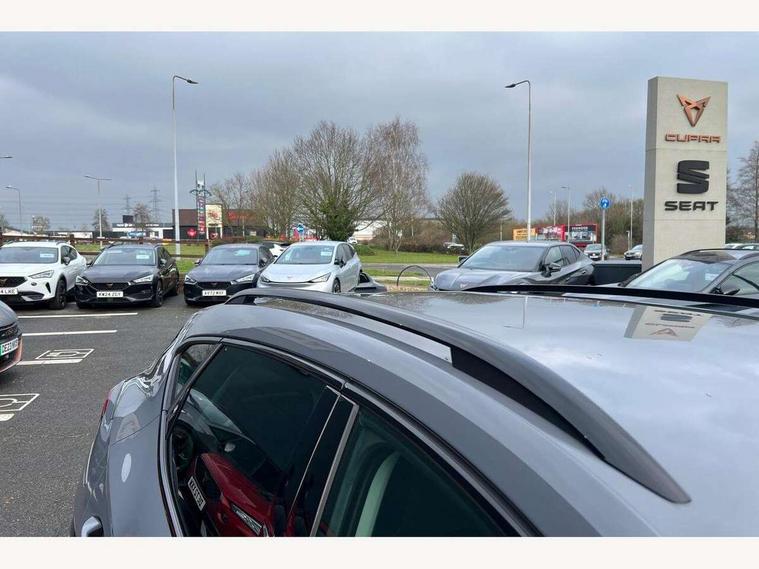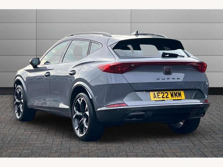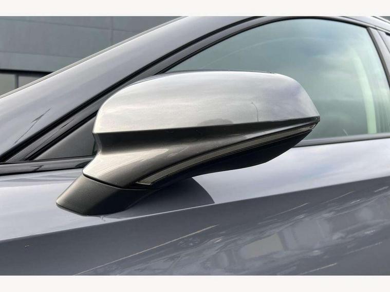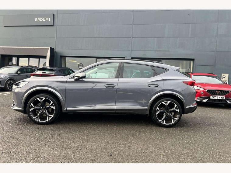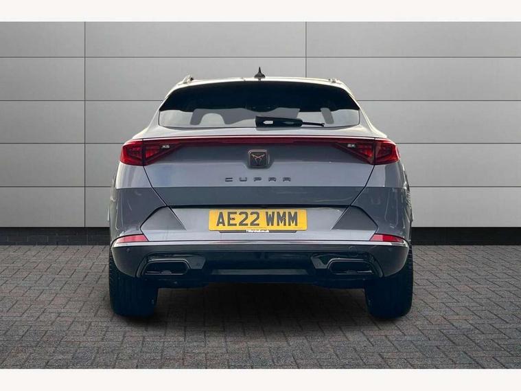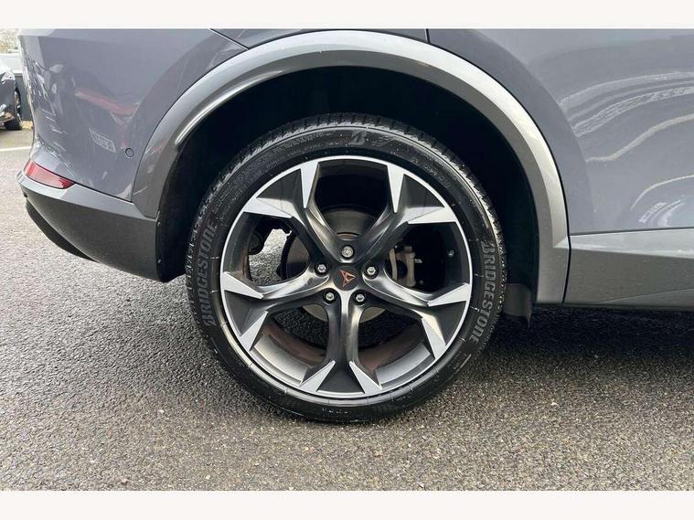 Digital cockpit and configurable dashboard, Driver alert system, Driving profile selection, E-call, Forward collision warning with automatic braking, Lane assist, Park assist (inc front/rear parking sensors), PAS, Predictive adaptive cruise control with speed limiter, Rear view camera, RPM, trip computer, outside temp gauge, instrument light brightness, low fuel warning light, lights on reminder, gearshift indicator, Service interval indicator, Start/stop system with regenerative braking, Wireless apple carplay, Wireless phone charger, Electronic locking differential and dynamic traction support, Standard suspension, 2 front and 2 rear USB type C sockets, Auxiliary input socket, DAB radio, Auto dimming rear view mirror, Body colour door handles, Body coloured bumpers, Dark grey wing mirror, Daytime running light with automatic headlight control and coming home feature, Dynamic headlight range control, Electric front/rear windows, Electrically adjustable heated and folding door mirrors with memory function, Front fog lamps with cornering function, Gloss black roof rails and window surrounds, LED Headlights, LED Taillights with dynamic indicator, Rain sensing wipers, Rear diffuser with black simulated exhaust pipes, Rear side wing doors, Rear wash/wipe, Third brake light, Tinted rear windows, Welcome lights, 12v power supply in centre console, 12V socket, 12v socket in loadspace, 2 front and 2 rear reading lights, 230V socket, 3 seat bench in 2nd row, 60/40 split rear bench seat with armrest and mechanical seat release, Dust/pollen filter, Front and rear head restraints, Front centre armrest, Height/reach adjust steering wheel, Illuminated interior front door sills, Illuminated sunvisor with mirror, Isofix, Leather multi function heated steering wheel with gear shift paddles, Luggage tie-down hooks, Single front passenger seat, Three zone climate control with control panel in rear, Variable luggage/load compartment floor, Wraparound lighting, Genuine Nappa leather Pack - Cupra, Navigation system pack with 10" navigation system - Formentor, 3 point seatbelts on all rear seats, ABS, Brake control system - ESC and brake booster, Child proof door locks, Driver and front passenger airbags with front passenger airbag de-activation, Electronic parking brake, Front and rear disc brakes, Front side curtain airbags, Hill hold control, Seat belt reminder for front and rear seats, Tyre pressure monitoring system, Anti theft alarm system, Keyless entry and start system (KESSY), Locking wheel bolts, Copper and aluminium interior detailing, 19" 'Exclusive' machined sport matte black and silver alloy wheels,