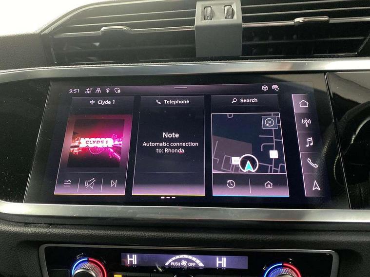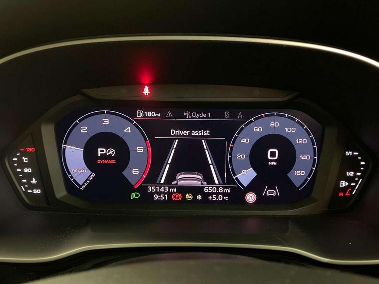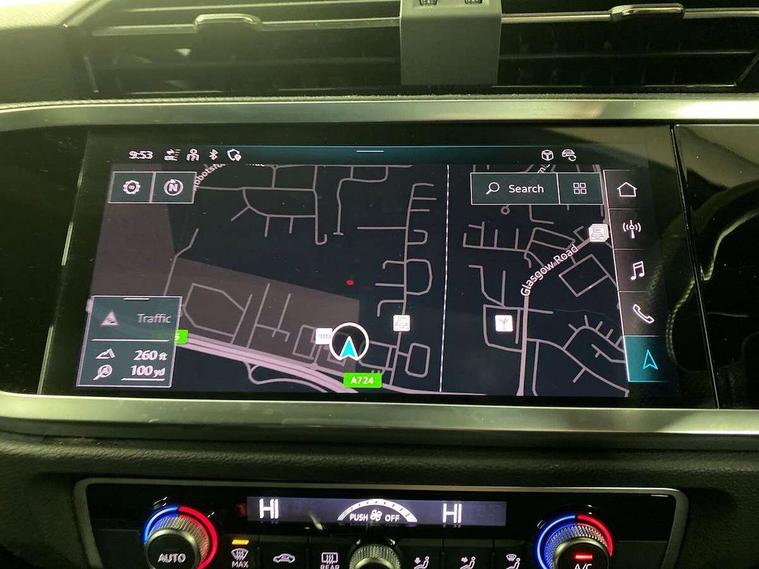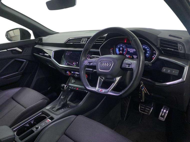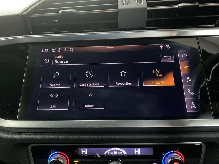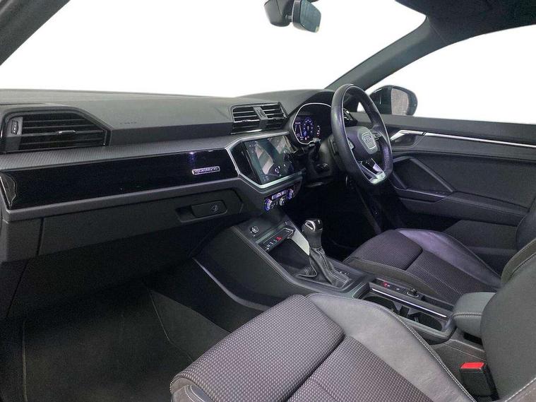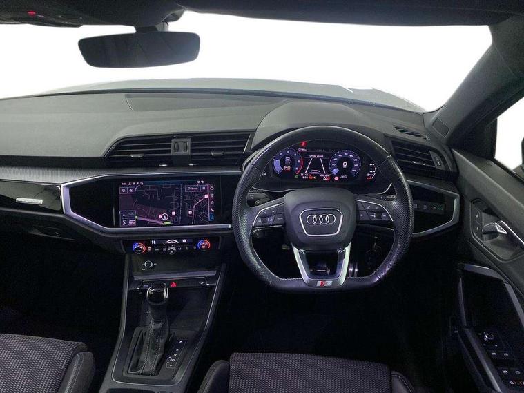 Audi connect safety and service (e-call), Audi drive select, Audi lane departure warning, Audi Virtual Cockpit - 10.25" display, Bluetooth interface, Camera based traffic sign recognition, MMI Navigation Plus with high resolution 10.1 inch touchscreen colour display, Power operated tailgate, Progressive steering, Service interval indicator, Smartphone interface includes wireless Apple carplay/Android Auto, Start stop system with recuperation, Voice control system with natural language interaction, Diesel particulate filter, Sports suspension, 2 USB-C ports with charge and data functions, 6 passive loudspeakers, DAB digital radio module, Acoustic windscreen, Auto dimming frameless rear view mirror, Bumpers and underbody protection in contrasting manhattan grey paint finish, Diffuser grille in grained matt black, Diffuser trim in selenite silver, Electrically folding, adjustable and heated door mirrors with integrated LED side indicators and kerb view function for passenger side, Front and rear electric windows, Front fog lights, Front side air inlets in selenite silver, High gloss black finish B and C pillars, LED headlights with LED daytime running lights and dynamic rear indicator, LED rear lights, Privacy glass dark tinted rear and rear-side windows (from B-pillar backwards), Rain and light sensors, Rear underbody protection in matt black, 12V socket in rear centre console, 40:20:40 folding with manual adjustment for 60:40 forwards/backwards position and backrest angle, Adjustable rear seat bench/backrest with centre armrest and cupholder, Black cloth headlining, Dual zone electronic climate control, Front and rear black floor mats with contrast stitching, Front and rear headrests, Front and rear roof module including reading lights, Front centre armrest, Glove compartment lighting, Height and reach adjustable steering wheel, Illuminated door sill trims with S logo, ISOFIX child seat mounting for front passenger with airbag deactivation and outer rear seat including top tether attachment point for outer rear seats, Luggage compartment light, Manual front seats with height adjustment, Perforated leather gearknob, Stainless steel luggage compartment sill finisher, Stainless steel pedals, Black styling pack - Q3, Non smoking pack - Q3, 3x3 point rear seatbelts, 6 airbags - Driver, front passenger, curtain and side windows, Audi pre-sense front with pedestrain and cyclist recognition, Electrically operated child locks on rear doors, Electromechanical parking brake, Electronic stabilisation control including ABS, ASR and EDL, Hill descent control, Hill hold assist, Pre sense basic, Seatbelt monitoring, Tyre pressure warning, Warning triangle and first aid kit, Anti theft alarm, Anti theft wheel bolts, Remote central locking, Black dashboard, Detail dashboard around MMI touch colour display in glass look, black with surround in aluminium look, Leatherette door armrest, Piano black inlay,