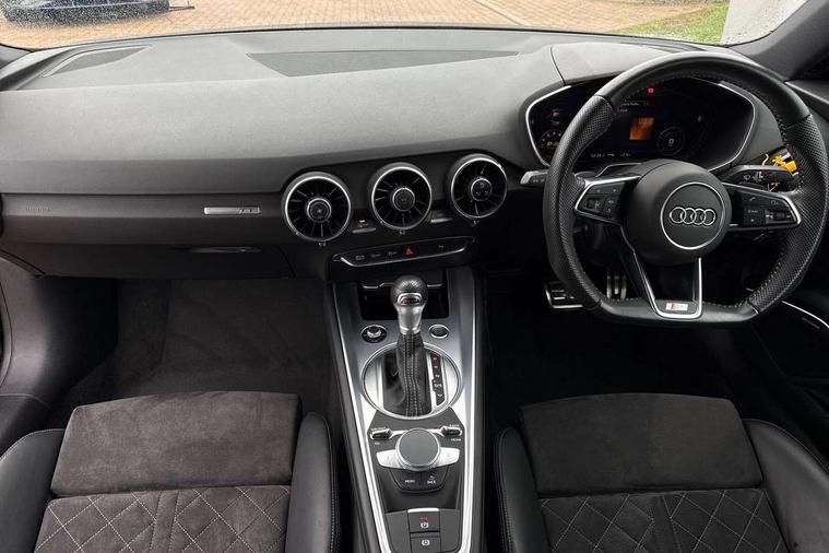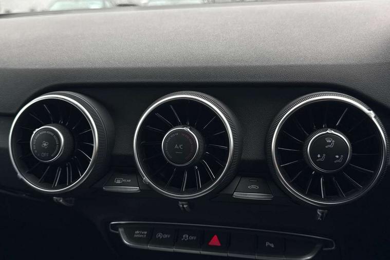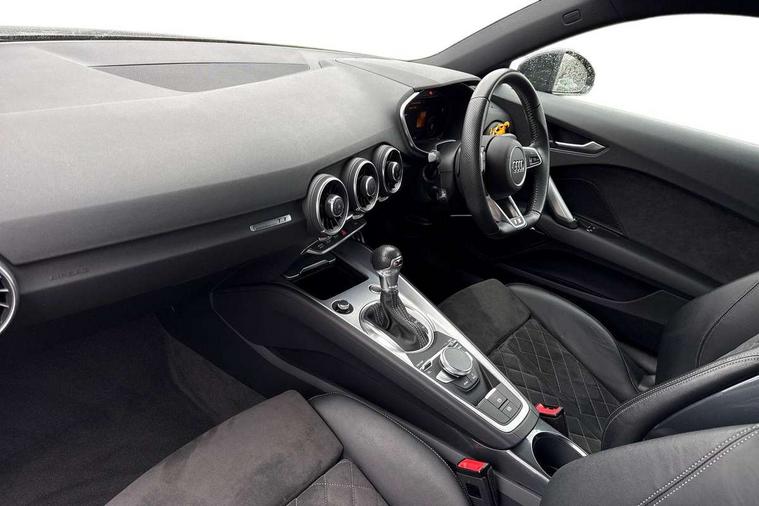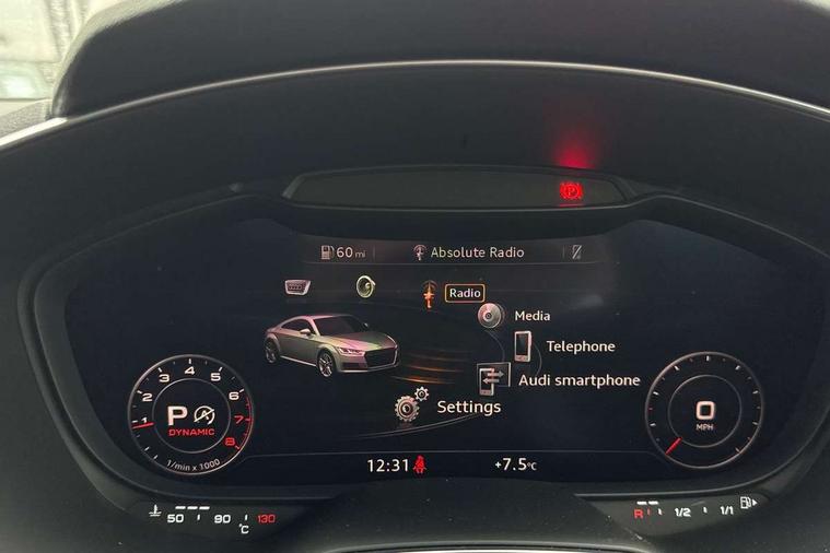 Audi drive select with 4 Pre configured modes, Audi smartphone interface, Audi virtual cockpit - 12.3" high-resolution LCD display with fully customisable instrument cluster, Cruise control + speed limiter, Emergency call service, MMI touch panel, Mobile phone preparation with bluetooth interface, Progressive power assisted steering, Service interval indicator, Start/Stop system with energy recuperation, TP memo, Sports suspension, AM/FM radio, Bluetooth audio streaming, DAB Digital radio, MMI Radio with CD player and SD/XC card slot, Auto dimming rear view mirror, Auto headlight range control, Black chrome tailpipe, Dark privacy glass from B-pillar backwards, Electric folding door mirrors, Electric front windows, Electrically adjustable and heated door mirrors with integrated LED side indicators, Front fog lights, Green tinted heat insulating glass, LED 3rd brake light, LED daytime running lights, LED headlights with LED rear lights + dynamic rear indicators, Light and rain sensors, Rear boot, Sunband for windscreen, 12V socket, 2 rear seats, 3 spoke flat bottomed high multi-function leather sport steering wheel with gearshift paddles, 4 way electric lumbar support for driver and front passenger, Black headlining, Contrasting silver stitching in steering wheel, Door sill trims, Extended aluminium look with stainless steel pedals, Front centre armrest, Front passenger seat, Front super sports seats, Heated front seats, Height/reach adjust steering wheel, Integrated head restraints, ISOFIX child seat mounting for front passenger seat with airbag deactivation, Manual adjustment of seat height, fore/aft position, seat angle, seat depth and backrest angle, Perforated leather gearknob in black, Rear head restraints, Rear top tether child seat ISOFIX attachment, Split folding rear seat, Black styling pack - TT, Non smoking pack - TT/TT RS, 3 point front seat belts, ABS, ASR traction control, Curtain airbags, Driver and front passenger airbag with front passenger airbag deactivation, EDL traction control, Electromechanical parking brake, ESP, First aid kit, Front side airbags, Head airbags, Hill hold assist, Seatbelt warning, Tyre pressure loss indicator, Warning triangle, Anti theft alarm, Anti theft wheel bolts, Immobiliser, Keyless Go, Remote central locking, Matt brushed aluminium inlays, Tool kit, Tyre repair kit,