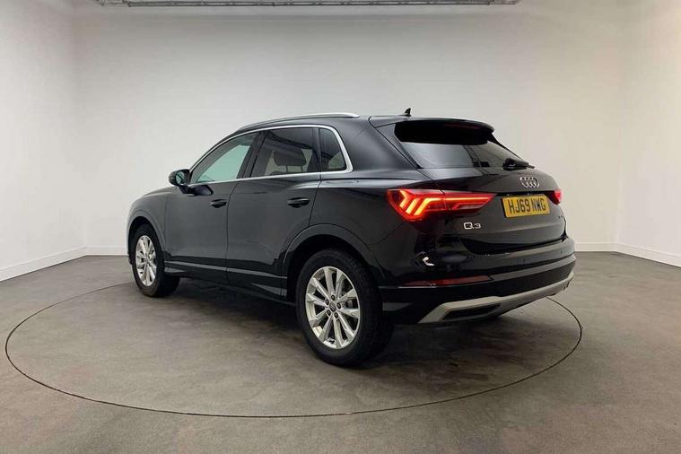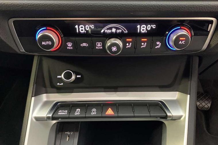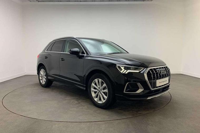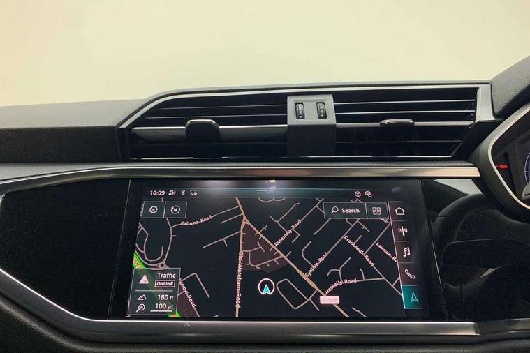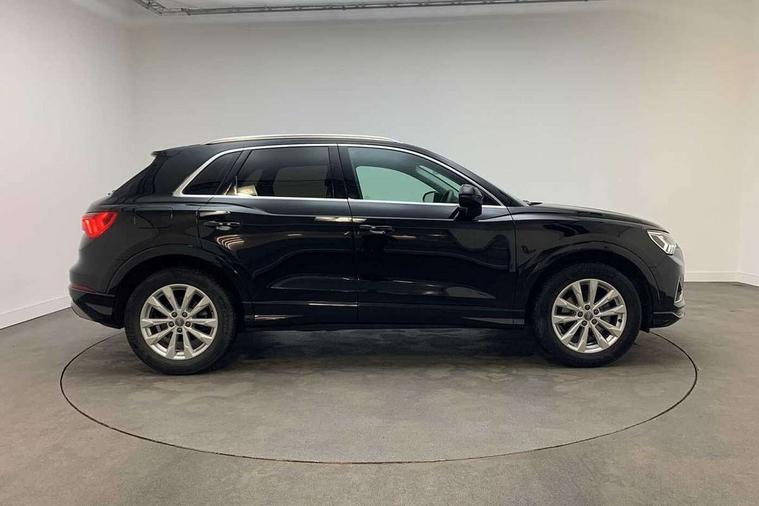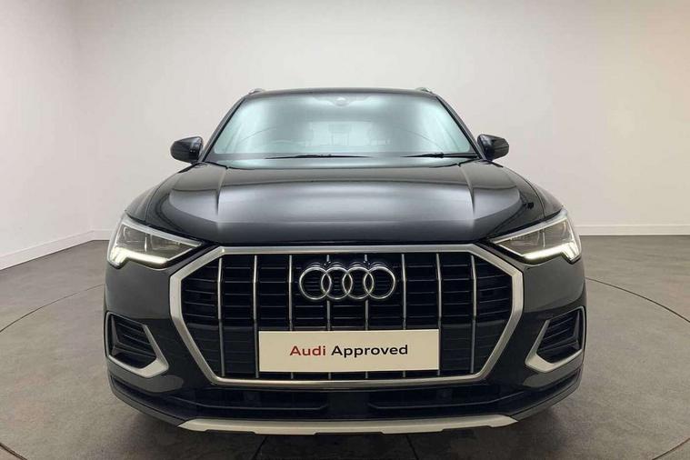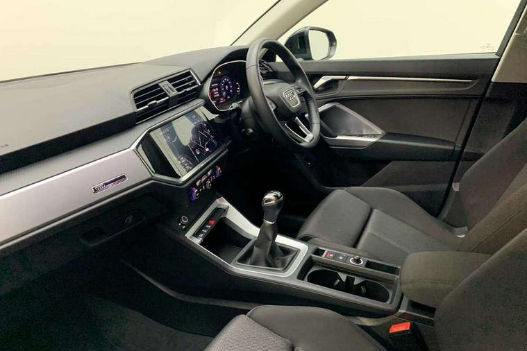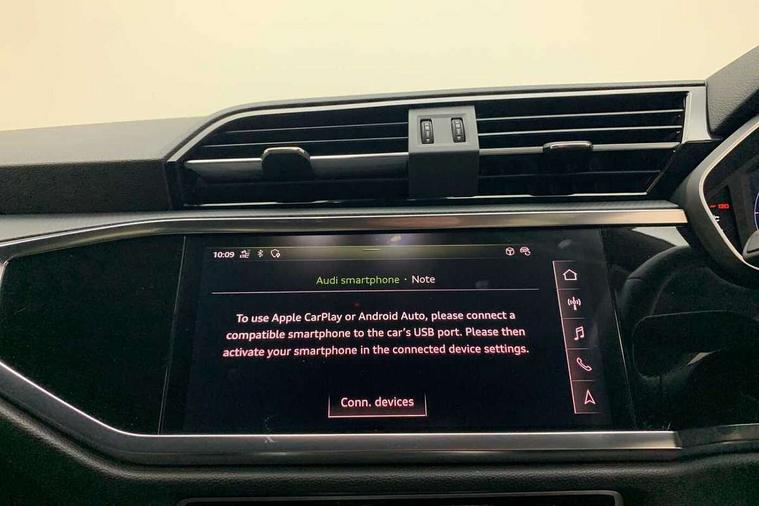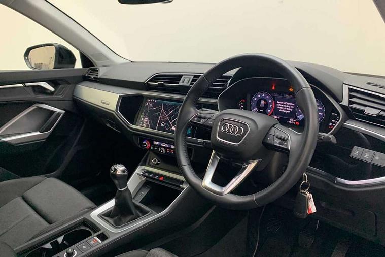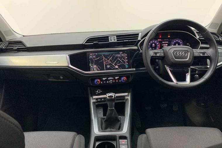 MMI touch colour display in gloss black with aluminium surround, Non smoking pack - Q3, Anti theft alarm, Anti theft wheel bolts, Audi pre-sense front with pedestrain and cyclist recognition, Remote central locking, 1 x USB type C and 1 USB type A charging points, 6 speakers, DAB digital radio module, 3x3 point rear seatbelts, 6 airbags - Driver, front passenger, curtain and side windows, Electrically operated child locks on rear doors, Electromechanical parking brake, Electronic stabilisation control including ABS, ASR and EDL, Hill descent control, Hill hold assist, Pre sense basic, Seatbelt monitoring, Tyre pressure warning, Warning triangle and first aid kit, Acoustic windscreen, Aluminium roof rails, Aluminium window trim, Auto dimming rear view mirror, Body coloured bumpers, Electrically adjustable and heated door mirrors with integrated LED side indicators, Front and rear electric windows, Front fog lights, Front side air inlets in matt selenite silver, Front spoiler in matt selenite silver, Grille vertical bars in aluminium silver/Matt, High gloss black finish B and C pillars, LED headlights with LED daytime running lights and dynamic rear indicator, LED rear lights, Rain and light sensors, Rear diffuser strip in selenite silver, Titanium black radiator grille, 12V socket in rear centre console, 40:20:40 split folding rear bench seat, Adjustable rear seat bench/backrest, Aluminium door sill trims, Dual zone climate control, Front and rear headrests, Front and rear roof module including reading lights, Front and rear velour floor mats, Front centre armrest with storage compartment and angle adjustment, Glove compartment lighting, Height and reach adjustable steering wheel, ISOFIX child seat mounting and Top Tether with front passenger airbag deactivation, Luggage compartment light, Lunar silver cloth headlining, Manual front seats with height adjustment, Stainless steel luggage compartment sill finisher, Audi connect safety and service (e-call), Audi drive select, Audi lane departure warning, Audi side assist, Audi smartphone interface, Audi Virtual Cockpit - 10.25" display, Bluetooth interface, Camera based traffic sign recognition, Cruise control + speed limiter, MMI navigation plus with MMI touch, Power opening/closing tailgate, Progressive steering, Rear parking sensors, Service interval indicator, Stop/start system, Voice control system, Standard suspension,