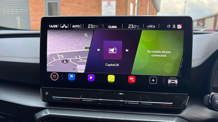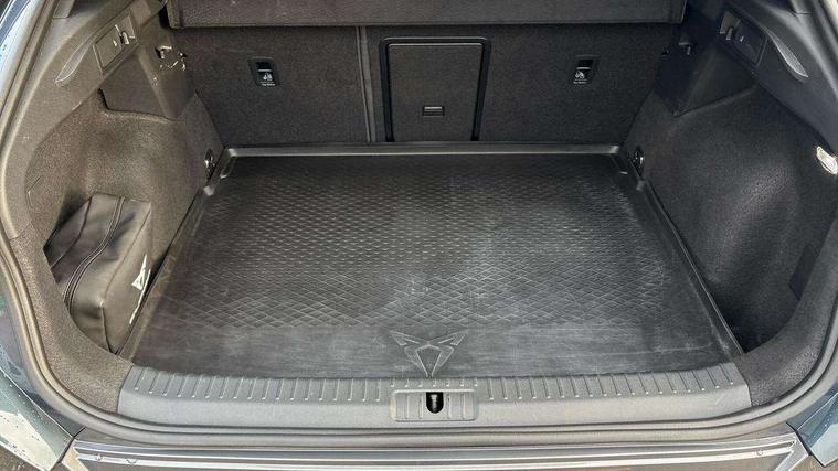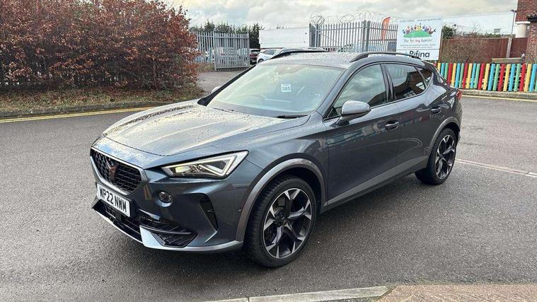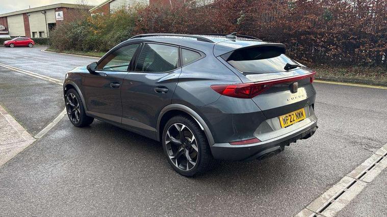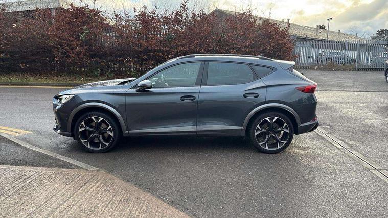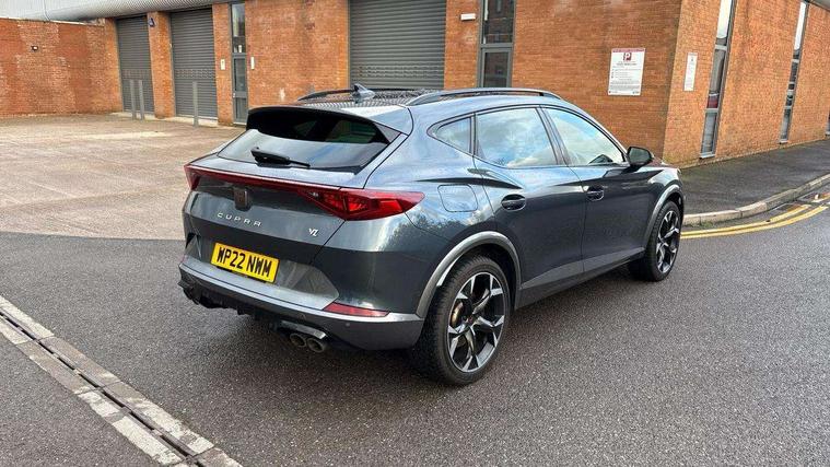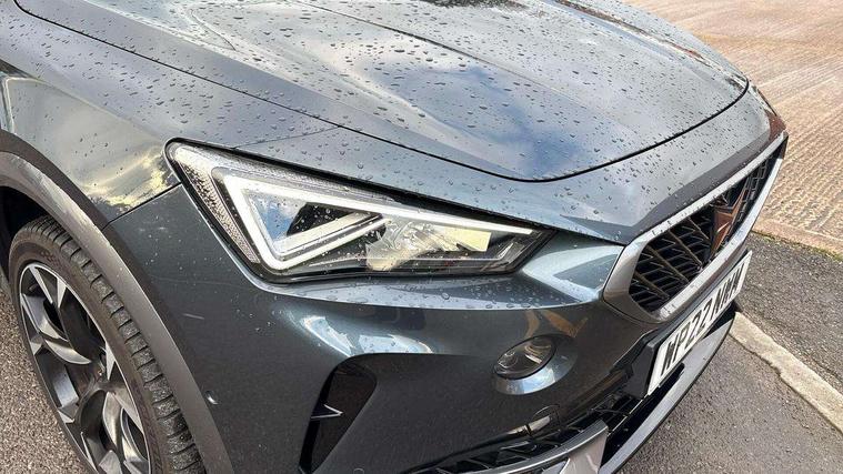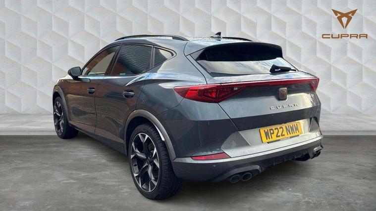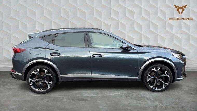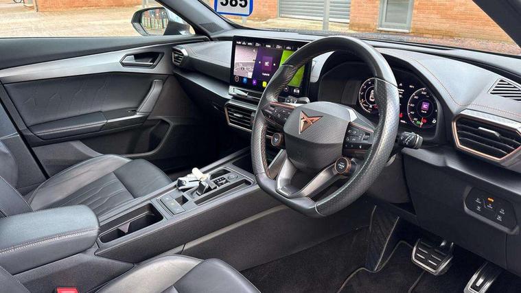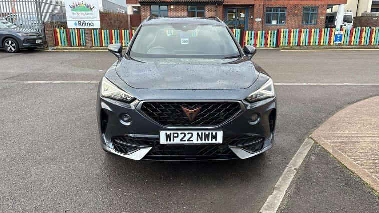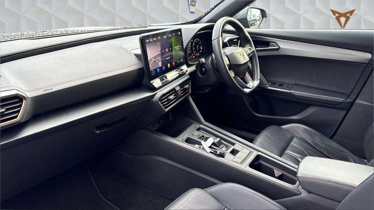 Digital cockpit and configurable dashboard, Driver alert system, Dynamic chassis control with driving profile selection (Comfort, Sport, CUPRA, Individual), E-call, Forward collision warning with automatic braking, Lane assist, Navigation system with 12'' Touchscreen Display, Park assist (inc front/rear parking sensors), Predictive adaptive cruise control with speed limiter, RPM, trip computer, outside temp gauge, instrument light brightness, low fuel warning light, lights on reminder, gearshift indicator, Service interval indicator, Speed sensitive power steering, Start/stop system with regenerative braking, Virtual pedal and electric tailgate, Voice control system, Wireless apple carplay, Wireless phone charger, Electronic locking differential and dynamic traction support, Sports suspension with front shock absoption, 2 front and 2 rear USB type C sockets, Auxiliary input socket, DAB radio, Auto dimming rear view mirror, Body colour door handles, Body coloured bumpers, Dark grey wing mirror, Daytime running light with automatic headlight control and coming home feature, Dynamic headlight range control, Electric front/rear windows, Electrically adjustable heated and folding door mirrors with memory function, Front fog lamps with cornering function, Gloss black roof rails and window surrounds, LED Headlights, LED Taillights with dynamic indicator, Rain sensing wipers, Rear diffuser with twin exhaust pipe on each side, Rear side wing doors, Rear wash/wipe, Sports bumpers, Third brake light, Tinted rear windows, VZ logo rear badging, Welcome lights, 12v power supply in centre console, 12V socket, 12v socket in loadspace, 2 front and 2 rear reading lights, 230V socket, 3 seat bench in 2nd row, 60/40 split rear bench seat with armrest and mechanical seat release, Black headlining, Cupra sports pedals, Dust/pollen filter, Front and rear head restraints, Front centre armrest, Height/reach adjust steering wheel, Illuminated interior front door sills, Illuminated sunvisor with mirror, Isofix, Leather heated multi-function sports steering wheel with start stop, CUPRA mode button and gear shift paddles, Luggage tie-down hooks, Single front passenger seat, Three zone climate control with control panel in rear, Variable luggage/load compartment floor, Wraparound lighting, Genuine Nappa leather Pack - Cupra, Safety and driving pack (XL) - Formentor, 3 point seatbelts on all rear seats, ABS, Brake control system - ESC and brake booster, Child proof door locks, Driver and front passenger airbags with front passenger airbag de-activation, Electronic parking brake, Front and rear disc brakes, Front side curtain airbags, Hill hold control, Seat belt reminder for front and rear seats, Tyre pressure monitoring system, Anti theft alarm system, Keyless entry and start system (KESSY), Locking wheel bolts, Copper and aluminium interior detailing, 19" 'Exclusive' machined sport matte black and silver alloy wheels, Space saver spare wheel,