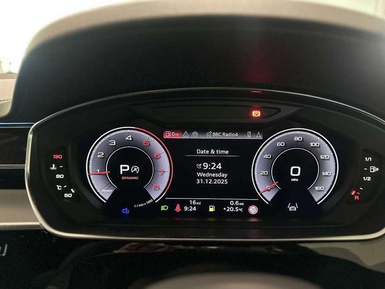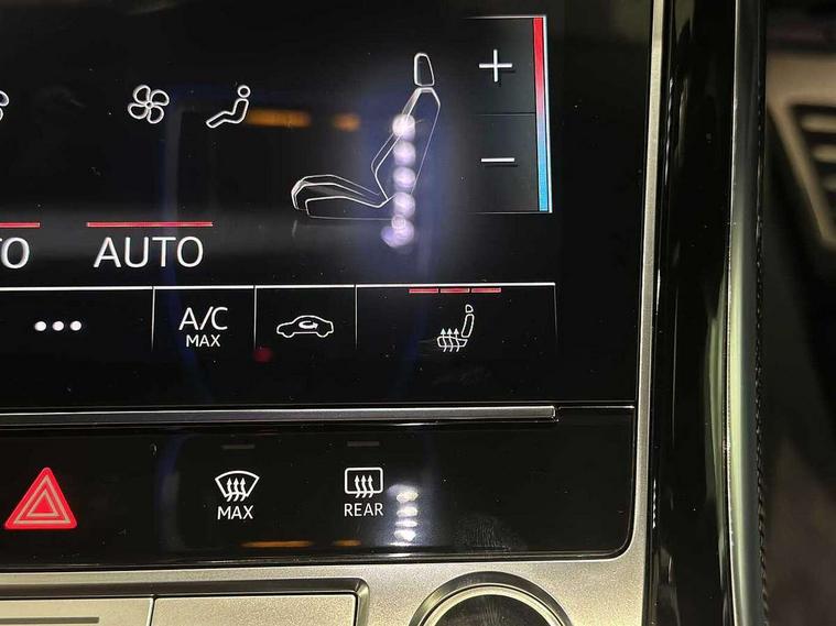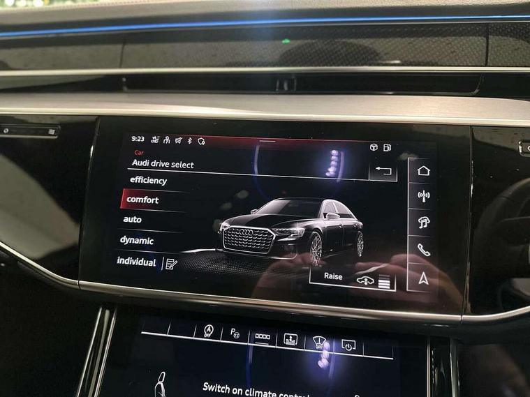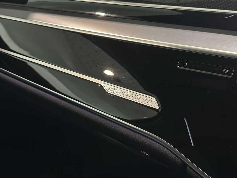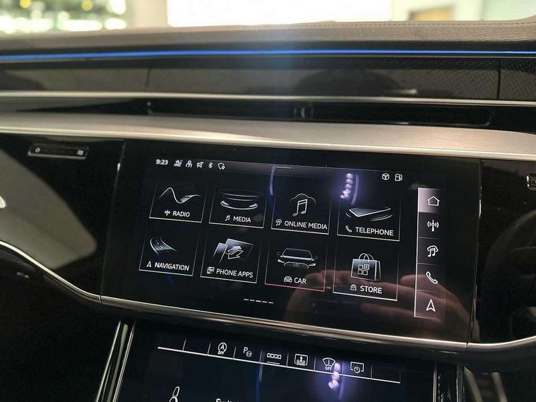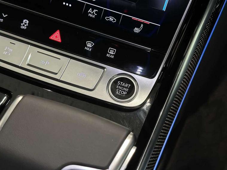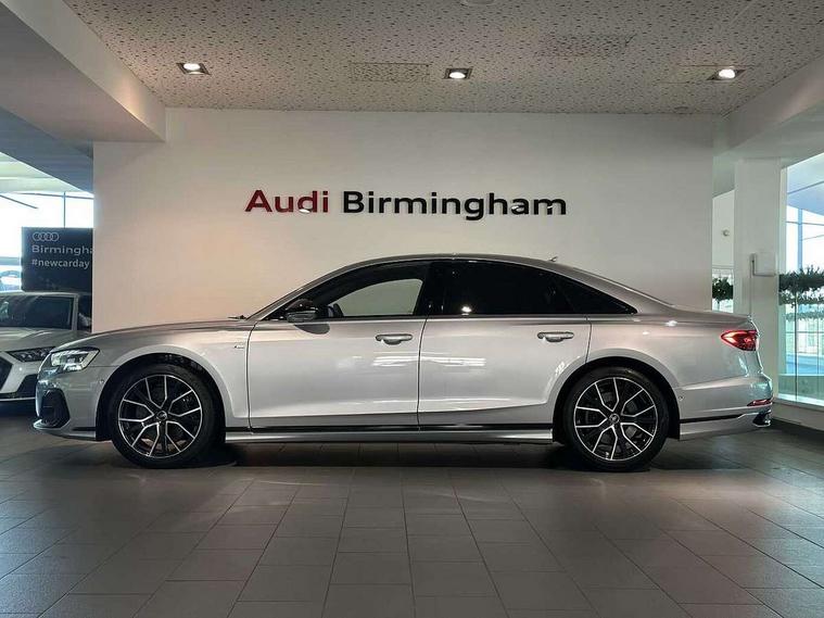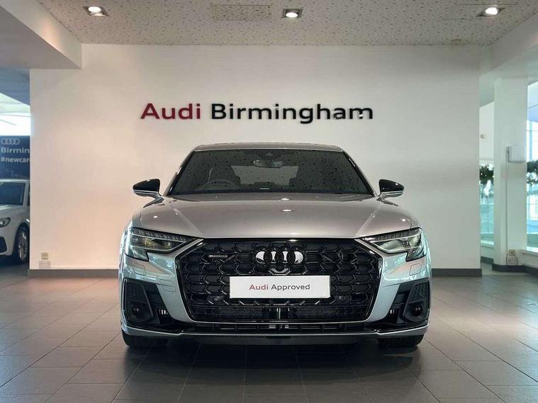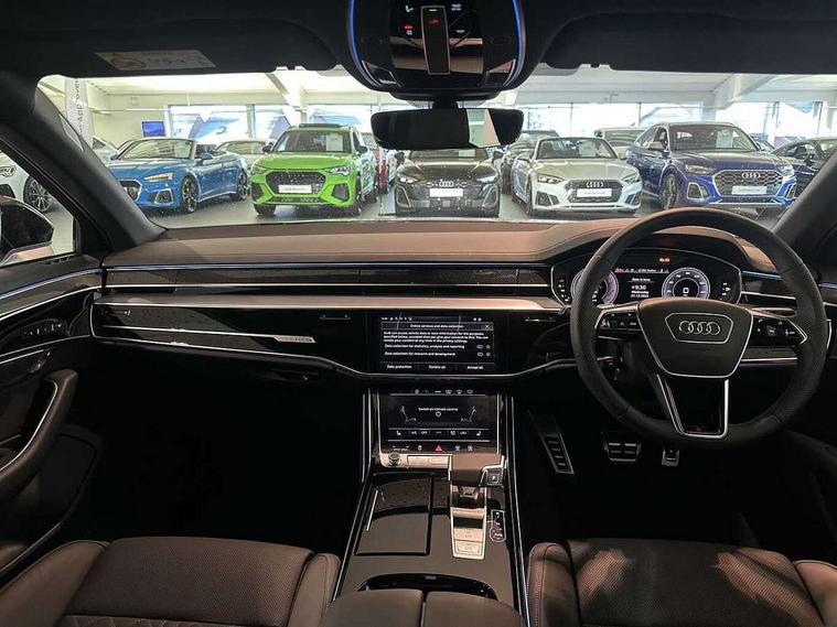 'Lights On' Reminder warning buzzer, Adaptive cruise control with cruise assist, emergency assist, efficiency assist, swerve assist, turn assist and speed limiter, Audi connect safety and service (e-call), Audi drive select, Audi parking system plus with front and rear sensors, Audi smartphone interface with app store includes wireless Apple carplay, Android auto and Amazon alexa integration, Audi virtual cockpit, Bluetooth interface, Camera based traffic sign recognition, Convenience key, Electro - mechanical power assisted steering, Head up Display, MMI navigation plus with MMI touch + Twin touch screens with haptic feedback, Operating buttons in black, glass look with haptic feedback including extended aluminium look, Power door closure, Power operated tailgate, Rear view camera, Remote fuel filler release, Service interval indicator, 48V Mild hybrid technology, 8 speed transmission with hill hold assist, 82 litre fuel tank, Adaptive air suspension, Quattro all wheel drive with self locking centre differential, Audi music interface, Audi sound system, DAB digital radio module, MMI radio plus, USB connection, Acoustic double glazing, All-weather, manoeuvring, position, static cornering, turning and motorway lights with automatic dynamic headlight range control, Audi space frame, Auto dimming rear view mirror, Body colour bumpers, Electric front windows, Electric rear windows with isolation switch, Electric sunblinds for rear window and rear door windows, Electrically adjustable heated folding + automatically dimming exterior mirrors with memory function and integrated LED indicators, Front wash/wipe with interval delay, HD matrix LED headlights with dynamic light presentation and dynamic indicators, Headlight cleaning system, Heat insulating darkened glass in side and rear windows, Heat insulating glass windscreen, Heated rear window, Heated windscreen washer jets, High beam assist, LED brake lights, LED daytime running lights, LED third brake light, OLED rear lights with changeable rear light signature, Privacy glass, Rear boot, Rear side wing doors, Welcome/leaving lighting, 12V socket, 2 zone automatic air conditioning, 3 seat rear bench with centre armrest in 2nd row, 4 way electric lumbar support for driver and front passenger, Audi phone box light, Black cloth headlining, Centre console with cupholders, Comfort centre armrest front, Door pockets with bottle holder, Driver and front passenger side sunvisors with illuminated vanity mirrors, Dust/pollen filters, Electric front seats with memory function, Front floor mats, Glove compartment cooling, Heated front seats, Height/reach electric steering column with easy exit function, Illuminated door sill trims with aluminium inlays and S diamond emblem, Isofix child seat mounting points on outer rear seats, Leather gearknob, Passenger footwell storage net, Reading lights, Rear floor mats, Rear headrests, Roof mounted sunglasses holder, Single front passenger seat, Stainless steel pedals and footrest, Valcona leather upholstery with front sports seats in diamond quilted with S embossed logo, Black exterior styling pack - A8 Black Edition, Chrome exterior pack - A8, Extended LED Interior multi coloured light pack - A8, 3 point seatbelts on all rear seats, ABS/EBD, Active front headrest system, ASR traction control, Audi pre sense basic, Audi pre sense front, Black brake calipers, Driver/Front Passenger airbags, EDL traction control, Electromechanical parking brake, ESP, Extended pedestrian protection measures, Front and rear disc brakes, Front and rear side airbags with head airbag system, Front passenger airbag deactivation, Rear child proof door locks, Seatbelt reminder + electric contact in buckle + advanced safety equipment, Tyre pressure loss indicator, Warning triangle and first aid kit, Anti theft alarm tow away protection, Anti-theft wheel bolts and wheel loosening detection, Remote central locking, Carbon vector upper inlays, Dark matt brushed aluminium lower inlays,