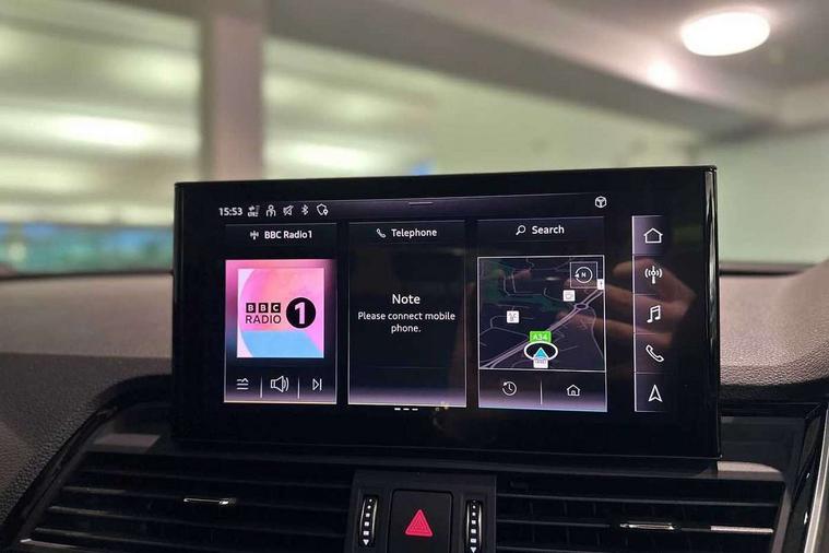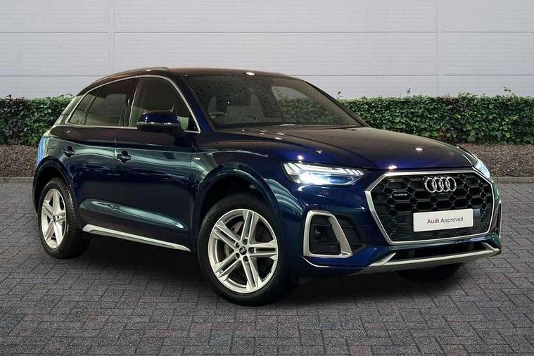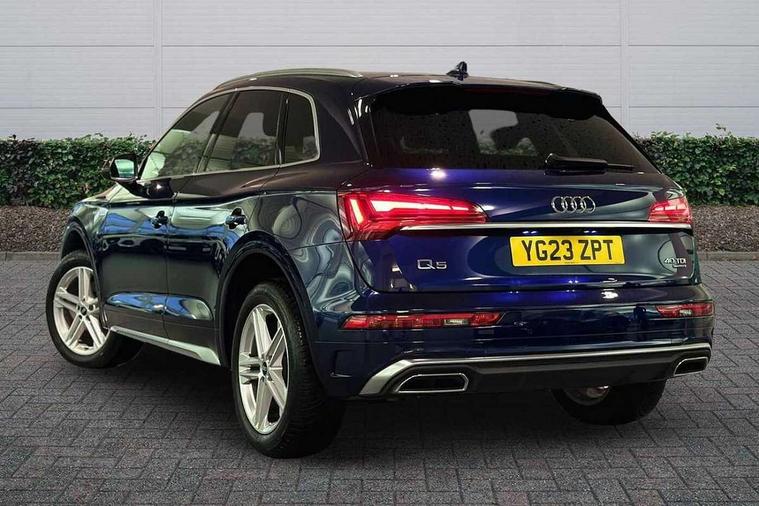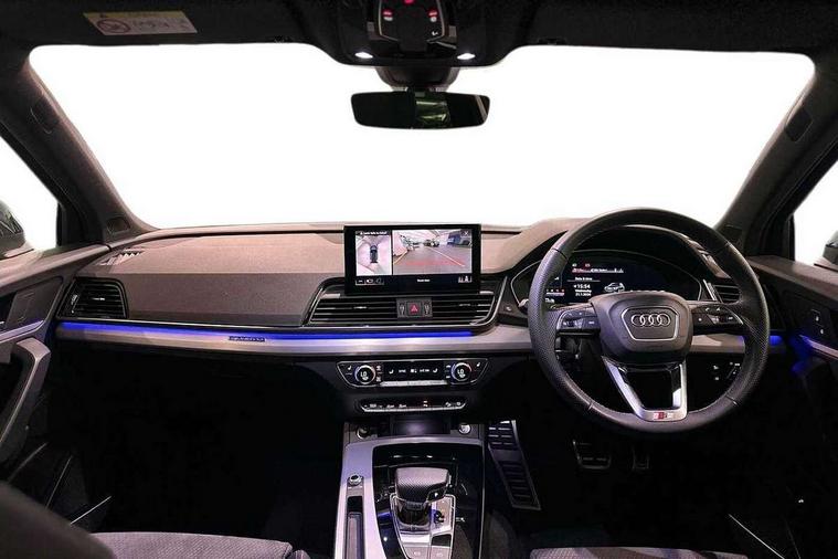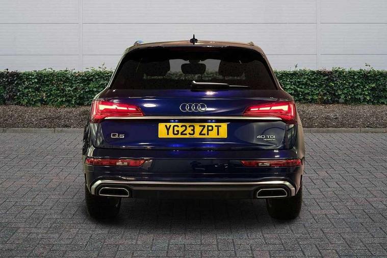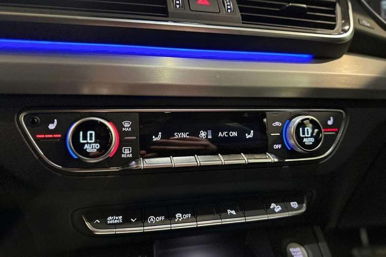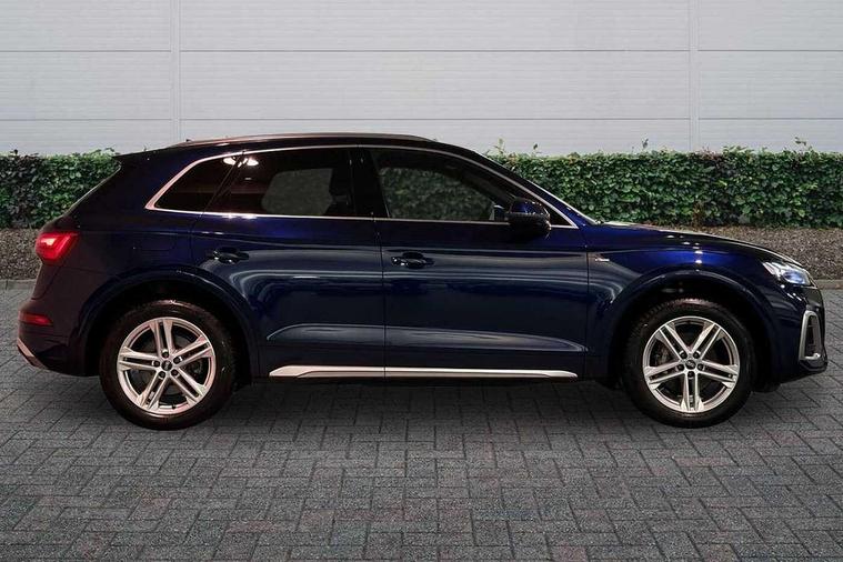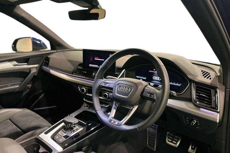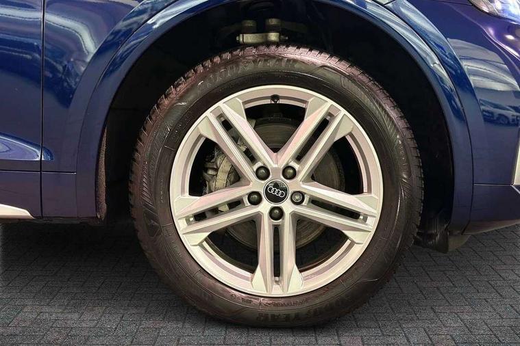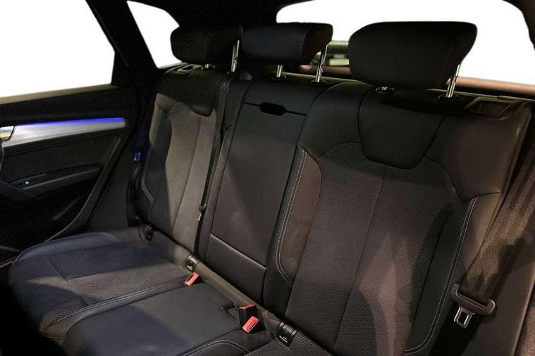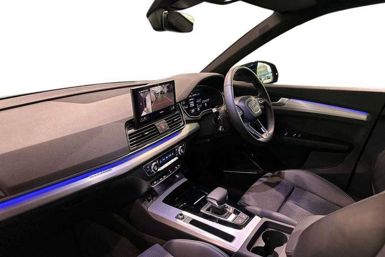 Acoustic front and rear parking sensor, Audi connect safety and service (e-call), Audi connect with Amazon Alexa Integration, Audi drive select, Audi virtual cockpit plus with 12.3" screen and three different layout designs, Audi wireless smartphone interface, Automatic start-stop system with coasting functionality and efficiency programme, Bluetooth interface, Electro - mechanical power assisted steering, MMI navigation plus with 10.1" touch screen, Power tailgate, Reversing camera, Service interval indicator, Voice control system with Audi hotword activation "Hey Audi", Diesel particulate filter, Quattro on demand, S line sports suspension, 2 x USB charging port with aux input socket, 8 loudspeakers, DAB Digital radio, Acoustic windscreen, Aluminium roof rails, Audi matrix LED headlights with dynamic front and rear indicators, Auto dimming door mirrors, Auto dimming frameless rear view mirror, Automatic headlight adjustment, Automatic headlights and windscreen wipers, Body colour bumpers, Body colour door mirrors, Body colour rear diffuser with matt aluminium silver surrounds, Body colour underbody protection, Chrome plated exhaust trims, Daytime running lights, Door sills in Selenite silver, Electric adjustable/heated/folding door mirrors, Front air inlet surrounds in aluminium, Front and rear electric windows, Front radiator grille in honeycomb design, Headlight washers, High level LED brake light, Lower bumpers painted in contrast Manhattan grey, Rear chrome trim strip below lights, Rear privacy glass and rear side windows, Rear side wing doors, Rear wiper, Roof bars, S Line badges on the front wings, S Line front and rear bumpers, S Line rear spoiler, S Line side skirts, 3 rear headrests, 3 spoke leather multifunction steering wheel with S badging perforated leather grips, 40:20:40 split folding 3 rear bench seat in 2nd row with rear centre armrest, Black cloth headlining, Comfort front centre armrest, Contrast stitching on seats, steering wheel and gear lever gaiter, Deluxe 3 zone electronic climate control, Front/rear floor mats, Gear lever in black leather, Heated front seats, Height adjustable front head restraints, Height/reach adjustable steering column, Illuminated door sill trims with S logo, Luggage compartment cover, Manual seat adjustment with 4-way electric lumbar support, Removable luggage compartment floor, Single front passenger seat, Stainless steel pedals, Sunvisors with vanity mirrors, High gloss pack - Q5, LED interior light pack - Q5, 3 point seatbelts on all seats, 6 airbags - Driver, front passenger, curtain and side airbags, Electrically operated child locks on rear doors, Electromechanical parking brake, Electronic stabilisation control including ABS, ASR and EDL, First aid kit with warning triangle and vests, Front passenger airbag deactivation, Hill descent control, Hill hold assist, ISOFIX child seat mounting for front passenger seat and ISOFIX child seat mounting with Top Tether for outer rear seats, Multi collision brake assist, Pop-up bonnet for pedestrian protection, Pre sense city, Seat belt force limiter, Seatbelt monitoring, Tyre pressure warning, Anti theft alarm, Anti-theft wheel bolts, Keyless Go access/ignition system, Remote central locking, Air vents inserts and centre console in gloss black, Matt brushed aluminium inlays,