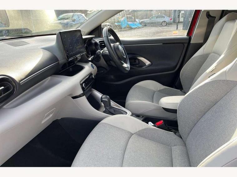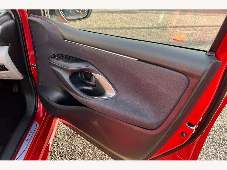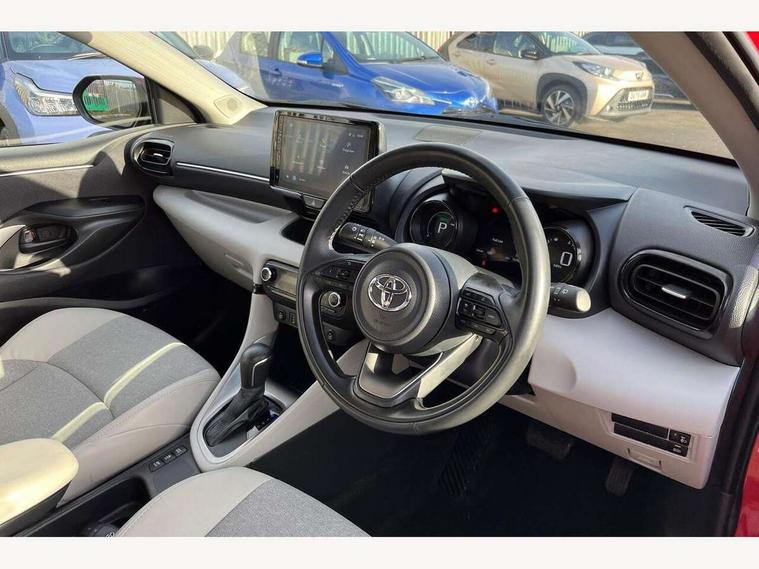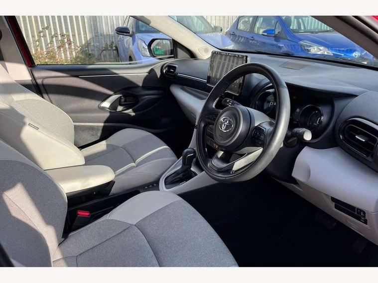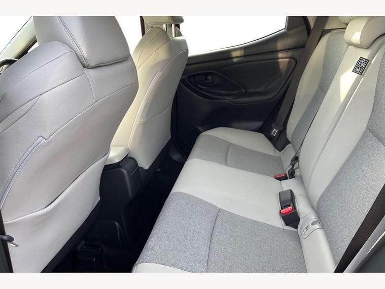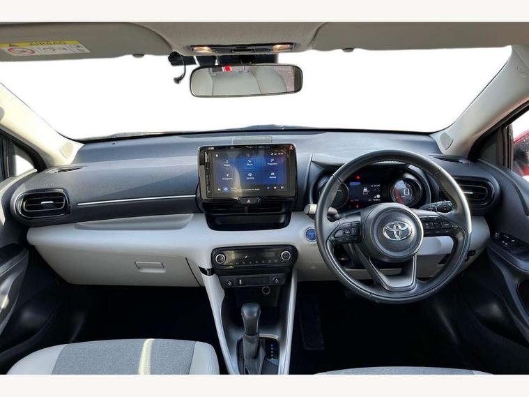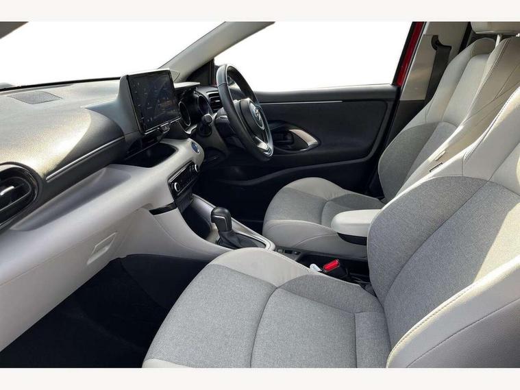 Adaptive cruise control, Adjustable speed limit with speed warning, Blind spot monitoring, Bluetooth connectivity, Colour binocular inspired displays with digital speedometer, E-call, Electric power steering, Hybrid energy display, Multi information display switches on steering wheel, Reversing camera, Smartphone integration with Apple CarPlay and Android auto, Tailgate, Touch 2 navigation system, Voice recognition, Vehicle Stability Control (VSC), 6 speakers, 9" HD multimedia display touch screen with Toyota smart connect, USB connection, Acoustic windscreen glass, Auto windscreen wipers, Automatic headlights, Automatically retractable door mirrors, Body coloured door mirrors, Electric adjustable heated door mirrors, Follow me home headlights, Front auto power windows with anti jam protection, Full LED rear lights, LED daytime running lights, LED front fog lights, LED front light guide, LED Headlights, LED High mounted stop lamp, LED Indicators, LED rear light guide, Manual headlight levelling, Painted chequered front grille, Rain sensor, Rear auto power windows with anti jam protection, Rear privacy glass, Rear side wing doors, Rear spoiler, Rear wiper, Satin lower front grille, Shark fin antenna, Turning signal integrated indicators in door mirrors, Variable front intermittent wipers, 3 adjustable rear headrests, 3 seat bench in 2nd row, 3 spoke leather steering wheel, 60/40 split folding rear seat, Active headrests, Adjustable boot height, Coat hooks in rear grab handles, Cup holders (2 front & door), Data Communication Module (DCM) connected services, Dual zone automatic air conditioning, Fabric seat with partial synthetic leather upholstery, Front armrest, Front sport seats, Glovebox, Grey roof lining, Height adjustable driver's seat, Height adjustable passenger seat, Isofix seat fixing, Leather gearshift, Map pockets on the backs of the front seats, Pollen filter, Shopping bag hooks, Single front passenger seat, Tilt/telescopic steering column, Parking pack - Yaris, 3 point seatbelts on all rear seats, ABS+EBD+Brake assist, Electronic parking brake, Emergency brake light system (EBS), Front passenger airbag on/off switch, Front seatbelt reminder, Hill start assist control (HAC), Rear child proof door locks, Rear seat belt reminder, Supplemental Restraint System (SRS) 8 airbags: Driver & passenger's airbags, dual side curtain airbags, side impact airbags, front centre airbag, Toyota Safety Sense 2, Precollison + Night time Pedestrian & Cyclist Detection, Lane Trace Assist, Auto High Beam, Intelligent ACC & Road Sign Assist, Tyre pressure warning system, 2x Master key, Alarm/immobiliser, Keyless smart entry with push button start, Remote AC via MyT, Remote locking via MyT, Remote powered central double locking doors, Satin chrome interior styling, Soft touch instrument panel, Space saver spare wheel,
