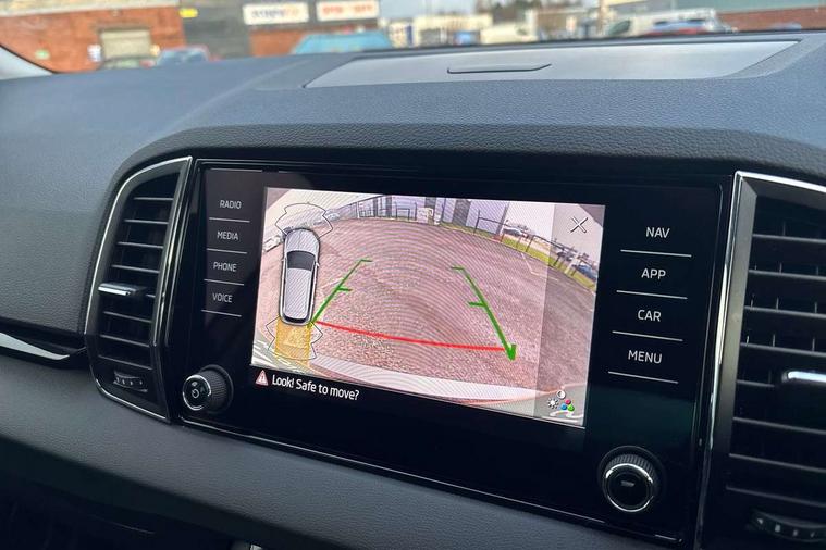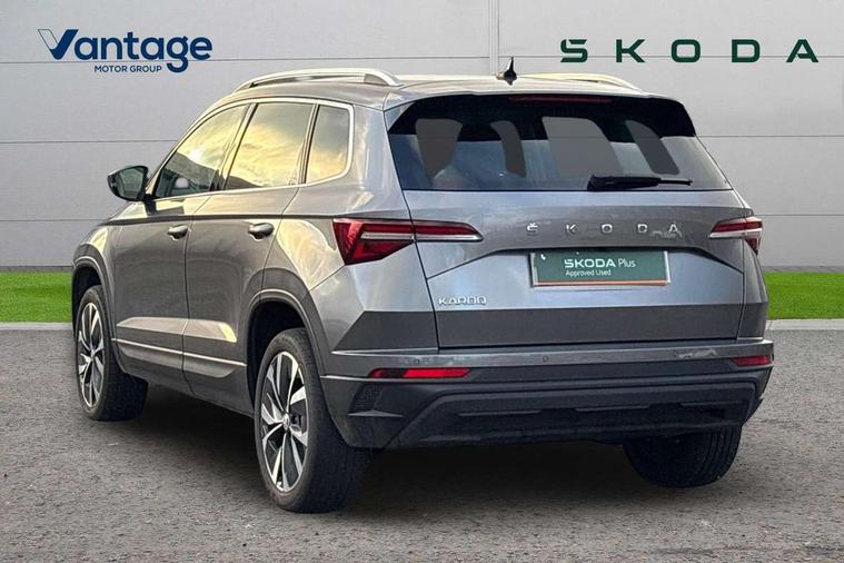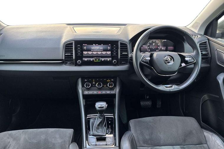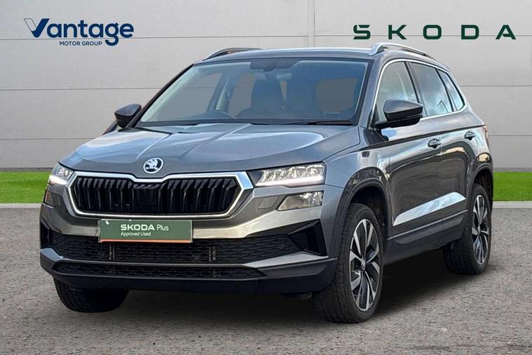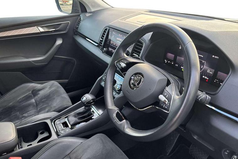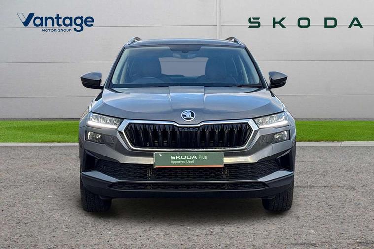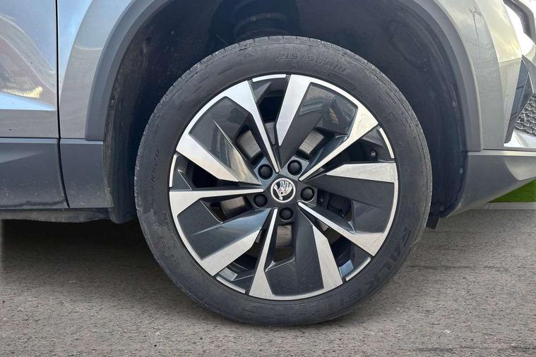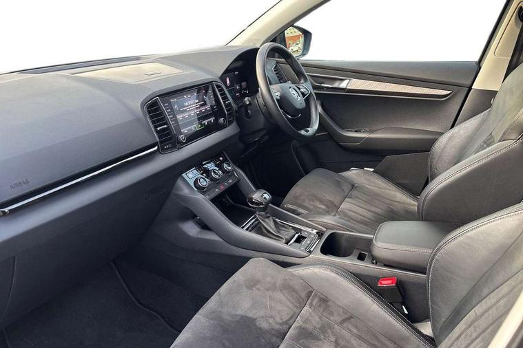 8" Digital display, Care connect, Driver fatigue sensor, Emergency services call system, Outside temperature gauge, Service interval indicator, SmartLink wireless for Apple and wired for Android, Start/stop system with regenerative braking, USB C Port x 2 in front centre console, 8 Speakers, DAB radio with Bluetooth, USB connection, Acoustic glass, Aero front windscreen wipers with intermittent function, Auto dimming rear view mirror with light and rain sensors, Black electric window control buttons, Body colour door mirrors and handles, Dynamic headlight range control with cornering light function, Electric front and rear windows with child proof lock, Heated rear windscreen, LED daytime running lights, LED rear lights with high functionality welcome effect and dynamic indicators, Light assistant (coming/leaving home/tunnel light), Plastic scuff plates, Privacy glass, Rear side wing doors, Rear spoiler, Rear window wiper with washer system and intermittent control, Safety reflectors on front doors, 1.5 litre bottle holders in driver and front passenger door panels, 12V socket in boot, 12v socket in front centre armrest with storage compartment and rear air vents, 2 spoke leather heated multifunction steering wheel with DSG paddles, 2 x Tablet holder, 3 rear height adjustable headrests, 3 seat bench in 2nd row, 4 foldable roof handles with rear coat hooks, Black floor carpet, Chrome inner door handles, Double sided boot floor, Foldable hooks in the boot, Front head restraints, Height adjustable front three point seats belts with tensioners, Height/reach adjust steering wheel, Ice scraper, Illuminated glovebox, Illuminated luggage compartment, Isofix child seat preparation for front passenger seat, Isofix child seat preparation outer rear, Manual lumbar support for front seats, Pen holder, Pollen filter, Rear boot cover, Rear reading lights, Rubbish bin door, Safety vest holder, Single front passenger seat, Storage box in upper central dashboard closed, Sunvisors with illuminated vanity mirrors, Textile floor mats, Ticket holder, VarioFlex seats with standard rear seat release, Boot pack - Karoq, Design Pack - Karoq, Parking pack - Karoq, Automatic door unlocking in case of crash, Automatic fuel cut off in case of crash, Child locks on rear doors, Driver airbag, Electronic parking brake with auto hold function, Emergency rear braking signal, ESC including ABS, MSR, ASR, EDS, HBA, DSR, RBS, MKB and traction control, Front side airbags, Hill hold control, Knee airbags, Passenger airbag with switch-off function, Pedestrian monitor, Seatbelt reminder signalisation and pretensioner for all seats, Three point seatbelts rear, Two tone horn, Tyre pressure display, Tyre pressure monitor, Alarm with interior monitoring, back up horn and tilt sensor with safe function, Electronic engine immobiliser, Keyless entry and start/stop, Remote central locking with 2 remote folding keys, Chrome framed air vents, 18" Miran alloy wheels in black, Anti-theft wheel bolts protection, Tool kit,