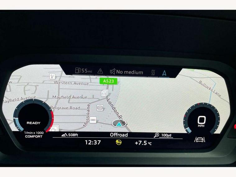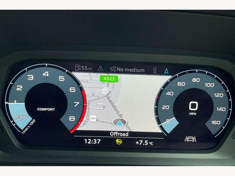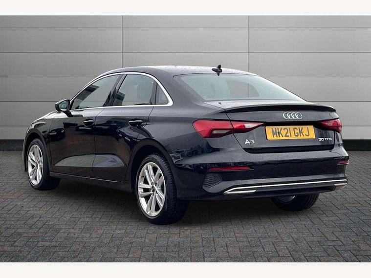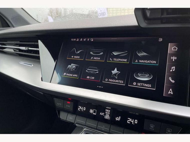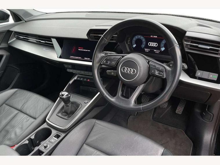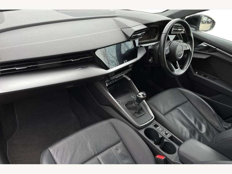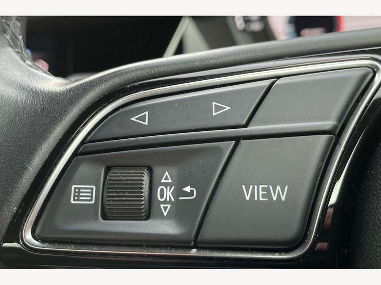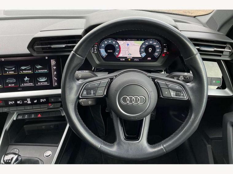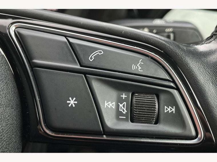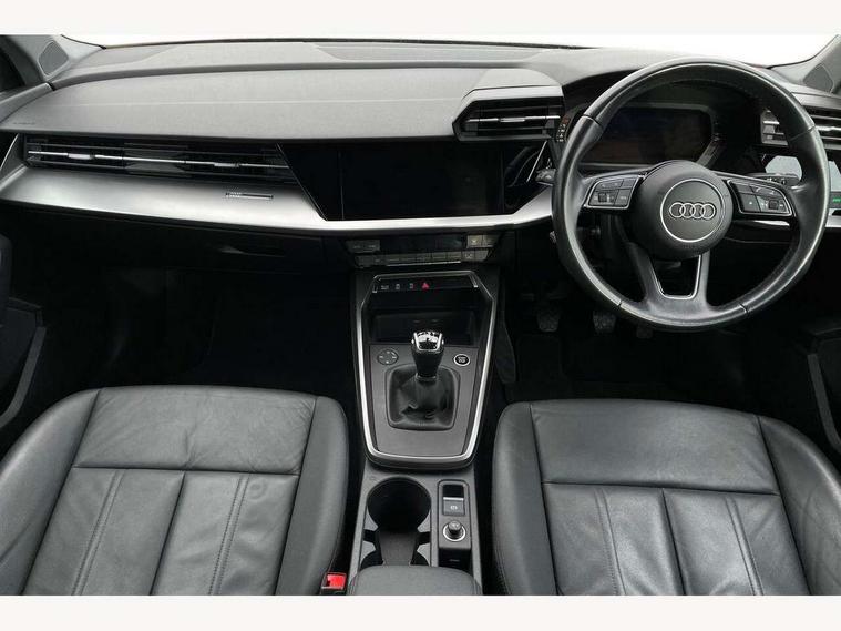 Audi connect emergency call and service, Audi drive select (Auto, Comfort, Dynamic and Individual), Audi smartphone interface, Audi Virtual Cockpit - 10.25" digital and colour instrument cluster, Automatic start/stop system with recuperation, Bluetooth interface, Collision avoidance assistant, Cruise control + speed limiter, Electromechanical power speed sensitive steering, Lane departure warning system, MMI Navigation Plus with high resolution 10.1" colour touch screen display, Rear parking sensors, Service indicator, Voice control system with natural language interaction, Standard suspension, 2x USB Type C ports (for charging and data transfer), 6 passive loudspeakers, CD player, DAB Digital radio, Acoustic glass windscreen, Aluminium window trim, Auto dimming frameless rear view mirror, Body colour exterior mirrors, Body colour roof spoiler, Electrically adjustable/heated/folding/dimming door mirrors with kerb view includes integrated LED indications + kerb view function for passenger side, Front electric windows, LED daytime running lights, Light and rain sensors, Model and engine designation badges at rear, Rear electric windows, Rear window, rear door windows and rear side windows in clear glass, 12V socket and storage compartment in front centre console, 40/20/40 split folding rear seat bench with cupholder, Dual zone electronic climate control, Front and rear headrests, Front centre armrest, Front door sill trims with aluminium inlay, Front/rear floor mats, Height and reach adjustable steering wheel, Interior lighting - Front and rear roof module including reading lights, glove compartment light and right hand side, Luggage compartment floor covering, Manual boot compartment lid, Manually adjustable front seats, Seat side bolsters, Steel grey cloth headlining, Twin leather upholstery, Aluminium interior elements pack - A3 Saloon, Sport styling pack - A3 Saloon, 3x3 point rear seat belts, Driver and front passenger airbag with passenger airbag deactivation, Electronic Stabilisation Control (ESC) including ABS, ASR and EDL, First aid kit with warning triangle and 2 safety vests, Front side airbags with head airbags and interaction airbag, Hill hold assist, Pre-sense front with pedestrian and cyclist detection, Seatbelt monitoring, Tyre pressure loss indicator, Anti theft alarm, Anti-theft wheel bolts, Electronically operated child lock, Immobiliser, Remote control central locking, Aluminium air vent surrounds, Aluminium trim elements, Inlays with silk effect paint in platinum grey,