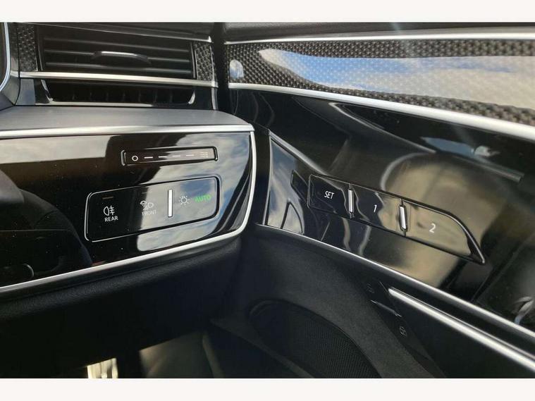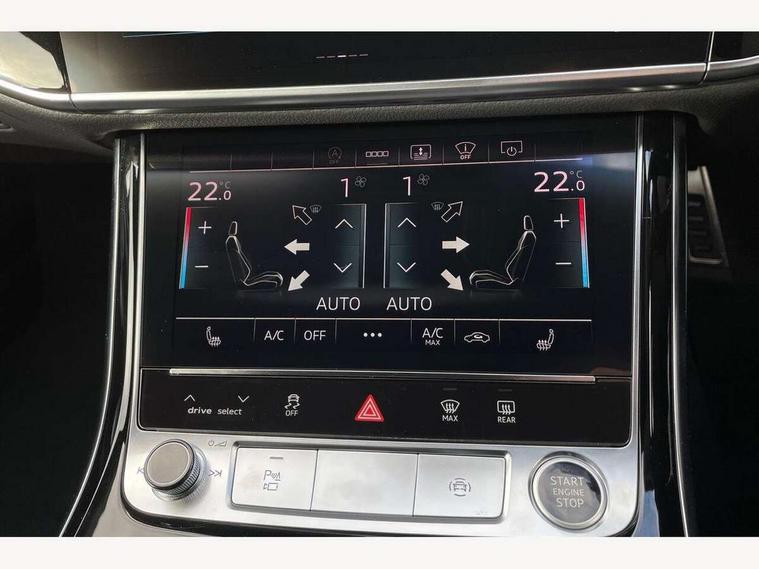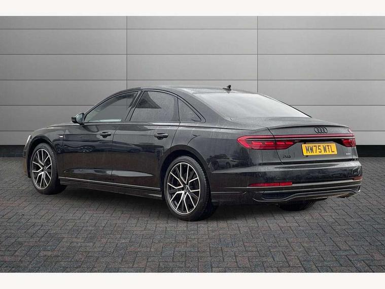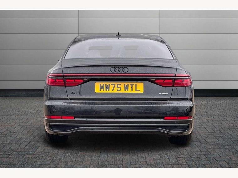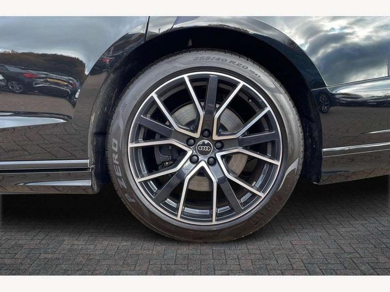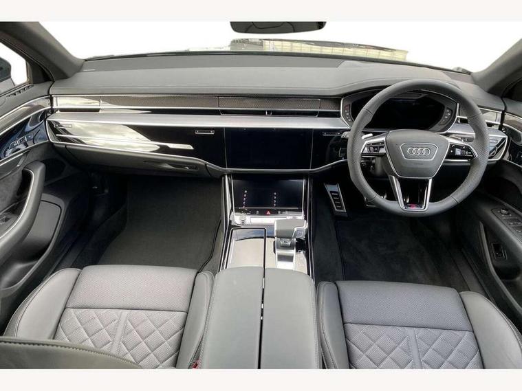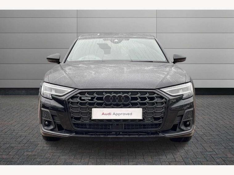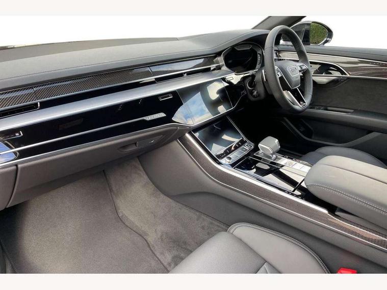 'Lights On' Reminder warning buzzer, Adaptive cruise control with cruise assist, emergency assist, efficiency assist, swerve assist, turn assist and speed limiter, Audi connect safety and service (e-call), Audi drive select, Audi parking system plus with front and rear sensors, Audi smartphone interface with app store includes wireless Apple carplay, Android auto and Amazon alexa integration, Audi virtual cockpit, Bluetooth interface, Camera based traffic sign recognition, Convenience key, Electro - mechanical power assisted steering, Head up Display, MMI navigation plus with MMI touch + Twin touch screens with haptic feedback, Operating buttons in black, glass look with haptic feedback including extended aluminium look, Power door closure, Power operated tailgate, Rear view camera, Remote fuel filler release, Service interval indicator, 48V Mild hybrid technology, 8 speed transmission with hill hold assist, 82 litre fuel tank, Adaptive air suspension, Quattro all wheel drive with self locking centre differential, Audi music interface, Audi sound system, DAB digital radio module, MMI radio plus, USB connection, Acoustic double glazing, All-weather, manoeuvring, position, static cornering, turning and motorway lights with automatic dynamic headlight range control, Audi space frame, Auto dimming rear view mirror, Body colour bumpers, Electric front windows, Electric rear windows with isolation switch, Electric sunblinds for rear window and rear door windows, Electrically adjustable heated folding + automatically dimming exterior mirrors with memory function and integrated LED indicators, Front wash/wipe with interval delay, HD matrix LED headlights with dynamic light presentation and dynamic indicators, Headlight cleaning system, Heat insulating darkened glass in side and rear windows, Heat insulating glass windscreen, Heated rear window, Heated windscreen washer jets, High beam assist, LED brake lights, LED daytime running lights, LED third brake light, OLED rear lights with changeable rear light signature, Privacy glass, Rear boot, Rear side wing doors, Welcome/leaving lighting, 12V socket, 2 zone automatic air conditioning, 3 seat rear bench with centre armrest in 2nd row, 4 way electric lumbar support for driver and front passenger, Audi phone box light, Black cloth headlining, Centre console with cupholders, Comfort centre armrest front, Door pockets with bottle holder, Driver and front passenger side sunvisors with illuminated vanity mirrors, Dust/pollen filters, Electric front seats with memory function, Front floor mats, Glove compartment cooling, Heated front seats, Height/reach electric steering column with easy exit function, Illuminated door sill trims with aluminium inlays and S diamond emblem, Isofix child seat mounting points on outer rear seats, Leather gearknob, Passenger footwell storage net, Reading lights, Rear floor mats, Rear headrests, Roof mounted sunglasses holder, Single front passenger seat, Stainless steel pedals and footrest, Valcona leather upholstery with front sports seats in diamond quilted with S embossed logo, Black exterior styling pack - A8 Black Edition, Chrome exterior pack - A8, Extended LED Interior multi coloured light pack - A8, 3 point seatbelts on all rear seats, ABS/EBD, Active front headrest system, ASR traction control, Audi pre sense basic, Audi pre sense front, Black brake calipers, Driver/Front Passenger airbags, EDL traction control, Electromechanical parking brake, ESP, Extended pedestrian protection measures, Front and rear disc brakes, Front and rear side airbags with head airbag system, Front passenger airbag deactivation, Rear child proof door locks, Seatbelt reminder + electric contact in buckle + advanced safety equipment, Tyre pressure loss indicator, Warning triangle and first aid kit, Anti theft alarm tow away protection, Anti-theft wheel bolts and wheel loosening detection, Remote central locking, Carbon vector upper inlays, Dark matt brushed aluminium lower inlays,