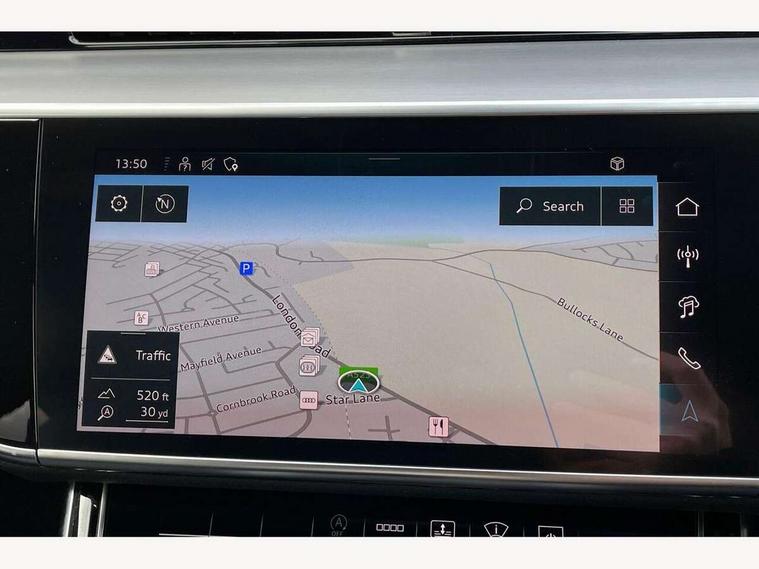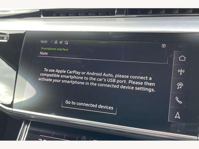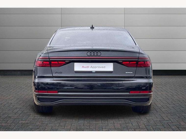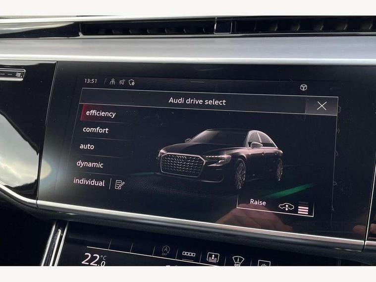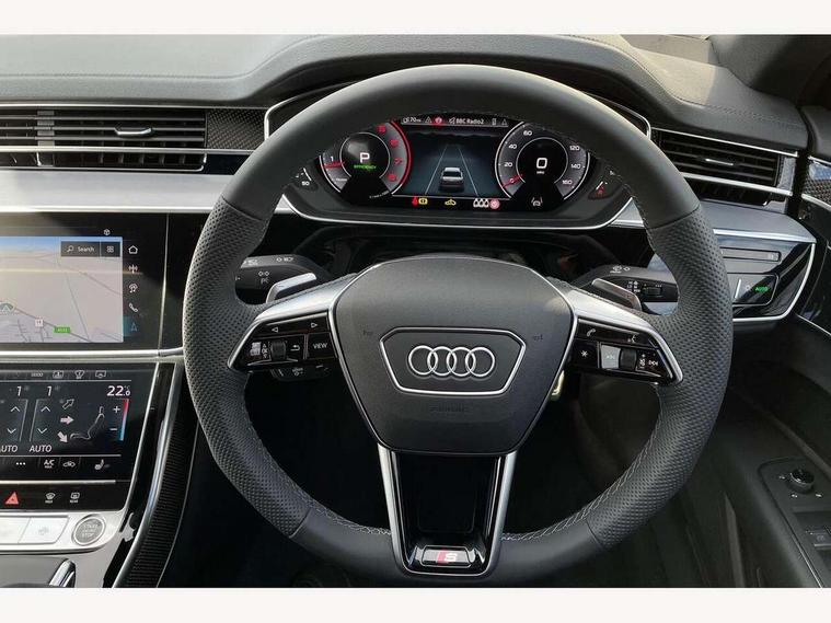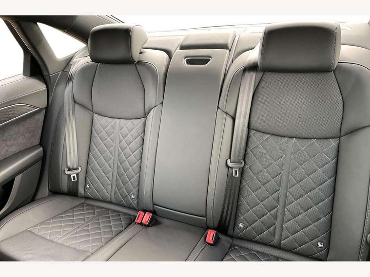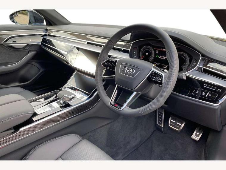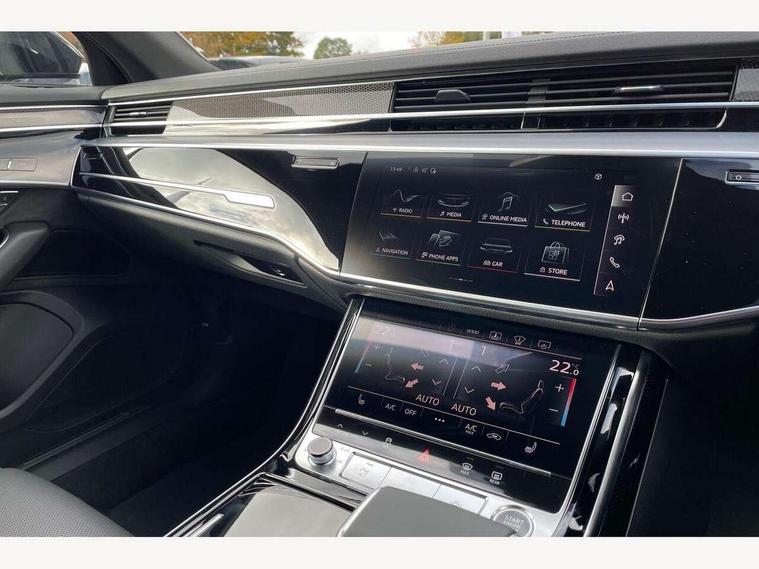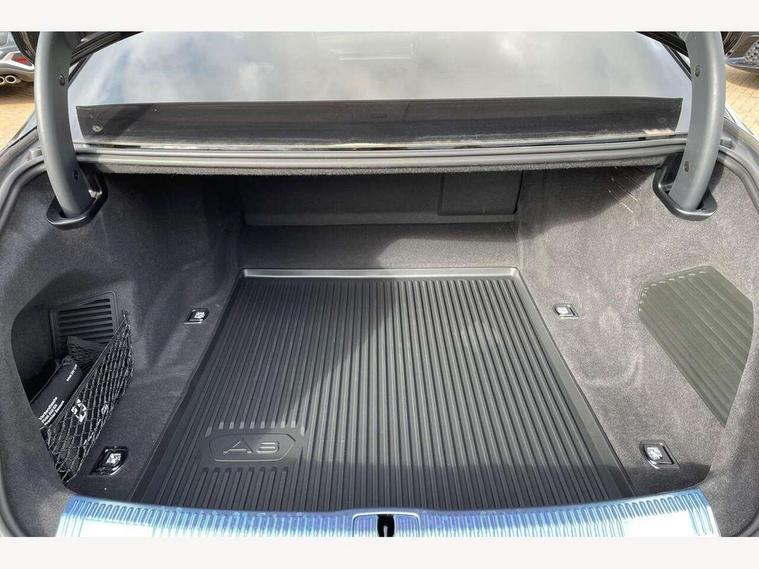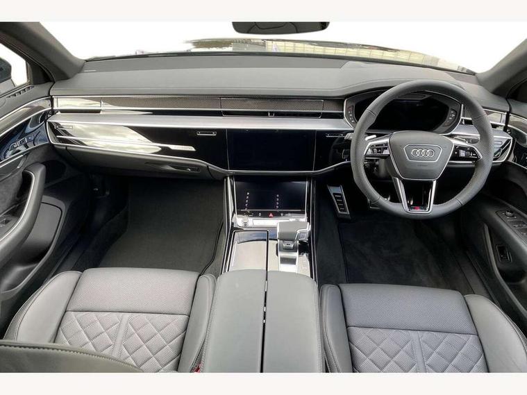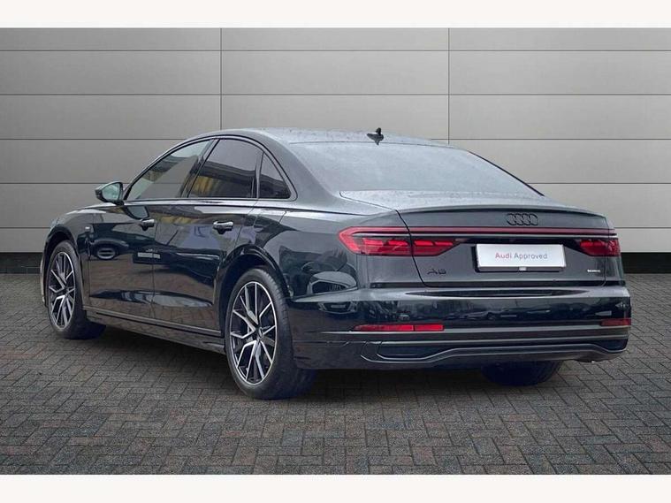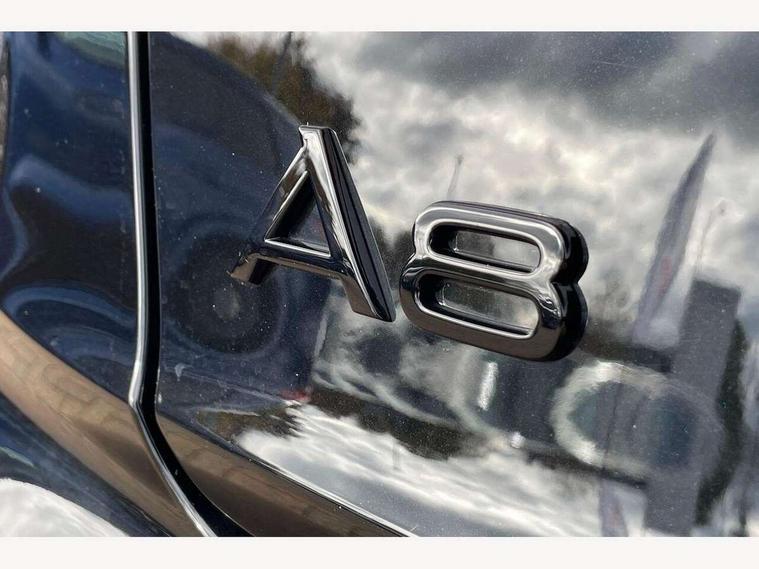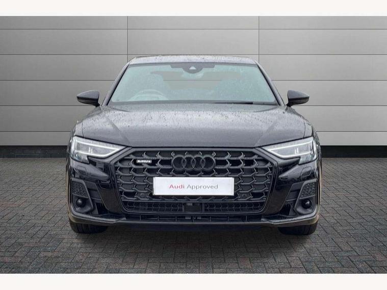 'Lights On' Reminder warning buzzer, Adaptive cruise control with cruise assist, emergency assist, efficiency assist, swerve assist, turn assist and speed limiter, Audi connect safety and service (e-call), Audi drive select, Audi parking system plus with front and rear sensors, Audi smartphone interface with app store includes wireless Apple carplay, Android auto and Amazon alexa integration, Audi virtual cockpit, Bluetooth interface, Camera based traffic sign recognition, Convenience key, Electro - mechanical power assisted steering, Head up Display, MMI navigation plus with MMI touch + Twin touch screens with haptic feedback, Operating buttons in black, glass look with haptic feedback including extended aluminium look, Power door closure, Power operated tailgate, Rear view camera, Remote fuel filler release, Service interval indicator, 48V Mild hybrid technology, 8 speed transmission with hill hold assist, 82 litre fuel tank, Adaptive air suspension, Quattro all wheel drive with self locking centre differential, Audi music interface, Audi sound system, DAB digital radio module, MMI radio plus, USB connection, Acoustic double glazing, All-weather, manoeuvring, position, static cornering, turning and motorway lights with automatic dynamic headlight range control, Audi space frame, Auto dimming rear view mirror, Body colour bumpers, Electric front windows, Electric rear windows with isolation switch, Electric sunblinds for rear window and rear door windows, Electrically adjustable heated folding + automatically dimming exterior mirrors with memory function and integrated LED indicators, Front wash/wipe with interval delay, HD matrix LED headlights with dynamic light presentation and dynamic indicators, Headlight cleaning system, Heat insulating darkened glass in side and rear windows, Heat insulating glass windscreen, Heated rear window, Heated windscreen washer jets, High beam assist, LED brake lights, LED daytime running lights, LED third brake light, OLED rear lights with changeable rear light signature, Privacy glass, Rear boot, Rear side wing doors, Welcome/leaving lighting, 12V socket, 2 zone automatic air conditioning, 3 seat rear bench with centre armrest in 2nd row, 4 way electric lumbar support for driver and front passenger, Audi phone box light, Black cloth headlining, Centre console with cupholders, Comfort centre armrest front, Door pockets with bottle holder, Driver and front passenger side sunvisors with illuminated vanity mirrors, Dust/pollen filters, Electric front seats with memory function, Front floor mats, Glove compartment cooling, Heated front seats, Height/reach electric steering column with easy exit function, Illuminated door sill trims with aluminium inlays and S diamond emblem, Isofix child seat mounting points on outer rear seats, Leather gearknob, Passenger footwell storage net, Reading lights, Rear floor mats, Rear headrests, Roof mounted sunglasses holder, Single front passenger seat, Stainless steel pedals and footrest, Valcona leather upholstery with front sports seats in diamond quilted with S embossed logo, Black exterior styling pack - A8 Black Edition, Chrome exterior pack - A8, Extended LED Interior multi coloured light pack - A8, 3 point seatbelts on all rear seats, ABS/EBD, Active front headrest system, ASR traction control, Audi pre sense basic, Audi pre sense front, Black brake calipers, Driver/Front Passenger airbags, EDL traction control, Electromechanical parking brake, ESP, Extended pedestrian protection measures, Front and rear disc brakes, Front and rear side airbags with head airbag system, Front passenger airbag deactivation, Rear child proof door locks, Seatbelt reminder + electric contact in buckle + advanced safety equipment, Tyre pressure loss indicator, Warning triangle and first aid kit, Anti theft alarm tow away protection, Anti-theft wheel bolts and wheel loosening detection, Remote central locking, Carbon vector upper inlays, Dark matt brushed aluminium lower inlays,