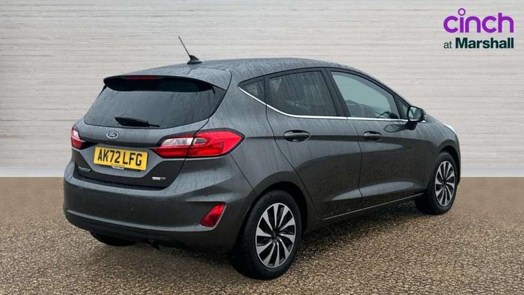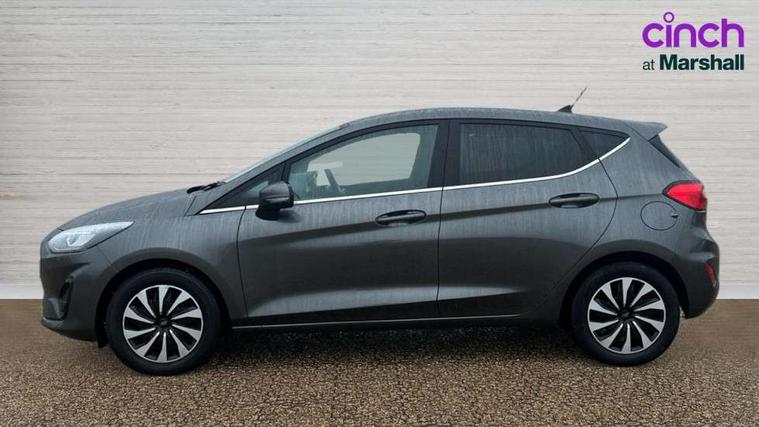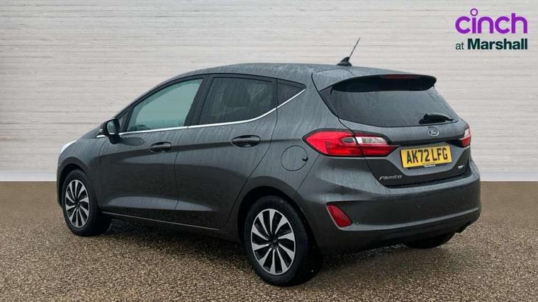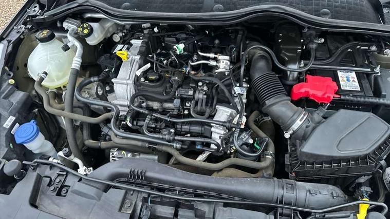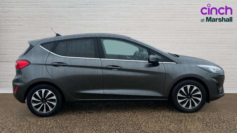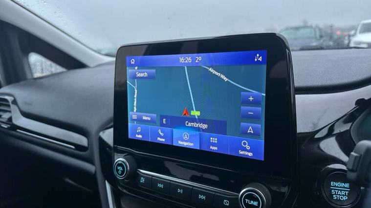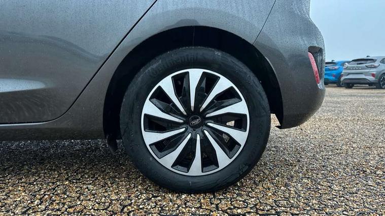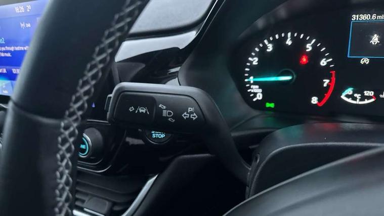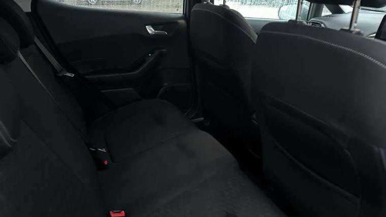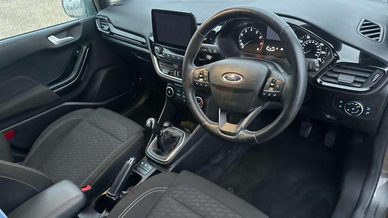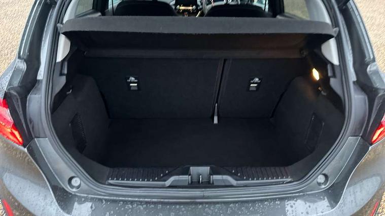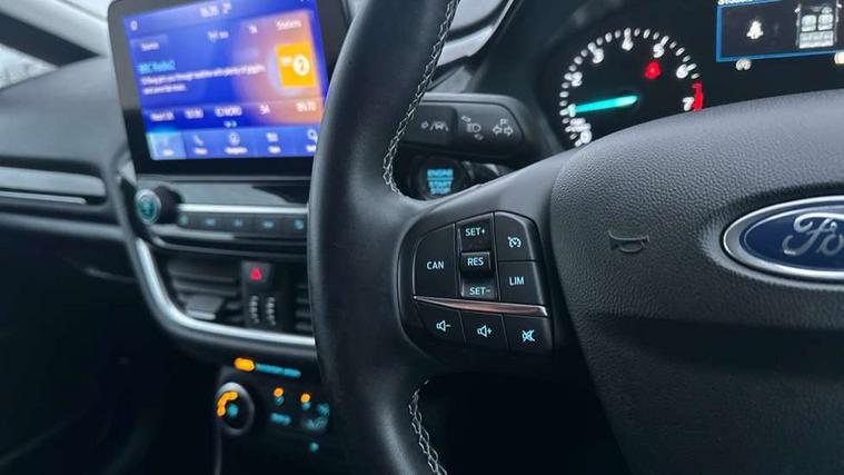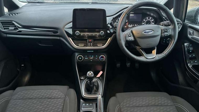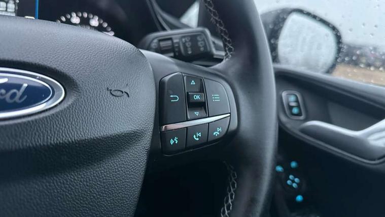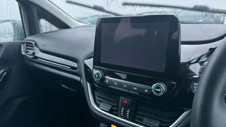 Bluetooth system, Electric power steering, Ford easy fuel, Ford SYNC 3 Navigation system incl 8" touchscreen, 7 speakers, FordPass connect, Apple carplay, android auto, voice control and emergency assistance, Rear parking distance sensors, Selectable drive modes (Normal, Sport, Track), Trip computer, 2 USB ports, Auxiliary input socket, DAB Digital radio, Steering wheel mounted controls, Body colour bumpers, Body colour door handles, Body colour rear spoiler, Body coloured electrically operated and heated door mirrors with side indicators, Chrome beltline trim, Chrome front grille, Chrome lower window surround, Cornering front fog lights, Electric front windows/one touch facility, Electric rear windows, Quickclear heated windscreen, Rain sensing wipers and auto dimming rear view mirror, Rear privacy glass, Rear wiper, 3 spoke leather trimmed steering wheel with audio control, 60/40 split folding rear seat, Adjustable head restraints, Boot carpet, Centre console with opening armrest, 2x cupholders, 12v and USB, Chrome inner door handles, Cloth upholstery, Footwell illumination, Front floor mats in velour, Front map reading lights, Front seat and rear pockets, Illuminated glovebox, Leather gaiter, Load area light, Luxury woven headliner, Manual 2 way passenger seat adjust, Manual 4-way driver seat adjust, Manual air conditioning, Overhead console with sunglasses holder, Pollen filter, Rake/reach adjustable steering wheel, Sensico wrapped steering wheel, NCAP Pack - Fiesta, 3 point seatbelts on all rear seats, ABS+EBA, Curtain airbags, Driver and passenger airbags, Drivers knee airbag, Electronic stability control with hill start assist, Front passenger airbag deactivation, Front side airbags, Seatbelt warning, Two tone horn, Tyre pressure monitoring system, Keyless start with 'Ford Power' starter button, MyKey system, Remote central locking & engine immobiliser, Thatcham Cat.1 alarm, 16" 10 spoke alloy wheels,