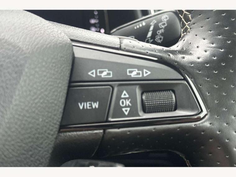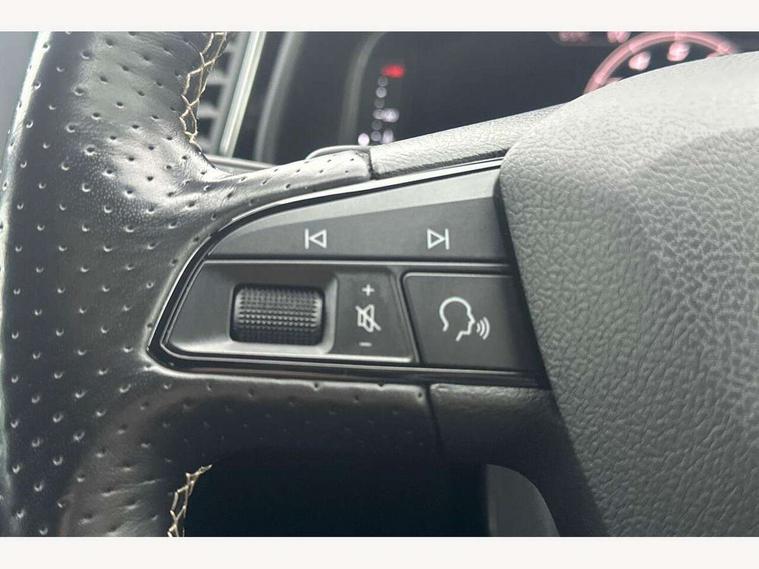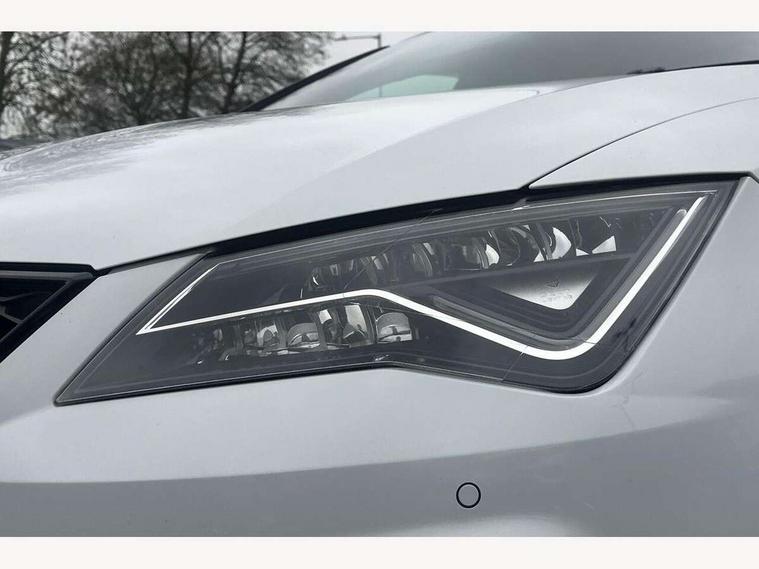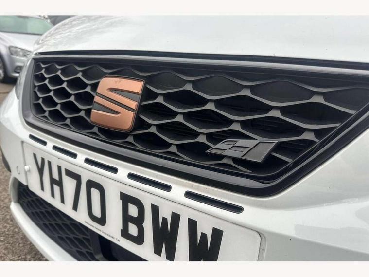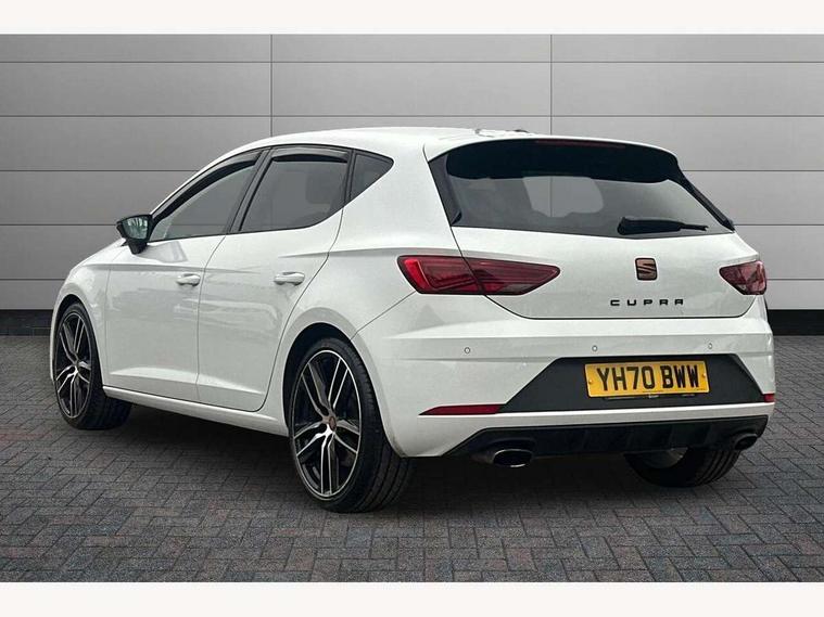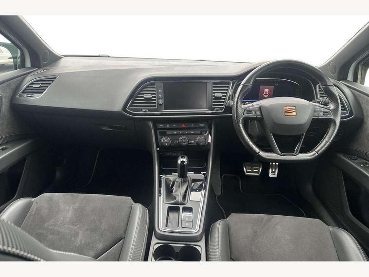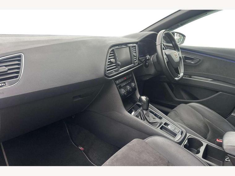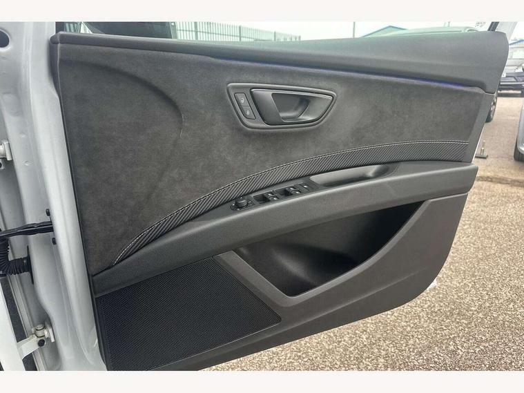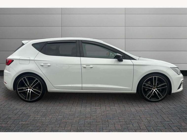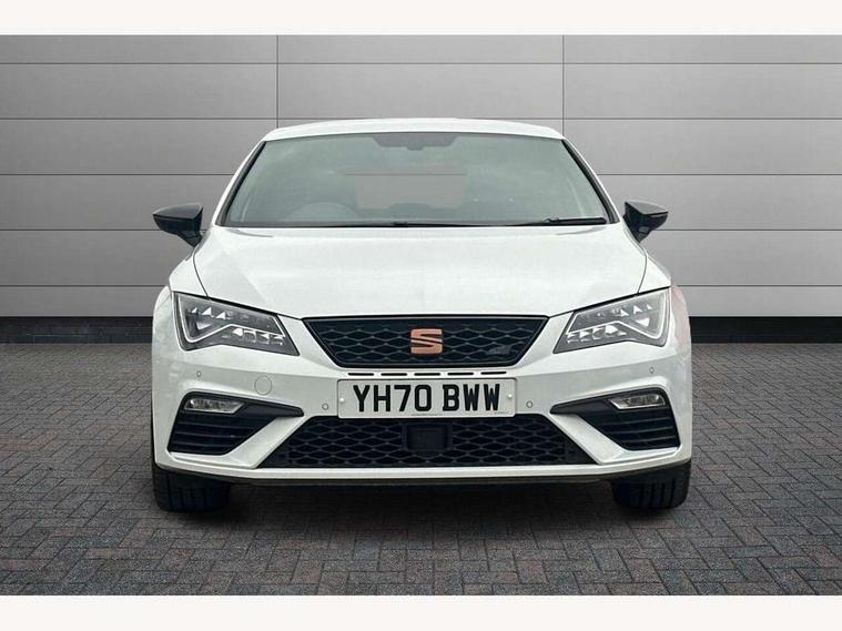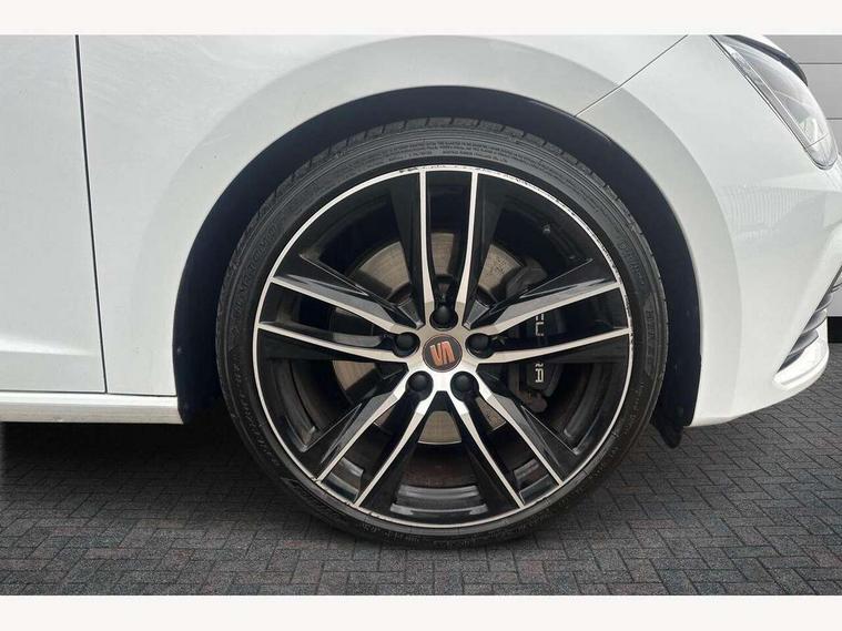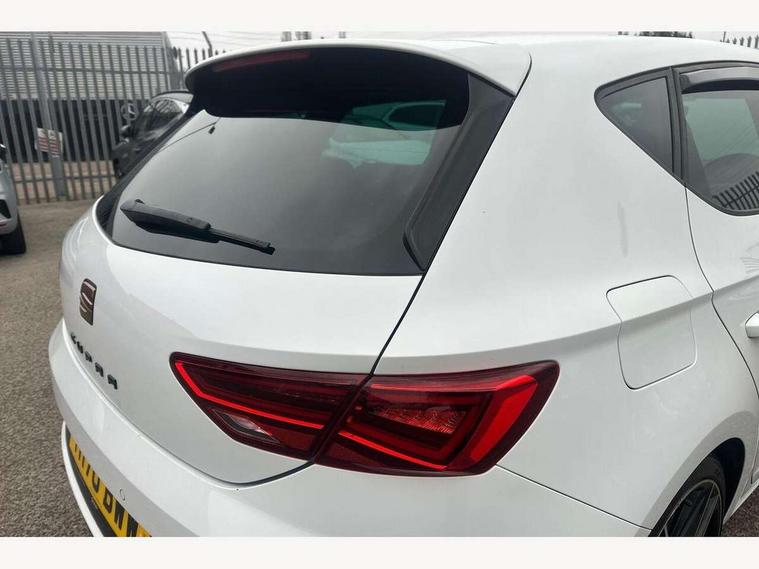 CUPRA performance interface, Digital cockpit, Electro-mechanical progressive power assisted steering, Front and rear parking sensors, Front assist with pedestrian protection, Full Link Smartphone Integration with Mirror Link, Apple Car Play, Google Android Auto with USB Type C cable for Apple and Android compatibility, Media system plus with 8" display, 4 USB, 8 speakers, CD, voice control, DAB, bluetooth and handsfree, steering wheel mounted audio and phone control, Navigation system 3D map display, high resolution colour driver display, two SD card slots, RPM, trip computer, outside temp gauge, instrument light brightness, low fuel warning light, lights on reminder, gearshift indicator, SEAT drive profile CUPRA with 4 mode (Cupra/Normal/Sport/Individual), throttle response, sound actuator and gearshift, SEAT logo boot release, Service interval indicator, Dynamic chassis control, Lowered sports suspension, Auxiliary input socket, SEAT USB media cable, Black front grille, Body colour door handles, Body coloured bumpers, Dark tinted rear windows, Electric folding door mirrors, Electric front/rear windows, Electrically adjustable and heated door mirrors, Exclusive Cupra front and rear bumpers, Full LED headlights with LED day time running lights + LED rear tail lights + LED licence plate lights and LED front and rear fog lights, Gloss black exterior mirrors with integrated LED indicators, Gloss black front grille frame, High gloss black finish B and C pillars, Illuminated aluminium front door sill with CUPRA logo, Rear wash/wipe, Visible dual exhaust pipes, 12v power point in centre console, 60/40 split folding rear seat with armrest, Additional heating and ventilation outlet in rear of centre console, Aluminium pedals, Black interior roof, Boot storage net, Cargo rings in boot, Driver and passenger seat height adjust, Driver and passenger sun visor, covered and illuminated mirror, driver sun visor with card holder, Driver seat lumbar adjustment, Dual zone climate control, Dust/pollen filter, Flat bottomed perforated leather steering wheel with white stitching and CUPRA logo and leather gear knob, Front and rear head restraints, Front centre armrest with storage compartment, Front cupholders x 2, Front passenger seat lumbar adjustment, Front seatback storage pockets, Front sport seats in microsuede, Front/rear floor mats, Height adjustable front and rear headrests and third rear headrest, Height/reach adjust steering wheel, High centre console with integrated box & cup holder, rear air outlet, with armrest in front seats, Interior copper and black detailing, ISOFIX points in outer rear seats with top tether anchorage points, Luggage tie-down hooks, Multi-colour ambient interior lighting, Steering wheel gearshift paddles, Storage box under drivers and passenger seat, Convenience pack+ - Leon, 3 point seatbelts on all rear seats, ABS, traction control system and front differential lock system, Child proof door locks, Driver and front passenger airbags with front passenger airbag de-activation, front side, curtain, driver knee airbags, EBA, Electric handbrake, Electronic parking brake with auto hold, ESC with switch off key, Front and rear black brake calipers with cupra logo, Front seatbelt pretensioners, Front seatbelt reminder, Hill hold control, Multi-Collision braking, Tyre pressure monitoring system, 2 folding remote keys with window open/close function and boot opening/door mirror folding function, Central locking fuel filler cap, Engine immobiliser, Locking wheel bolts, Remote central locking + deadlocks, Volumetric alarm with back up horn, Gloss black interior detailing, 19" Cupra Machined alloy wheels 30/2, Space saver spare wheel,