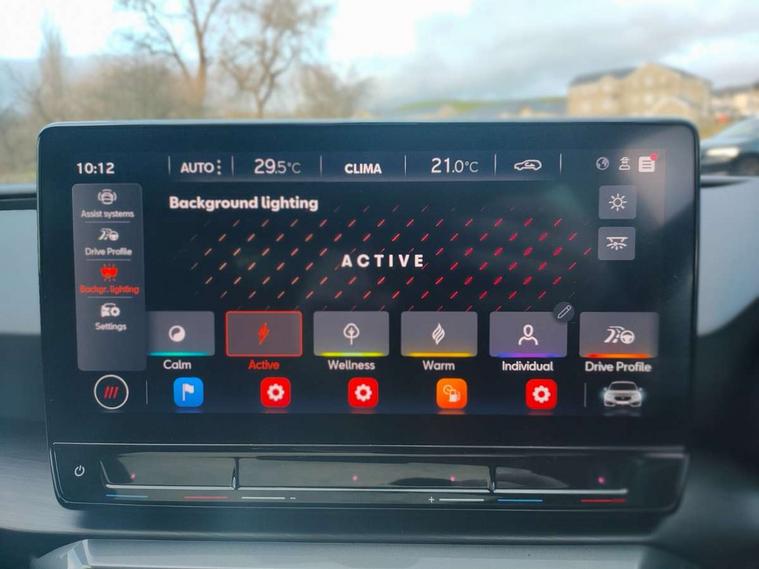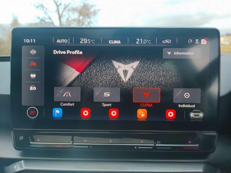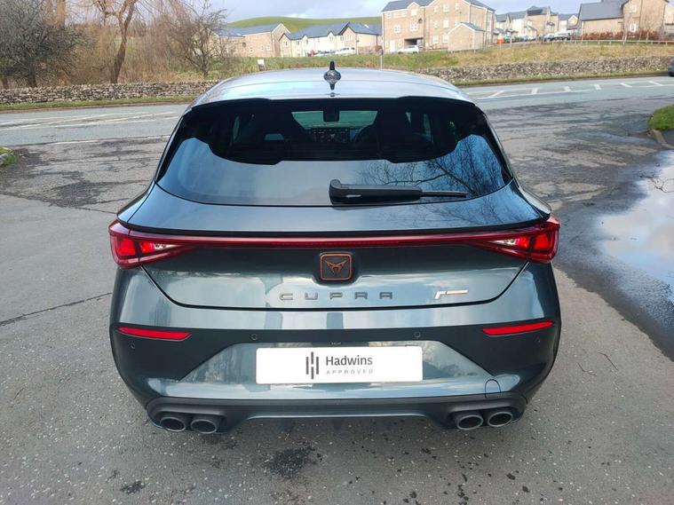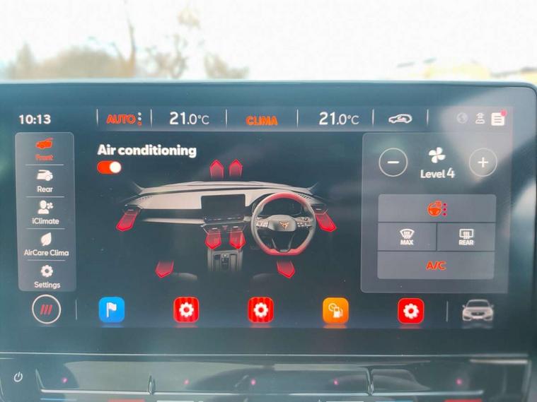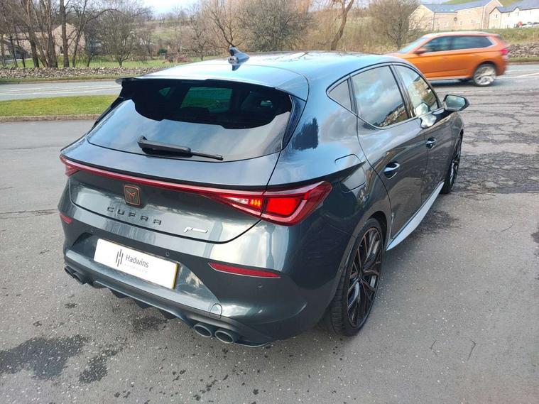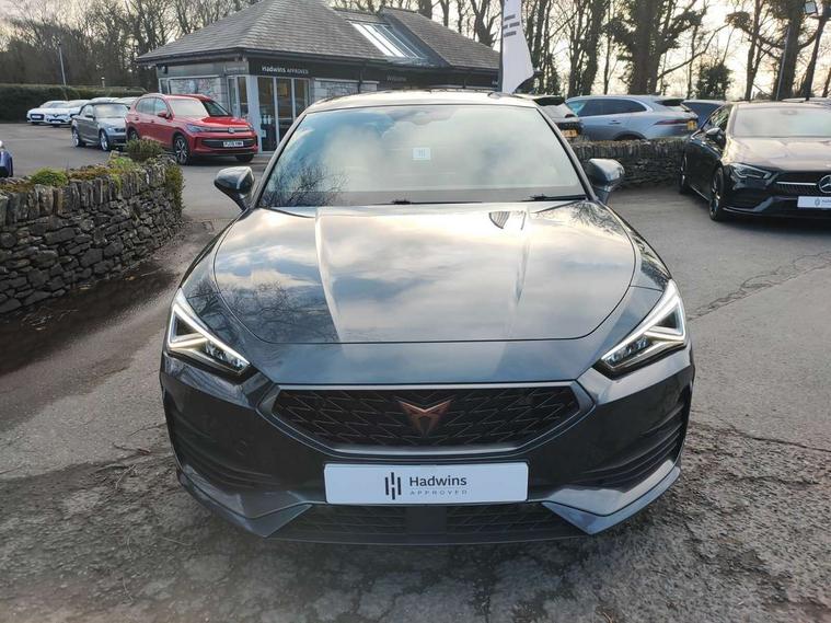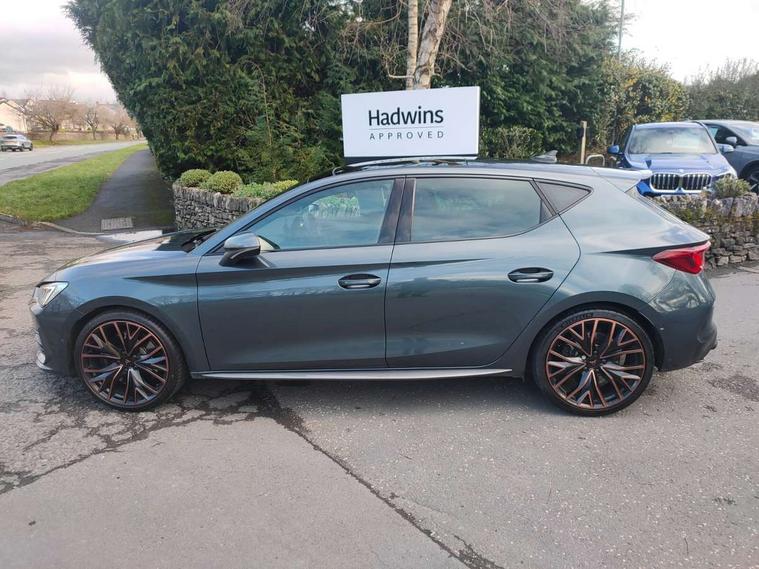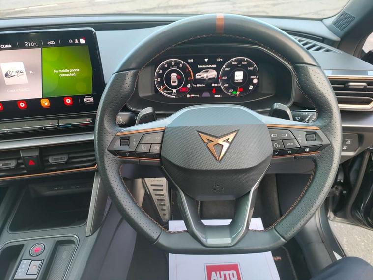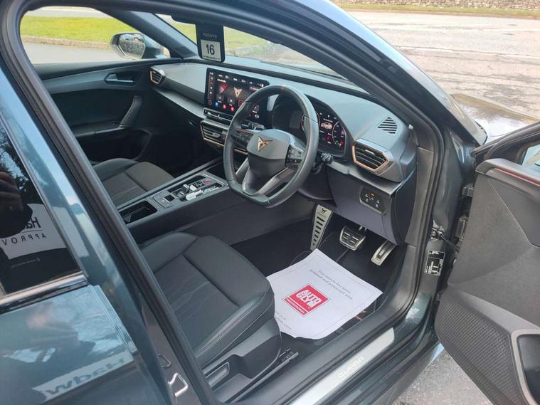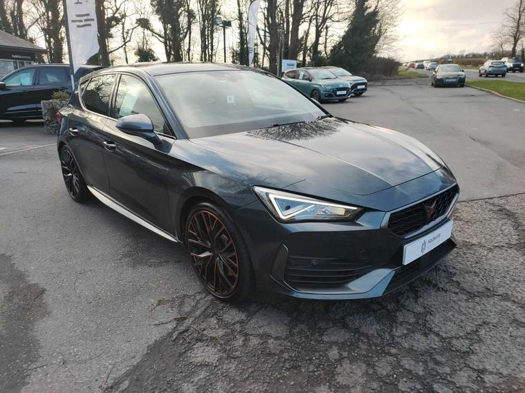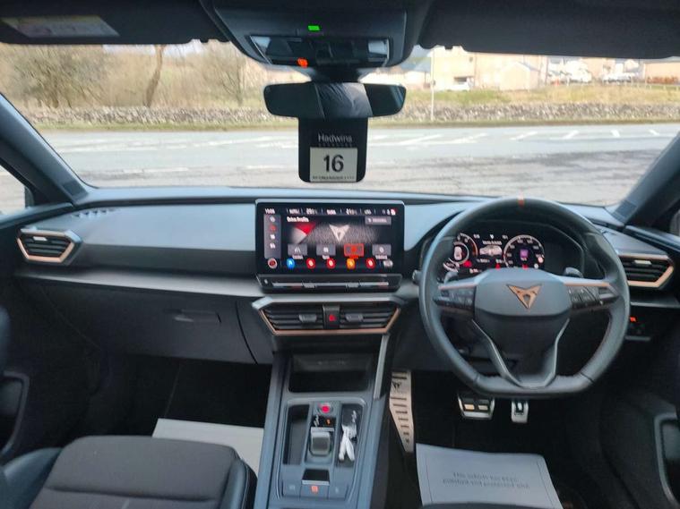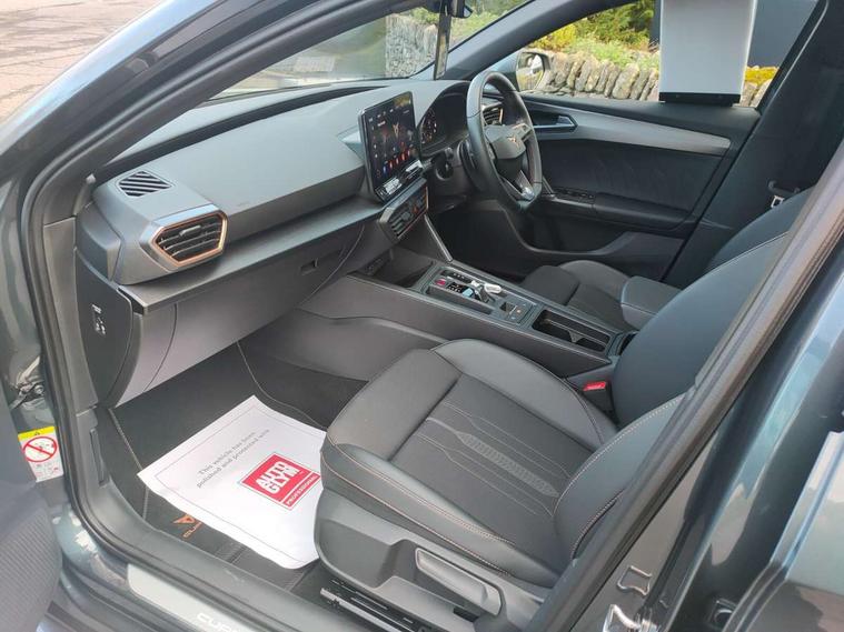CUPRA drive profile selection with 4 modes (Comfort/Cupra/Sport/Individual), throttle response and gearshift mode, Digital cockpit, E-call, Front assist with forward collision warning braking reaction to vehicles, pedestrians and cyclists, Full link smartphone integration with Mirror Link, wireless Apple CarPlay and wired Google Android Auto, Lane assist, Lockable tailgate, Park assist (inc front/rear parking sensors), Rear view camera, RPM, trip computer, outside temp gauge, instrument light brightness, low fuel warning light, lights on reminder, gearshift indicator, Service interval indicator, Start/stop system with regenerative braking, Wireless phone charger, Standard suspension, XDS electronic differential lock and dynamic traction support, Auxiliary input socket, Auto dimming rear view mirror, Body colour door handles, Body coloured bumpers, Cupra sports bumpers, Dark tinted rear windows, Electric front/rear windows, Electrically adjustable, heated and folding door mirrors, LED front fog lamps with cornering function, LED headlights with dynamic turn signals, tail lights, rear fog lights with rear coast to coast lighting, Panoramic sunroof, Rain sensing wipers, Rear diffuser with splitter and oval quad exhaust pipes, Rear side wing doors, Rear wash/wipe, Separate daytime running light with automatic headlight control and coming home feature, Third brake light, 12v power supply in centre console, 3 seat bench in 2nd row, 5 headrests, 60/40 split rear bench seat with armrest, Ambient lighting (glovebox, footwell, ambient lighting multicoloured), Black headlining, CUPRA Leather flat bottomed, heated, perforated steering and gearshift paddles, Cupra sports pedals, Driver/passenger manual seat height adjustment, Dust/pollen filter, Folding boot cover, Four x USB Type C ports (2 in front and 2 in rear), Front and rear reading lights X 4, Front centre armrest, Front seats manual lumbar adjustment, Height/reach adjust steering wheel, Illuminated interior front door sills, Interior wraparound lighting, ISOFIX points in outer rear seats with top tether anchorage points, Jack and tool kit, Luggage tie-down hooks, PVC/Cloth upholstery with copper stitching + Cupra embossed logo on headrest, Single front passenger seat, Sports bucket seats, Storage pockets on rear of front seats, Sunvisors with illuminated mirror, Three zone climate control, Design pack - Cupra Leon, Dynamic and comfort pack - Leon Cupra, Media system plus with navigation pack - Leon Cupra, 3 point seatbelts on all rear seats, ABS, Brake control system - ESC and brake booster, Child proof door locks, Cupra black brake calipers, Driver and front passenger airbags with front passenger airbag de-activation, front side and curtain airbags, Electronic parking brake, Extended safety system - seat belt tensioner, window closure and hazard lights, Hill hold control, Rear disc brakes, Seat belt reminder for front and rear seats, Tiredness recognition system, Tyre pressure monitoring system, Anti theft alarm system with interior monitoring in cab, backup horn and towing protection, KESSY Advanced - Keyless start, keyless entry, Locking wheel bolts, Chrome and copper interior detailing, 19" Performance satin black and copper alloy wheels with 91Y tyres, Space saver spare wheel,