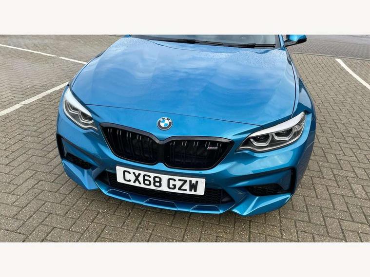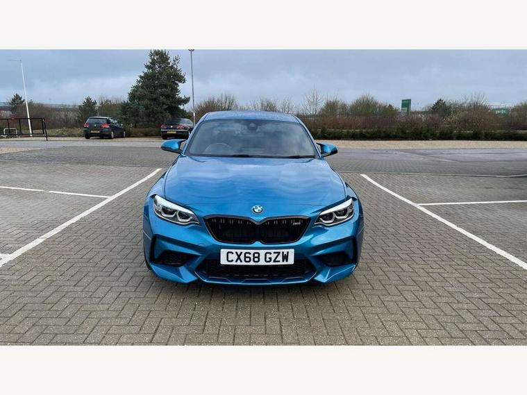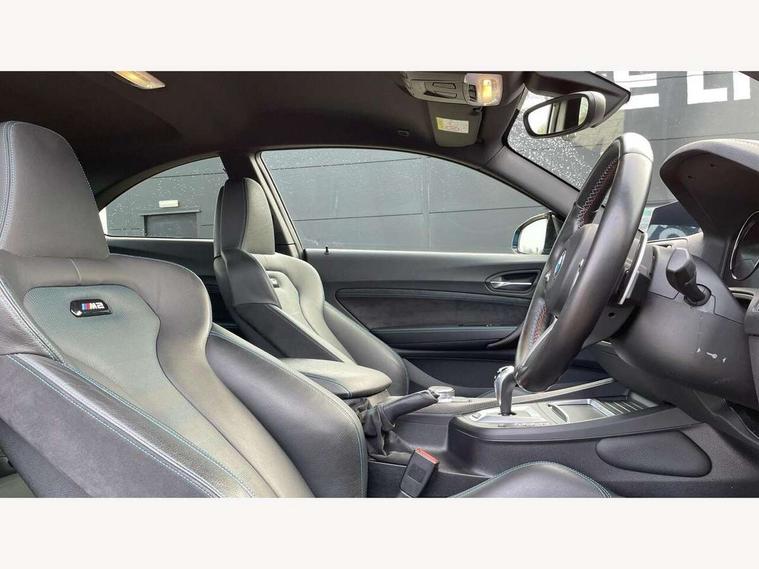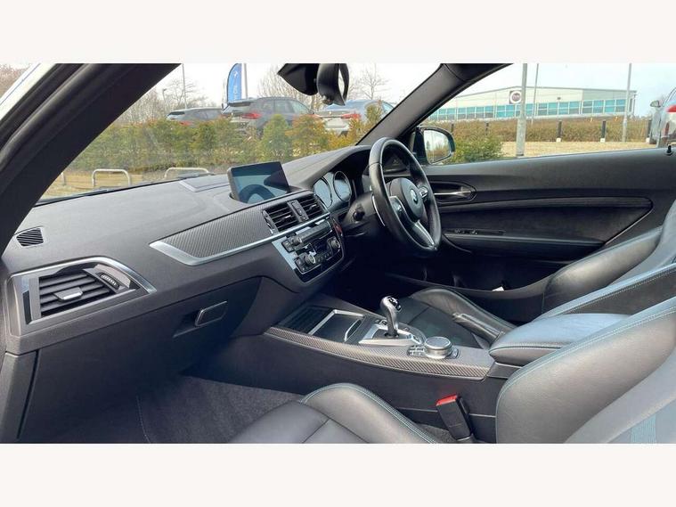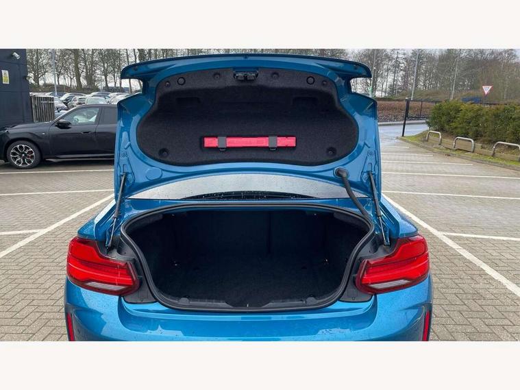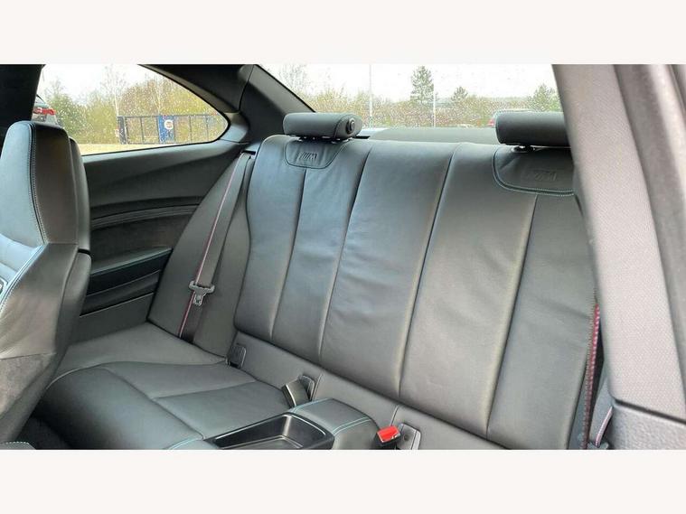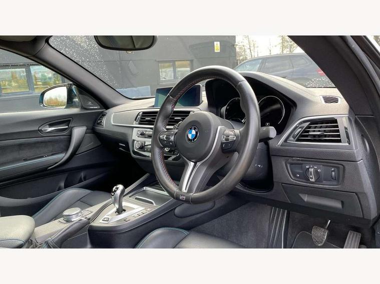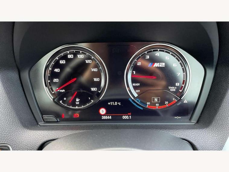 Auto start-stop, BMW Online services, BMW remote services, BMW Teleservices, Cruise control with braking function, Door/boot open warning, Front and rear Brake pad wear indicator, Front/rear Parking distance control, Instrument cluster with speedometer with miles per hour read out, tachometer and fuel gauge, Lights on warning by audio warning signal when ignition is switched off, M Servotronic power steering, Oil sensor for level and grade, warning by check control system, Oil temperature display via on board computer in instrument cluster, On board computer - average speed+fuel consumption, service interval, clock/date, odometer/trip meter, outside temperature display and ice warning, Optimum shift indicator, Personal Profile - automatic lock when driving away selectable, Real time traffic information, Speed limiter, Battery age recognition function, Drive performance control with ECO PRO comfort + sport mode, Engine cover with BMW roundel twin power turbo designation, M sport suspension, Oil dipstick, DAB Digital radio, 2 speed adjustable intermittent wipers with wash/wipe function, Automatic headlight beam throw control, Automatically dimming rear view mirror, Black chrome exhaust, Body colour bumpers, Body colour door handles, Body colour mirror caps, Body colour roof mouldings, Clear lenses direction indicator lights, Daytime driving lights, Direction indicator side lights integrated exterior mirrors, Dual dark chrome exhaust tailpipes, Dynamic brake lights, Electric windows - front and rear, with open/close fingertip control, anti-trap facility and comfort closing, Electrically adjustable and heated M specific exterior mirrors, Follow me home headlights, Front apron with large air inlets, Green tinted heat protection glazing, Headlight range control, Heated windscreen washer jets, High gloss black kidney grille with M double rod vertical slats and M2 badging, High gloss black M side strakes with M2 designation, High gloss shadow line, High level third brake light, LED rear lights, LED welcome home lights, M rear spoiler, M2 specific aerodynamic body styling with unique kidney grille, front bumper, rear bumper and side skirts, Rain sensor with automatic headlight activation, Rear bumper with high gloss black finish, Rear fog lights, Reversing light in rear light cluster, Shark fin roof aerial, Visible VIN plate, Welcome lighting, 12V power socket in centre console, 12V power socket in passenger footwell, 4 grab handles, Anthracite headlining, Anthracite Velour floor mats, Conditioned based service, Dakota leather upholstery, Driver and front passenger lumbar support, Folding rear seat head rests, Folding storage compartment with glasses holder + coin tray, Front and rear side armrests integrated into door trim, Front door sill finishers with M designation, Front door storage bins, Front head restraints, Front sliding armrest, Glove box handle with chrome surround, Isofix child seat for two outer rear seats, Leather gearknob, Leather handbrake lever, Luggage compartment access via BMW roundel, M multifunction nappa leather steering wheel, M Sports seats, Manually adjustment steering wheel column, Rear coat hooks, Rear folding head restraints, Storage compartment in rear centre console, Two cupholders with sliding cover and inlay mat, Two extra lashing eyes in luggage compartment, Interior comfort pack - 2 Series/M2, Media pack - Professional - 2 Series/M2, Active differential brake (ADB), electronic differential lock in DSC-OFF mode, Airbag - Front driver and passenger, front and rear head, front side, curtain head protection, manual deactivation of front passenger airbag possible, Anti lock braking system (ABS) with brake assist, Automatic Stability Control (ASC), Battery safety cut-off, BMW emergency call, Brake drying, Brake energy regeneration, Braking readiness, Cornering brake control (CBC), Crash sensor activating central locking release with hazard warning lights and interior lighting + battery safety cut-off, Dynamic brake control, Dynamic stability control + (DSC+), Dynamic Traction Control - DTC, Front pyrotechnic belt tensioners and belt force limiter, rear coaded belt buckles, Hill start assist, M dynamic mode, M Sport seatbelts, Seat belt security check for driver and front passenger, Side impact protection, Twin horns, Tyre pressure monitoring with 3 level warning strategy, Warning triangle and first aid kit, Central locking switch for all doors, fuel filler cap and luggage compartment, Check control system for monitoring of lights and door/luggage compartment open warning, Drive away door locking, Locking wheel bolts, Remote control including integrated key with blue insert, Thatcham category 1 alarm system with remote control and engine immobiliser, Carbon fibre interior trim with black high gloss finish, BMW mobility system, Reduced rolling resistance tyres,