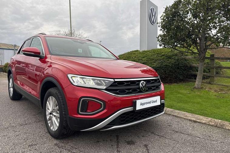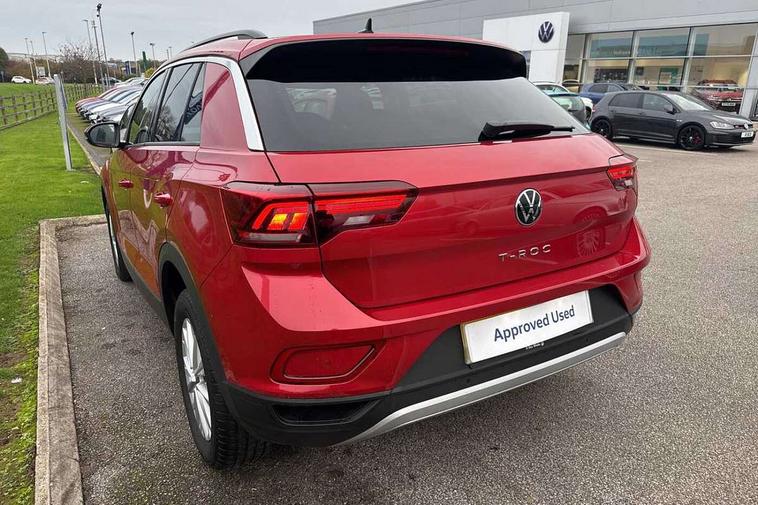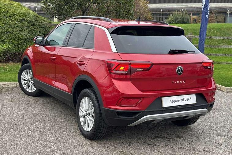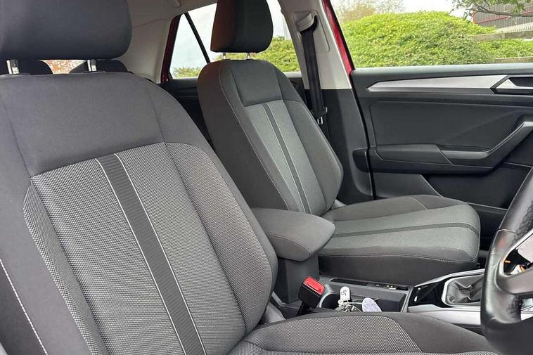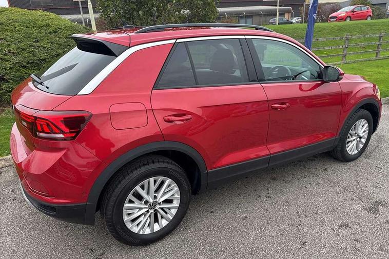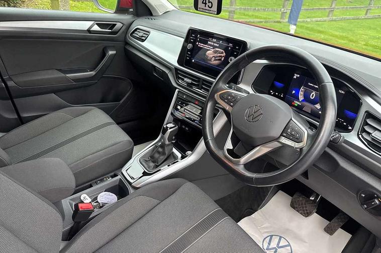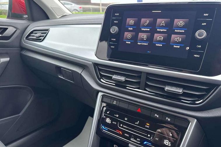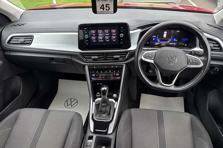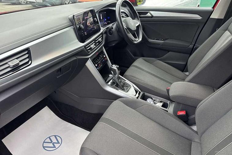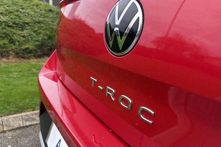 Bluetooth mobile phone interface, Driver alert system with fatigue detection, Driver tips and journey analysis, Emergency call service, Lane keeping system Lane Assist, Modified key software - reduce switch off time for key status change to Long no motion, Online services, Park assist including front and rear parking sensors, Power assisted speed sensitive steering, Service interval indicator, Tailgate/trunk lid release from outside, Think blue trainer driver tips and journey analysis, Warning sound and light for front seatbelts unfastened, Wireless app connect, Battery regeneration during braking, Front shock absorption, Rear shock absorption chassis with increased ride height, Start/stop function with battery regeneration, DAB Digital radio, Diversity antenna for FM reception, Front and rear 6 speakers, Music playback - MP3, WMA and AAC files, Premium USB cable in choice of either Apple or Android smartphone compatibility, SD card slot, Simultaneous pairing of 2 compatible mobile devices, Title and cover art display, We Connect and We Connect Plus functionality, 3rd brake light, Auto dimming interior rear view mirror, Automatic hazard lights activation under emergency braking, Automatic headlight control with LED separate daytime running lights with coming/leaving home function, Black roof rails, Body coloured bumpers and radiator grille with chrome trim and front fog lamps with chrome bezel, Body coloured exterior mirror housings and door handles, Extended roof spoiler, Exterior mirrors aspherical on driver side, convex on front passenger side, External USB type C socket and charging sockets, Front windscreen wiper with intermittent wipe and 4 position delay, Heated rear window, LED Headlights, LED rear combination lamps, LED rear number plate lights, LED tail lamp rear comination lamps, Power windows with comfort operation and circuit breaker, Rain sensor, Rear exhaust tailpipe, Rear fog light on one side and reversing lights on both sides, Rear side wing doors, Rear wash/wipe with intermittent wipe setting, Remote electrically foldable door mirrors, puddle lights and reverse activated passenger's door mirror, 12V power socket in centre console, 3 rear head restraints, 3 seat bench in 2nd row, 4 load lashing points in luggage compartment, Air care climatronic air conditoning system with active combination filter and 2-zone temperature control, Ambient lighting with mirror logo projection, Cloth upholstery, Door and side trim panel in cloth, Drawer under drivers seat, Driver/front passenger seat height adjustment, Front centre armrest, Front comfort sports seats, Front cupholders x 2, Front reading light, Instrument lighting, white adjustable panel illumination, Interior light delay, Isofix child seat preparation, Leather gearshift handle, Load-through provision with cup holder when folded down ('Unsplit rear seat bench, split folding backrest, with centre armrest), Luggage compartment lighting, Lumbar support for driver's and front passengers seat, Non-folding front passenger seat backrest, Single front passenger seat, Storage compartment in left and right luggage area, Storage compartment in rear doors, Storage compartments in driver and front passenger doors, Sunvisors with illuminated vanity mirrors, Variable boot floor, height adjustable and removable, Driver assistance pack without proactive passenger protection - T-Roc, 3 point height adj front seatbelts + pretensioners, 3 point seatbelts in outer rear with ECE label, ABS, Child locks on rear doors, Driver and front passenger airbag with front passenger airbag deactivation, Driver and front passenger safety-optimised head restraints, Drivers seatbelt reminder, Electronic parking brake, Electronic Stability Control (ESC) inc EDL (Electronic Differential Lock) and ASR (Traction Control), Front and rear passengers curtain airbag system including front side airbags, Front assist with city emergency braking and pedestrian monitoring, Front disc brakes, Front seat side impact airbags, Hill start assist, Predictive pedestrian protection, Rear disc brakes, Single tone horn, Tyre pressure loss indicator, Volkswagen roadside assistance, Alarm with interior protection, Anti-theft alarm system with interior monitoring, backup horn, and towing protection, Remote central locking with SAFELOCK, radio remote control with 2 remote control folding keys, Pewter matt decorative inserts for intrument panel, centre console and door panels at the front, Trims for alloy wheels,