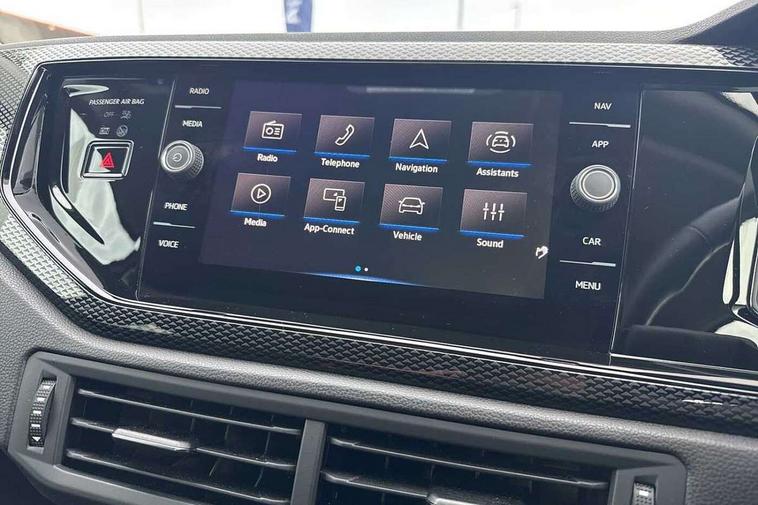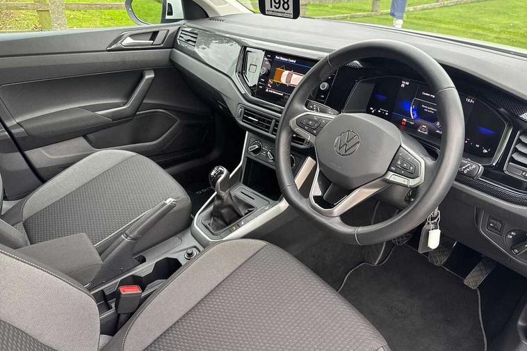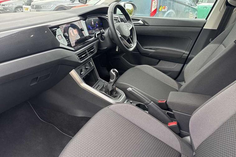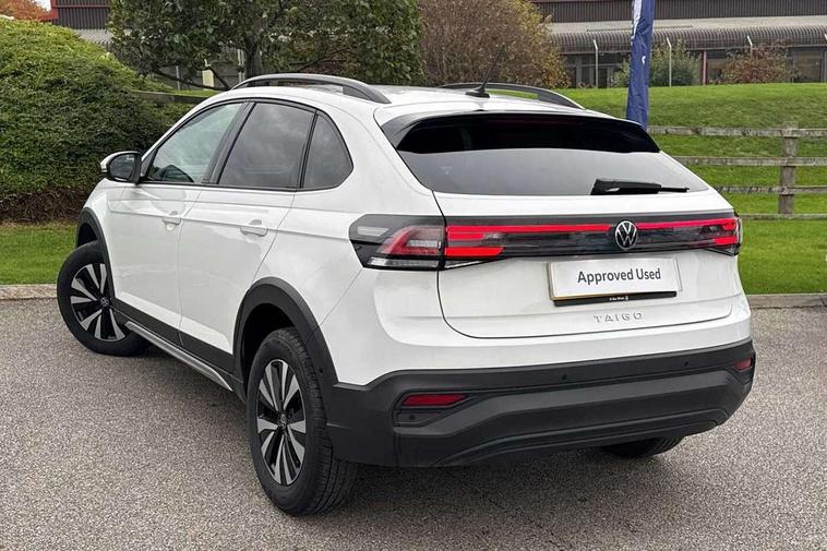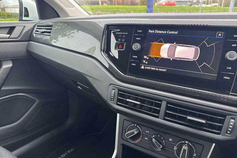 Advanced driver attention and drowsiness monitor, Dynamic road sign display, e-Call (emergency call), Power Steering, Predictive adaptive cruise control, Travel assist including emergency assist, Washer fluid level indicator, Wireless Charging including Bluetooth, Start-stop system with battery regeneration (recuperation - energy recovery during braking), WeConnect plus, Ambient lighting with logo projection, Aspherical driver's exterior mirror, Auto headlights, Body coloured bumpers, Body coloured exterior mirror housings and door handles, Electric windows, External USB type C socket and charging sockets, Heat insulating glass windscreen, LED rear combination lamp, LED third brake light, Left convex exterior mirror, Power folding adjustable/heated exterior mirrors and front passenger exterior mirror lowering function, Rear fog light on one side, reversing light on both sides, Rear side wing doors, Rear wash/wipe with intermittent wipe setting, 'Slash/ Austin' Cloth upholstery, 12V socket in centre console, 2 front reading lights, 3 rear head restraints, 3 seat bench in 2nd row, Black carpets, Child seat anchor for child seat system i-Size, 2x top tether and child seat anchor in front on front passenger side, Door and side trim panels in titan black, Driver and front passenger seat height adjustment, Front centre armrest, Handbrake lever handle in leather, Height and reach adjustable steering wheel, Leather trimmed gear knob, Leather wrapped multifunction steering wheel, Luggage compartment floor, Luggage compartment light, Lumbar support for driver's and front passengers seat, Seat covers in titanium black, Single front passenger seat, Split folding backrest with centre armrest and unsplit rear seat bench, Storage compartment under front seats, Sun visors with illuminated vanity mirrors, Chrome Package - Taigo, Drivers assistance pack - Taigo, Light and Sight pack including High beam assist - Taigo, 2 x 3-point seatbelts/outer rear seats with ECE label, 3-point seat belts in front with pretensioner and height adjustment, 3-point seatbelt for centre rear seat, Adaptive driver and front passenger airbags with passenger airbag deactivation function, Driver and front passenger safety-optimised head restraints, Electronic stability control, Extended and predictive pedestrian/ cyclist protection, Front and rear disc brakes, Front curtain and side airbags with center airbag, Hill start assist, Manual rear child locks, Single tone horn, Tyre pressure loss indicator, Anti-theft alarm system with interior monitoring, backup horn, and towing protection, Lava stone black gloss/matt decorative inserts in dash and front door panels, Low rolling resistance tyres,