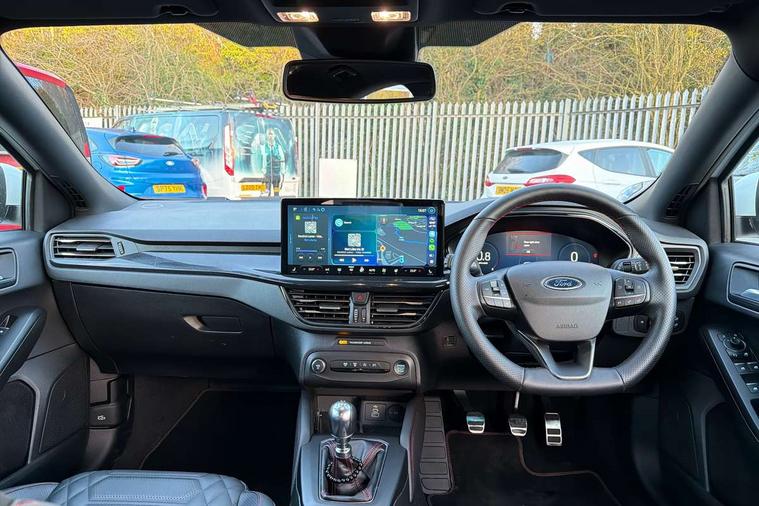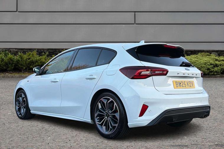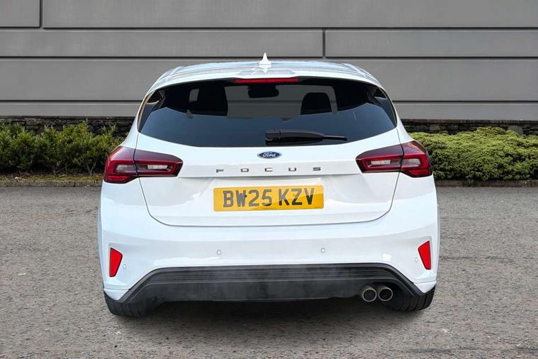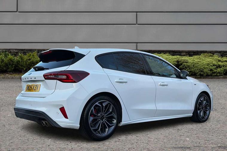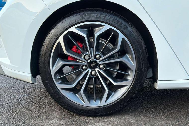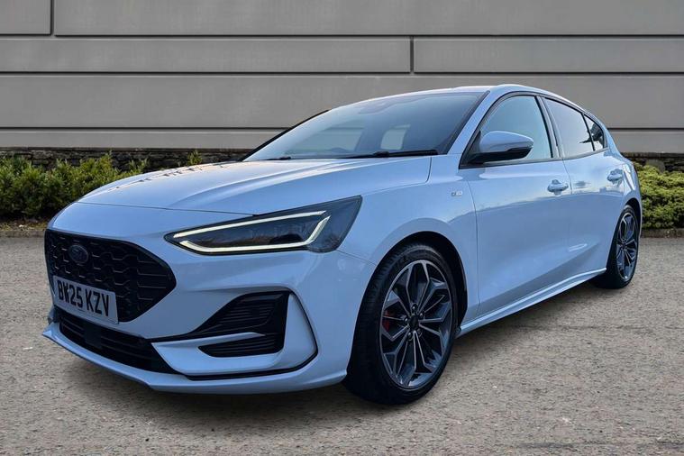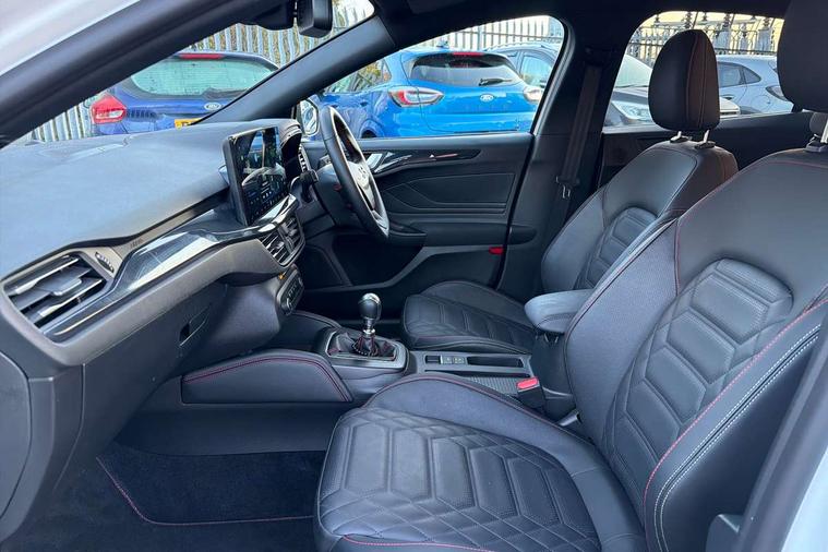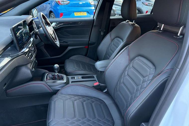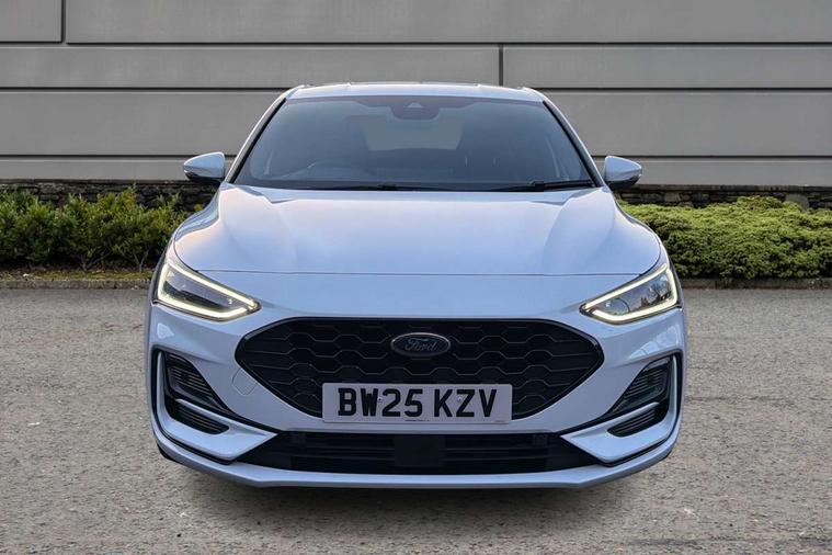 12.3" Digital instrument cluster, Bluetooth system, Digital clock, Easy fuel capless refuelling system, Eco mode, Ford SYNC4 Nav with 13.2'' touchscreen, DAB, Emergency Assistance, Apple Carplay & Android Auto, B&O Premium Audio with 10 speakers, FordPass Connect, Lane keeping system - lane keeping alert and lane keeping aid, PAS, Rev counter, Selectable drive mode, Service interval indicator, Trip computer, Wireless charging pad, Sports tuned suspension, 2 USB ports, Auto headlamps (on/off), Body coloured door handles, Electrically operated front and rear windows with one touch opening and closing, Electrically operated heated power fold door mirrors with puddle lamp with side indicators, Front variable intermittent wipers with electric wash, Heated rear window, LED daytime running lamp, LED rear lamps, LED third brake light, Polished twin tailpipe, Privacy glass, Quickclear heated windscreen, Rain sensor, Rear side wing doors, Tailgate wash/wipe, Unique ST-Line grille, full bodystyling kit, and large body coloured rear roof spoiler, 3 rear headrests, 3 seat bench in 2nd row, Dual zone electronic air temperature control, Full sensico premium upholstery, Height adjustable front headrests, Isofix child seat preparation, Load through ski hatch, Manual 2-way passenger seat adjust, Power 4-way driver seat adjust, with power lumbar adjust, Reach + rake adjustable steering column, Single front passenger seat, ST-Line Design pack - Focus, Winter pack - Focus, 3x3 point rear seatbelts, ABS+Electronic Brake force Distribution, Auto hold function, Driver airbag, EDL traction control, Electronic parking brake, Electronic stability control, Front and rear seatbelt reminder, Front inertia reel height adjustable seatbelts with pre-tensioners, Front passenger airbag, Front side airbags, Passenger airbag deactivate switch, Post collision braking, Pre collision assist with autonomous emergency braking and pedestrian/cyclist detection, Remote/power child rear door locks, Side curtain airbags, Three rear inertia reel lap/diagonal seatbelts, Tyre pressure monitoring system, Keyless entry and keyless start, MyKey system, Remote central locking & engine immobiliser, Thatcham alarm with power door dead locks, 18" 5x3 spoke pearl grey high gloss machined finish alloy wheels with mini spare wheel,