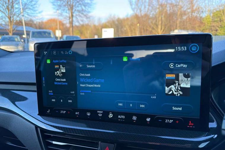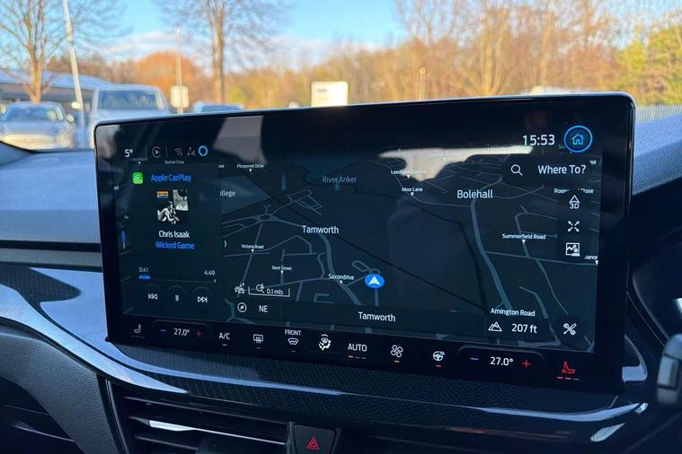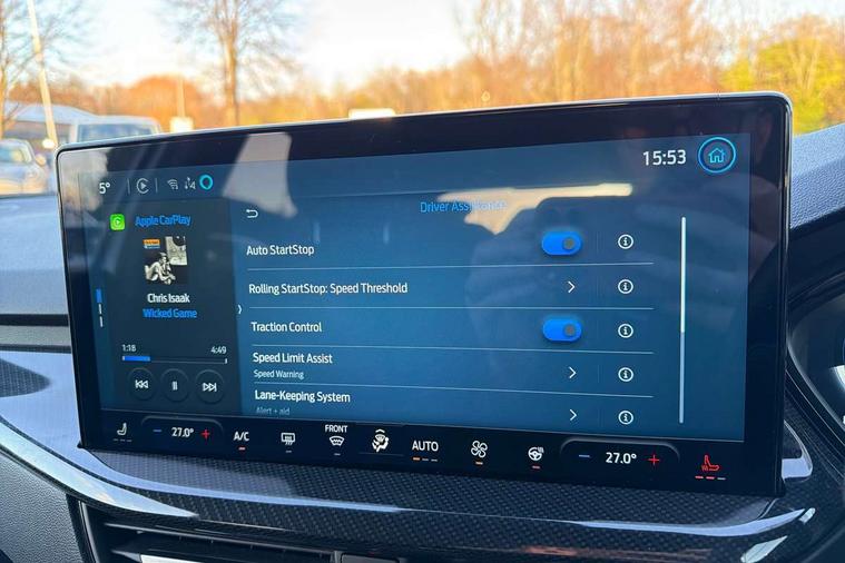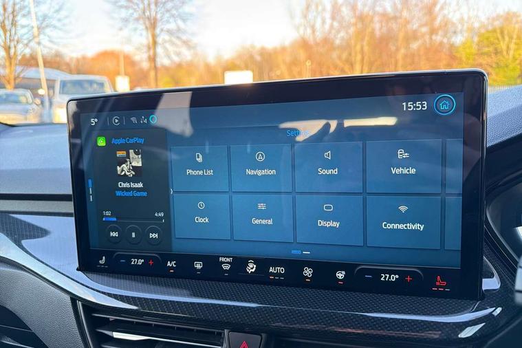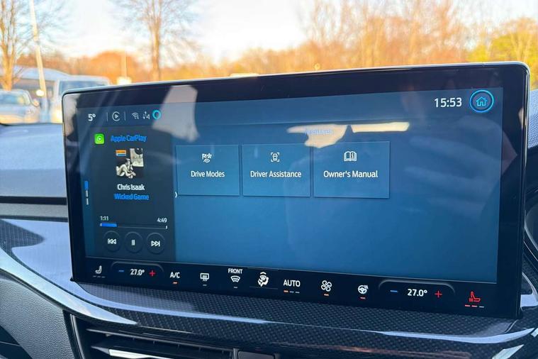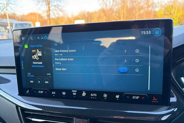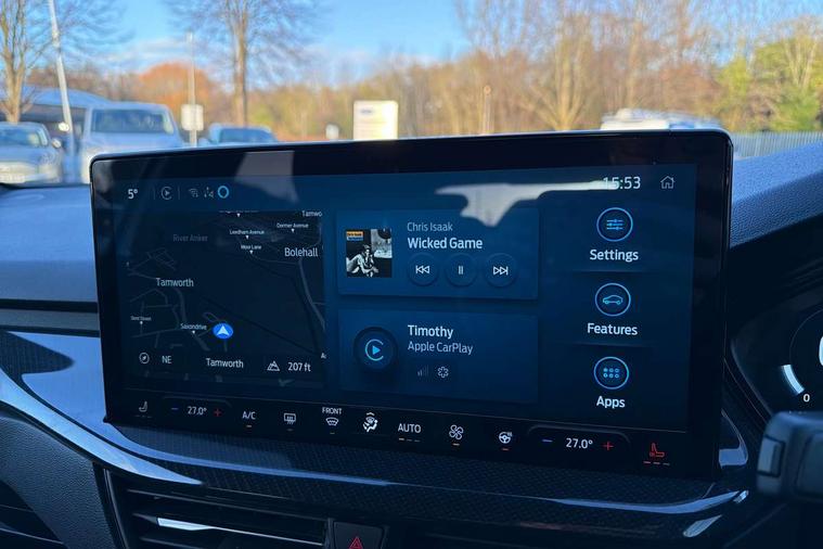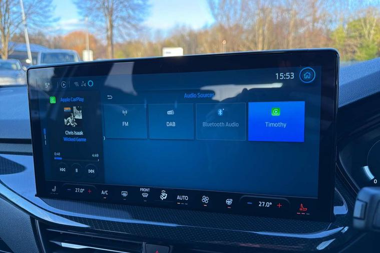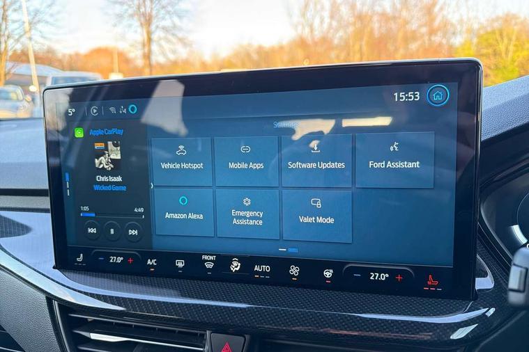 12.3" Digital instrument cluster, Bluetooth system, Digital clock, Easy fuel capless refuelling system, Eco mode, Ford SYNC4 Nav with 13.2'' touchscreen, DAB, Emergency Assistance, Apple Carplay & Android Auto, B&O Premium Audio with 10 speakers, FordPass Connect, Lane keeping system - lane keeping alert and lane keeping aid, PAS, Rev counter, Selectable drive mode, Service interval indicator, Trip computer, Wireless charging pad, Sports tuned suspension, 2 USB ports, Auto headlamps (on/off), Body coloured door handles, Electrically operated front and rear windows with one touch opening and closing, Electrically operated heated power fold door mirrors with puddle lamp with side indicators, Front variable intermittent wipers with electric wash, Heated rear window, LED daytime running lamp, LED rear lamps, LED third brake light, Polished twin tailpipe, Privacy glass, Quickclear heated windscreen, Rain sensor, Rear side wing doors, Tailgate wash/wipe, Unique ST-Line grille, full bodystyling kit, and large body coloured rear roof spoiler, 3 rear headrests, 3 seat bench in 2nd row, Dual zone electronic air temperature control, Full sensico premium upholstery, Height adjustable front headrests, Isofix child seat preparation, Load through ski hatch, Manual 2-way passenger seat adjust, Power 4-way driver seat adjust, with power lumbar adjust, Reach + rake adjustable steering column, Single front passenger seat, ST-Line Design pack - Focus, Winter pack - Focus, 3x3 point rear seatbelts, ABS+Electronic Brake force Distribution, Auto hold function, Driver airbag, EDL traction control, Electronic parking brake, Electronic stability control, Front and rear seatbelt reminder, Front inertia reel height adjustable seatbelts with pre-tensioners, Front passenger airbag, Front side airbags, Passenger airbag deactivate switch, Post collision braking, Pre collision assist with autonomous emergency braking and pedestrian/cyclist detection, Remote/power child rear door locks, Side curtain airbags, Three rear inertia reel lap/diagonal seatbelts, Tyre pressure monitoring system, Keyless entry and keyless start, MyKey system, Remote central locking & engine immobiliser, Thatcham alarm with power door dead locks, 18" 5x3 spoke pearl grey high gloss machined finish alloy wheels with mini spare wheel,