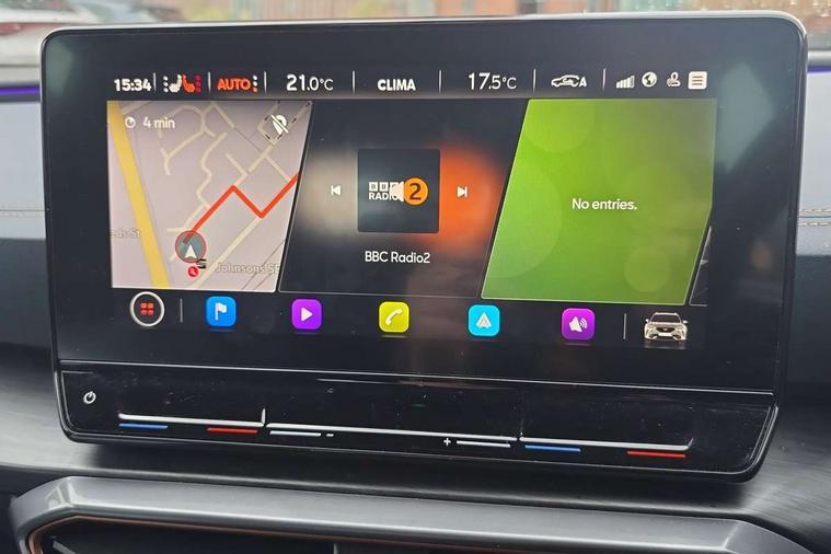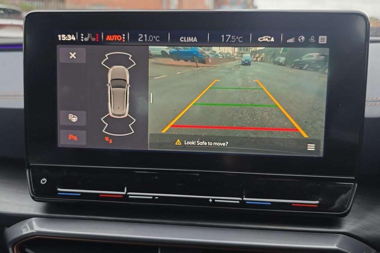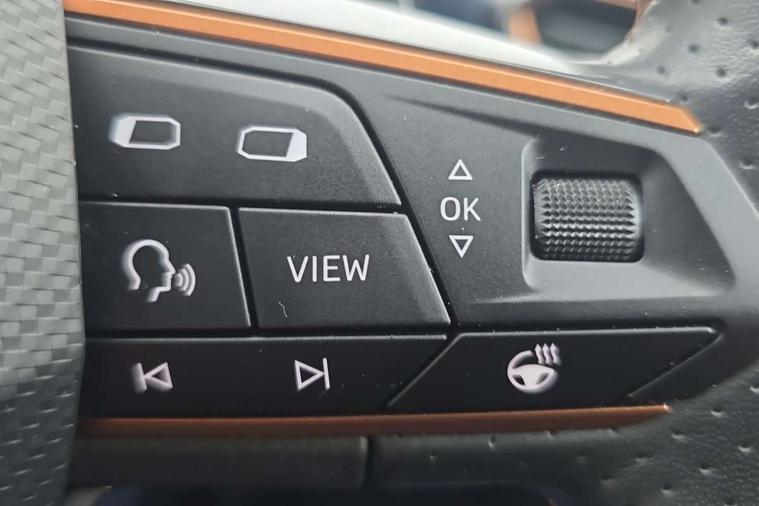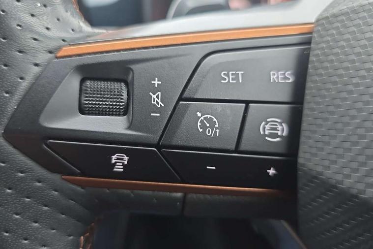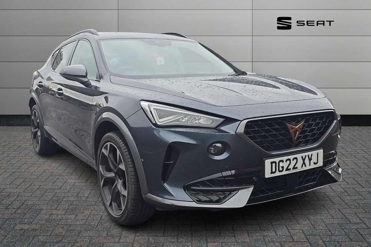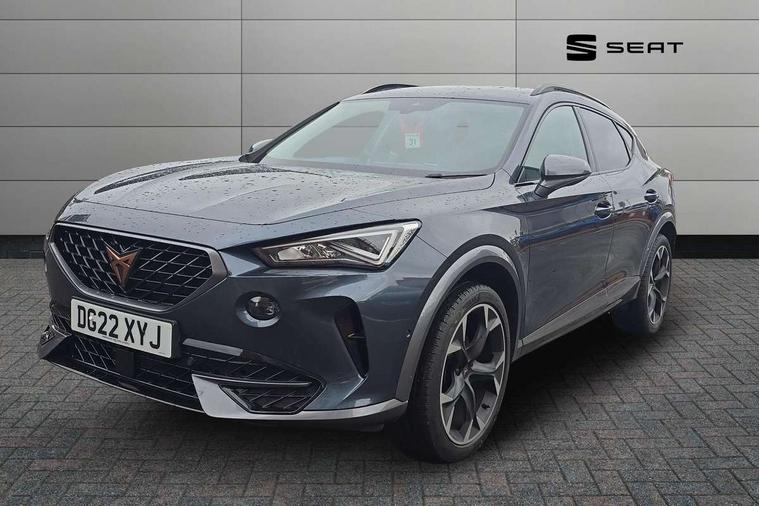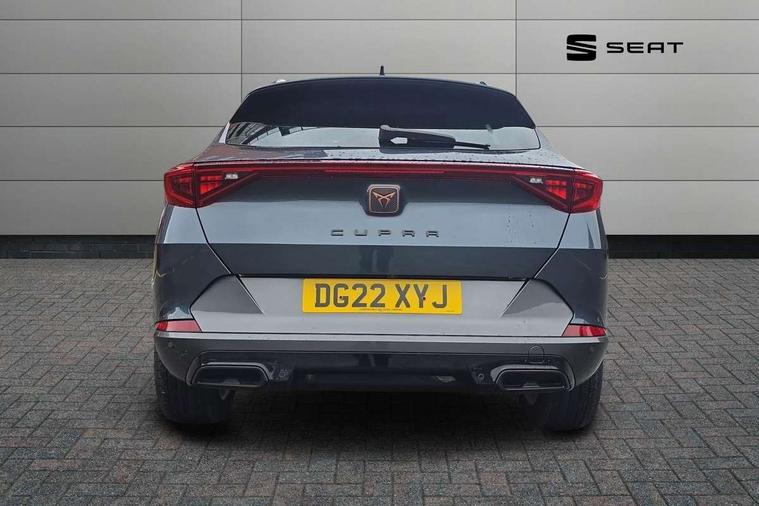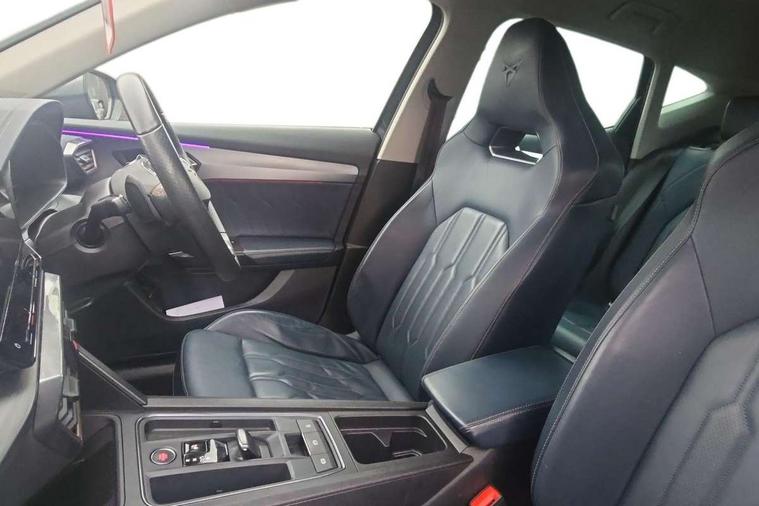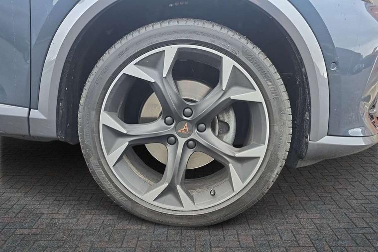 Digital cockpit and configurable dashboard, Driver alert system, Driving profile selection, E-call, Forward collision warning with automatic braking, Lane assist, Park assist (inc front/rear parking sensors), PAS, Predictive adaptive cruise control with speed limiter, Rear view camera, RPM, trip computer, outside temp gauge, instrument light brightness, low fuel warning light, lights on reminder, gearshift indicator, Service interval indicator, Start/stop system with regenerative braking, Wireless apple carplay, Wireless phone charger, Electronic locking differential and dynamic traction support, Standard suspension, 2 front and 2 rear USB type C sockets, Auxiliary input socket, DAB radio, Auto dimming rear view mirror, Body colour door handles, Body coloured bumpers, Dark grey wing mirror, Daytime running light with automatic headlight control and coming home feature, Dynamic headlight range control, Electric front/rear windows, Electrically adjustable heated and folding door mirrors with memory function, Front fog lamps with cornering function, Gloss black roof rails and window surrounds, LED Headlights, LED Taillights with dynamic indicator, Rain sensing wipers, Rear diffuser with black simulated exhaust pipes, Rear side wing doors, Rear wash/wipe, Third brake light, Tinted rear windows, Welcome lights, 12v power supply in centre console, 12V socket, 12v socket in loadspace, 2 front and 2 rear reading lights, 230V socket, 3 seat bench in 2nd row, 60/40 split rear bench seat with armrest and mechanical seat release, Dust/pollen filter, Front and rear head restraints, Front centre armrest, Height/reach adjust steering wheel, Illuminated interior front door sills, Illuminated sunvisor with mirror, Isofix, Leather multi function heated steering wheel with gear shift paddles, Luggage tie-down hooks, Single front passenger seat, Three zone climate control with control panel in rear, Variable luggage/load compartment floor, Wraparound lighting, Genuine Nappa leather Pack - Cupra, Navigation system pack with 10" navigation system - Formentor, 3 point seatbelts on all rear seats, ABS, Brake control system - ESC and brake booster, Child proof door locks, Driver and front passenger airbags with front passenger airbag de-activation, Electronic parking brake, Front and rear disc brakes, Front side curtain airbags, Hill hold control, Seat belt reminder for front and rear seats, Tyre pressure monitoring system, Anti theft alarm system, Keyless entry and start system (KESSY), Locking wheel bolts, Copper and aluminium interior detailing, 19" 'Exclusive' machined sport matte black and silver alloy wheels,