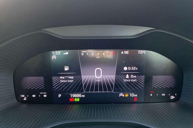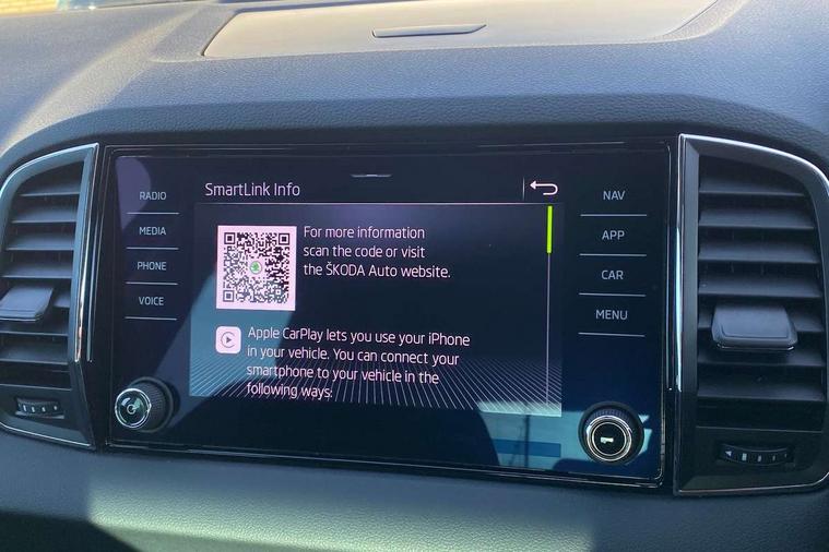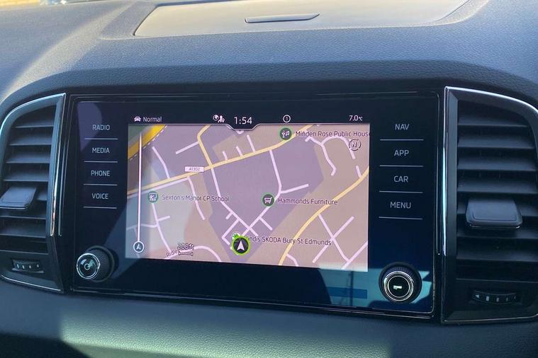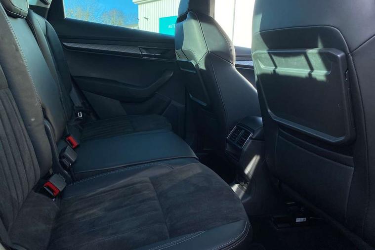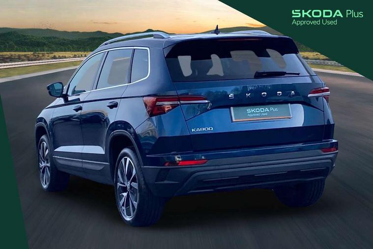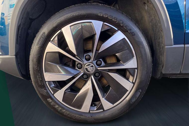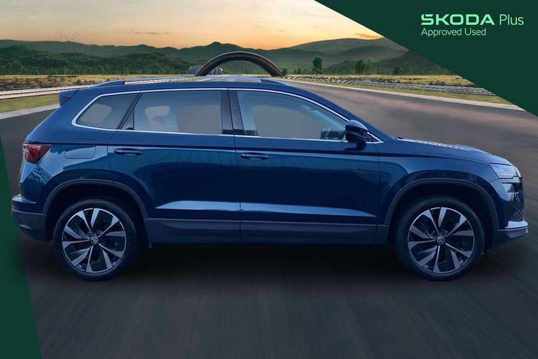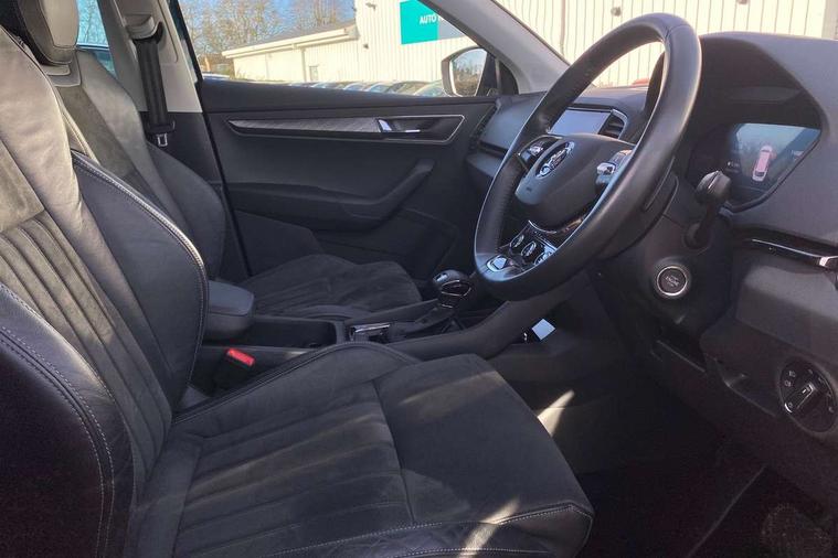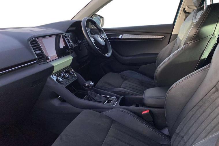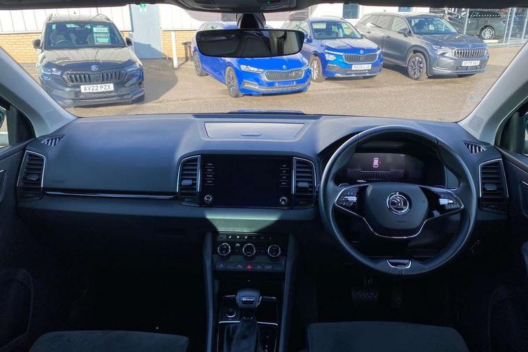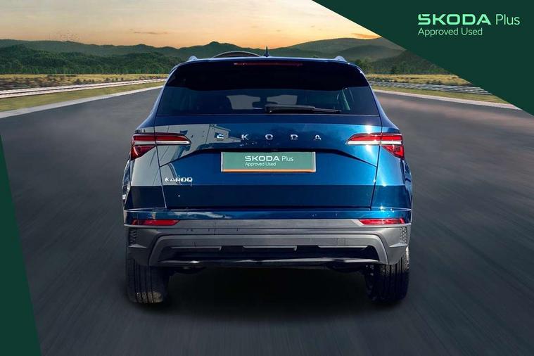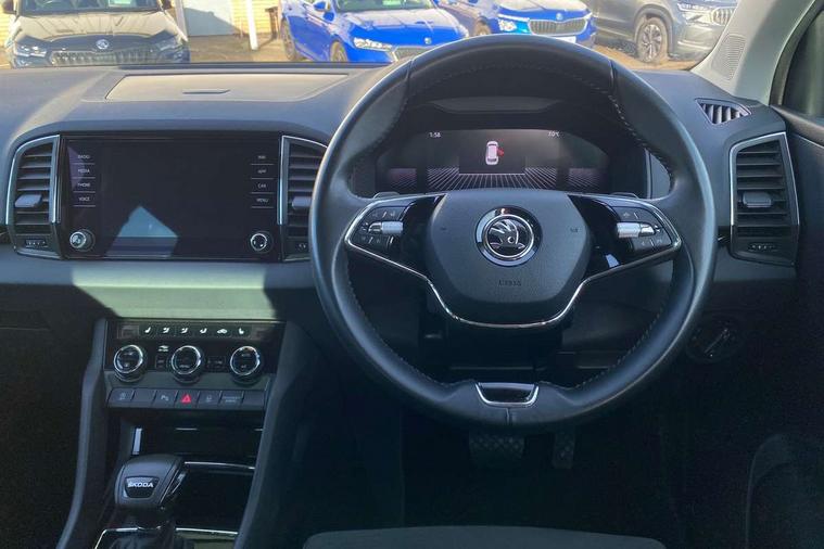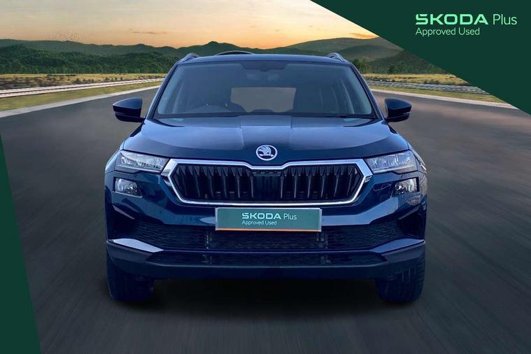 8" Digital display, Care connect, Driver fatigue sensor, Emergency services call system, Outside temperature gauge, Service interval indicator, SmartLink wireless for Apple and wired for Android, Start/stop system with regenerative braking, USB C Port x 2 in front centre console, 8 Speakers, DAB radio with Bluetooth, USB connection, Acoustic glass, Aero front windscreen wipers with intermittent function, Auto dimming rear view mirror with light and rain sensors, Black electric window control buttons, Body colour door mirrors and handles, Dynamic headlight range control with cornering light function, Electric front and rear windows with child proof lock, Heated rear windscreen, LED daytime running lights, LED rear lights with high functionality welcome effect and dynamic indicators, Light assistant (coming/leaving home/tunnel light), Plastic scuff plates, Privacy glass, Rear side wing doors, Rear spoiler, Rear window wiper with washer system and intermittent control, Safety reflectors on front doors, 1.5 litre bottle holders in driver and front passenger door panels, 12V socket in boot, 12v socket in front centre armrest with storage compartment and rear air vents, 2 Folding hooks and nets in boot, 2 spoke leather heated multifunction steering wheel with DSG paddles, 2 x Tablet holder, 3 rear height adjustable headrests, 3 seat bench in 2nd row, 4 foldable roof handles with rear coat hooks, Black floor carpet, Chrome inner door handles, Decorative door sills with KAROQ badging, Double sided boot floor, Foldable hooks in the boot, Front head restraints, Height adjustable front three point seats belts with tensioners, Height/reach adjust steering wheel, Ice scraper, Illuminated glovebox, Illuminated luggage compartment, Isofix child seat preparation for front passenger seat, Isofix child seat preparation outer rear, Manual lumbar support for front seats, Pen holder, Pollen filter, Rear boot cover, Rear reading lights, Rubbish bin door, Safety vest holder, Single front passenger seat, Storage box in upper central dashboard closed, Sunvisors with illuminated vanity mirrors, Textile floor mats, Ticket holder, VarioFlex seats with standard rear seat release, Chrome roof rails + chrome pack - Karoq, Parking pack - Karoq, Automatic door unlocking in case of crash, Automatic fuel cut off in case of crash, Child locks on rear doors, Driver airbag, Electronic parking brake with auto hold function, Emergency rear braking signal, ESC including ABS, MSR, ASR, EDS, HBA, DSR, RBS, MKB and traction control, Front side airbags, Hill hold control, Knee airbags, Passenger airbag with switch-off function, Pedestrian monitor, Seatbelt reminder signalisation and pretensioner for all seats, Three point seatbelts rear, Two tone horn, Tyre pressure display, Tyre pressure monitor, Alarm with interior monitoring, back up horn and tilt sensor with safe function, Electronic engine immobiliser, Keyless entry and start/stop, Remote central locking with 2 remote folding keys, Chrome framed air vents, 18" Procyon silver alloy wheels with anthracite aero inserts, Anti-theft wheel bolts protection, Storage on wheel cover, Tool kit,
