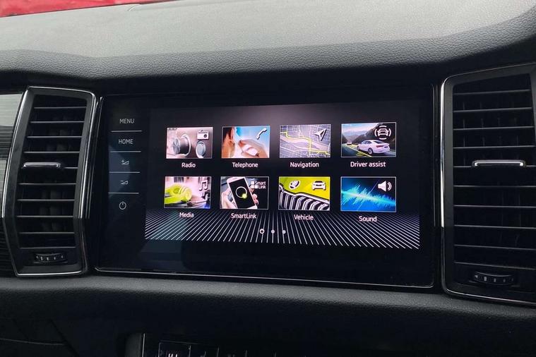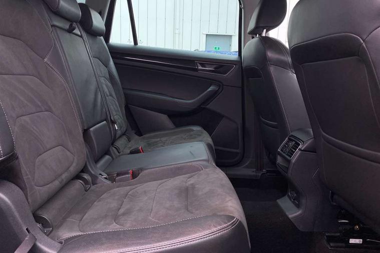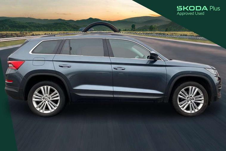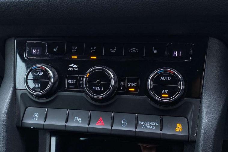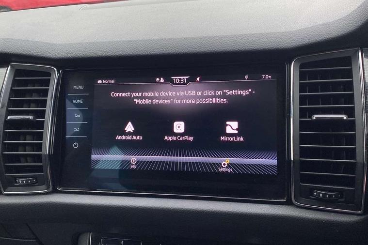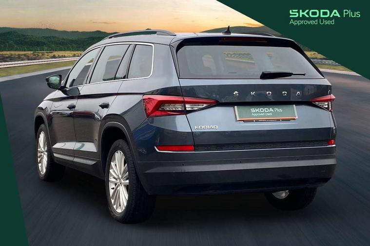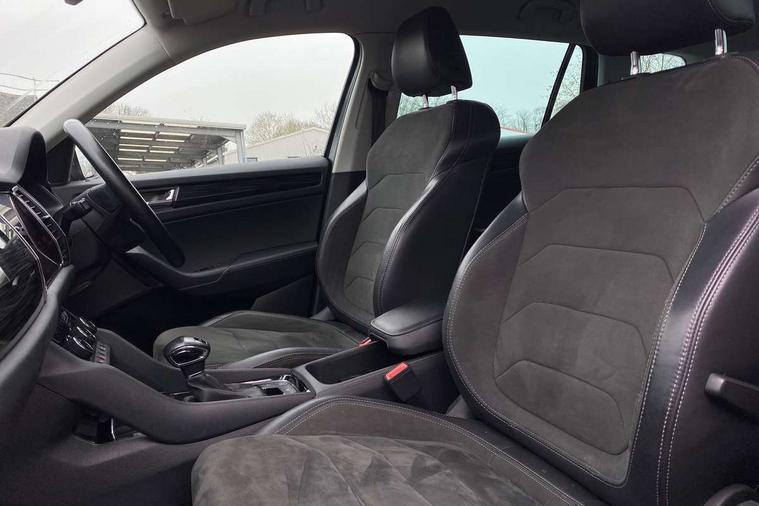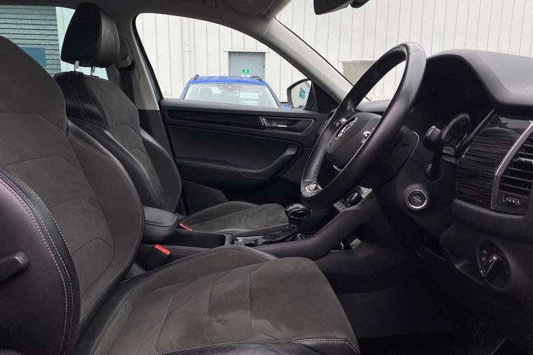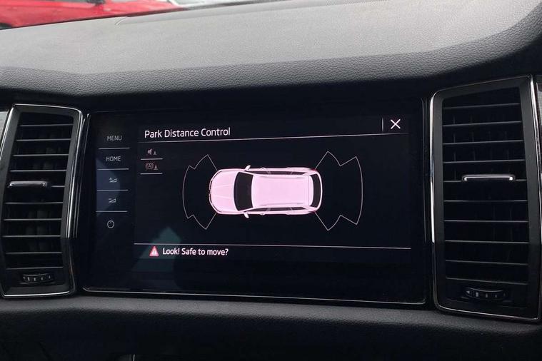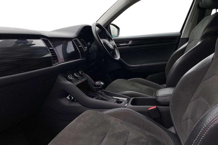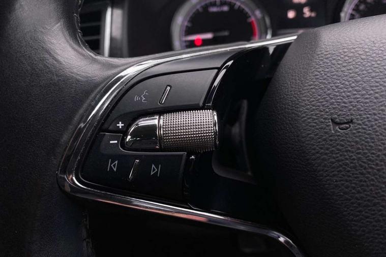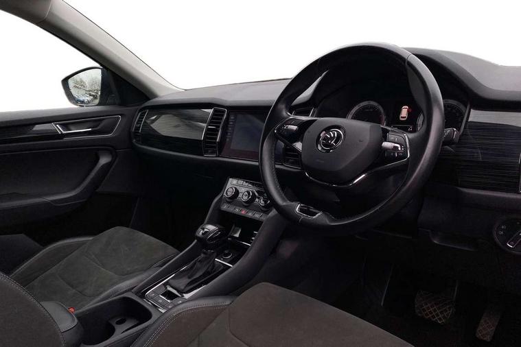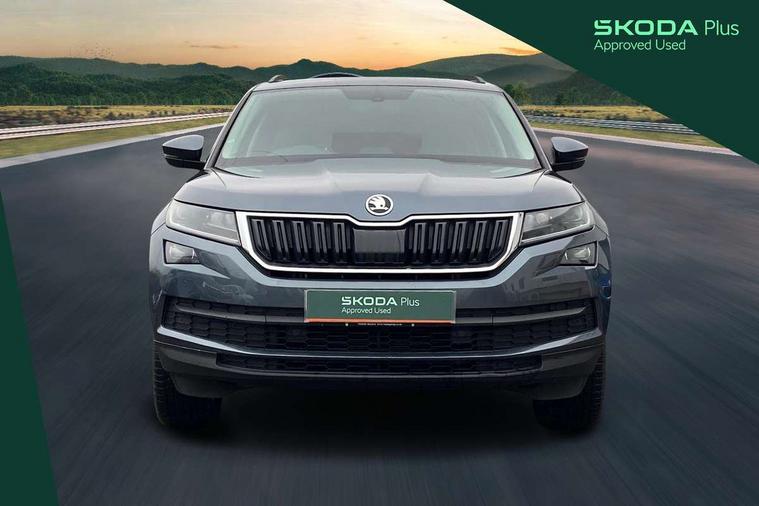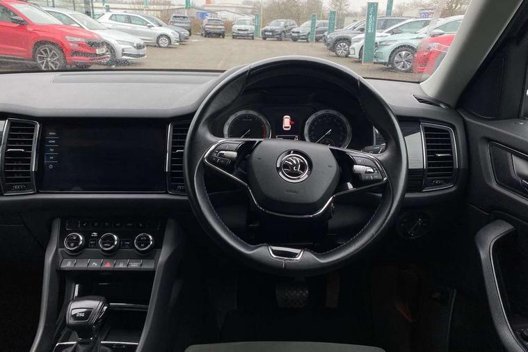 Bluetooth system, Digital voice enhancement, ECO Stop/start function, Exterior temperature indicator, Map care, Smartlink wireless for apple carplay and wired for android auto, Speed limiter, USB C Port x 2 in front centre console, Bolero Radio, DAB Digital radio, DVD System, Aero front windscreen wipers with intermittent function, Aero rear window wiper, Auto dimming rear view mirror, Automatic activation of hazard warning lights, Black electric window control buttons, Black wheel arch surrounds, Body colour bumpers, Body colour door mirrors and handles, Electric front and rear windows, Electrically adjustable, heated and folding door mirrors, Front and Rear door steps, Full LED Headlights with adaptive front light system and LED daytime running lights, Headlight washers, Heated rear window, Invisible tailpipe, LED front fog lights with static cornering light function, LED rear fog light, LED third brake light in rear spoiler, Light assistant (coming home/tunnel light), Radiator grille frame in matt black with chrome strip, Rain and light sensors, Rear spoiler, Safety reflectors on front and rear doors, Sunset privacy glass, 12V socket in boot, 2 rails with 2 hooks including 4 hooks for net programme, 4 foldable roof handles with rear coat hooks, 4 lashing points on luggage floor, 60:40 foldable rear seat with sliding adjustment and backrest angle adjustment, Bottle holders in door panel in the 1.5 litre front and 1 litre rear, Cargo storage compartments, Centre console with open storage box, cup holder and 12V socket, Chrome headlight control button, Chrome interior door handles, Coat hooks on B pillar, Covered storage compartment on driver side, Front and rear door armrest with black adductor trim, Front and rear height adjustable headrests, Front centre armrest with storage compartment, cup holder and 12V socket, Front courtesy lights, Gear shift lever with chrome frame and black gloss insert, Illuminated and cooled glovebox, Illuminated luggage compartment, Isofix child seat fittings in outer rear seats with top tether, Manually adjustable steering column, Net programme in boot (1x horizontal Net, 2x vertical Nets), Overhead glasses storage compartment, Pollen filter, Rear centre armrest with cupholders, Roll up luggage compartment cover with intermediate position, Small Bags on the inner sides of the front backrests, Storage compartment in lower middle instrument panel with closing, Three rear height adjustable headrests, Ticket holder on A Pillar, Umbrella in door panel, Chrome pack - Kodiaq, Auto door release and activation of warning lights, Driver and passenger airbags, Electronic parking brake with hill hold control, Emergency rear braking signal, ESC (incl. ABS+MSR+ASR+EDS+HBA+DSR+RBS+MKB), Front and rear three point safety belt on all seats, Front assist includes AEB city/urban, Front passenger airbag deactivation switch, Front side airbags, Fuel cut off safety device, Head and knee airbags, Rear disc brakes, Safety vest holder in door, Seat belt reminder for all seats, Tailgate unlocking from outside, Two tone horn, Tyre pressure monitor, Warning lights in front doors, Alarm with interior monitoring and tilt sensor with safe function, Immobiliser, Keyless entry and start system (KESSY), Remote central locking,