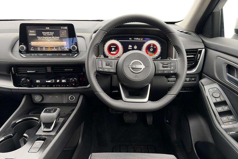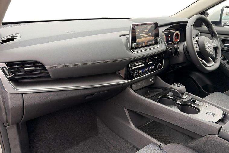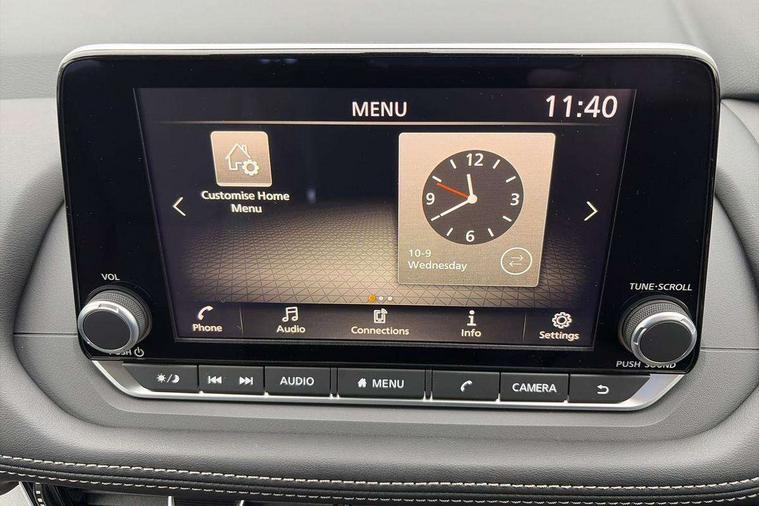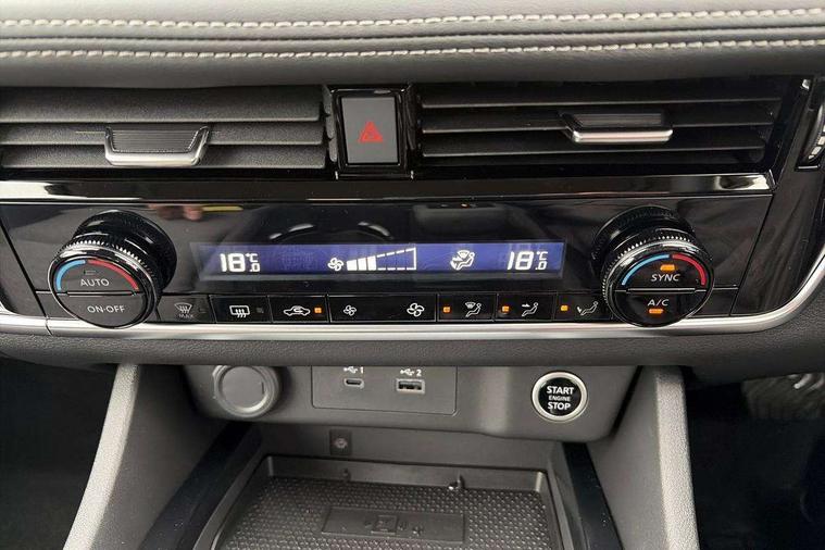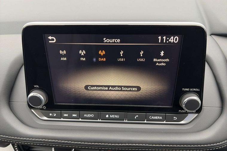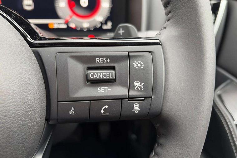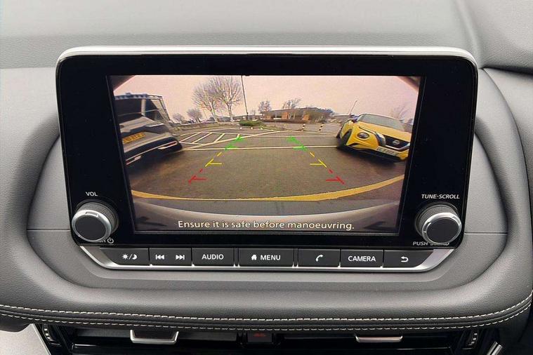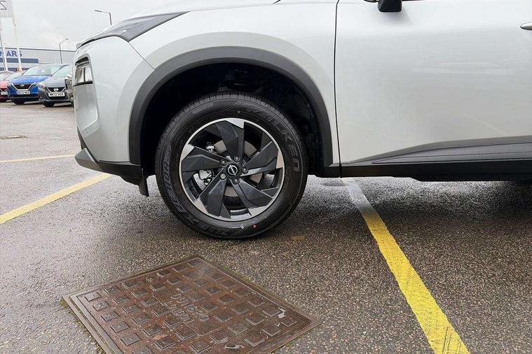 Android auto/Apple CarPlay (Wired), Blind spot warning, Drive assist custom mode, Drive modes (sport, normal, eco), Driver drowsiness and attention warning, Electric speed sensitive power steering, Emergency and breakdown call, Event data recorder, Front and rear parking sensors, Full Digital 12.3" TFT Digital Combimeter, Idle stop/start system, Intelligent driver alert system, Intelligent forward collision warning, Intelligent lane departure warning, Intelligent lane intervention, Intelligent lane keep assist, Maximum speed limiter, Moving object detection, Nissan connect 8" touchscreen infotainment system, Push button starter, Rear cross traffic alert, Rear view camera, Reversing detection, Traffic sign recognition with legal speed adjustment, Trip computer, Wireless charging pad, 6 speakers, AM/FM audio system with DAB, Bluetooth audio streaming, Front USB connections (Type-A and Type-C), Rear USB charging only ports 2 Type-C, Auto dimming rear view mirror, Auto rear wiper when reversing, Body colour mirror caps, Body coloured door handles, Bodyside mouldings, Chrome side window finisher, Electric auto folding door mirrors, Electrically adjustable and heated door mirrors, Follow me home headlights, High beam assist, Intelligent auto headlights, LED 3rd brake light, LED daytime running lights, LED Headlights, LED rear lights, One touch front and rear electric windows with remote opening and closing, Partially body coloured bumpers, Rain sensing wipers, Rear reversing light (bulb lighting), Rear roof spoiler, Rear side wing doors, Rear styling plate, Shark fin antenna, Splash free wipers, Three blink turn signal, 12v power socket in dashboard and luggage, 3 bench rear seats in 2nd row, 3 rear headrests, 60/40 split folding rear seat bench, Butteryfly console, Chrome interior door handles, Cloth monoform upholstery, Driver and front passenger sunvisors with illuminated vanity mirrors, Driver seat back pocket, Dual zone automatic climate control with pollen filter, Front centre console and armrest, Front cupholders, Front door with bottle holders, Height adjustable driver's seat, Height adjustable front headrests, Height adjustable passenger seat, Leather shift knob, Leather steering wheel, Luggage space lighting, Multifunction steering wheel, Passenger seat back pocket, Rear armrest with 2 cupholders, Rear door bottle holders, Single front passenger seat, Tilt/telescopic adjustable steering wheel, Two rear isofix child seat anchorage points with top tether, 3x3 point rear seatbelt pretensioners + load limiters, ABS with EBD and brake assist, Active brake limited slip, Auto hold function, Child locks on rear doors, Curtain and front side, far side airbags, Driver and passenger airbags, Driver, passenger and 2nd row rear seat belt reminder, Electronic parking brake, Front seatbelt pretensioners + load limiters, Height adjustable front seatbelts, Hill start assist, Intelligent blind spot intervention, Intelligent front emergency braking with pedestrian, cyclist recognition and junction assist, Intelligent rear automatic braking, Tyre pressure monitoring system, Vehicle dynamic control, Approach unlock and walk away lock, Engine immobiliser, Remote central door locking with deadlocking, Thatcham Cat.1 alarm, 18" Diamond cut alloy wheels, Tyre puncture repair kit,