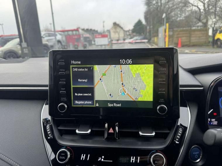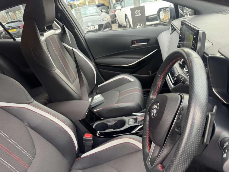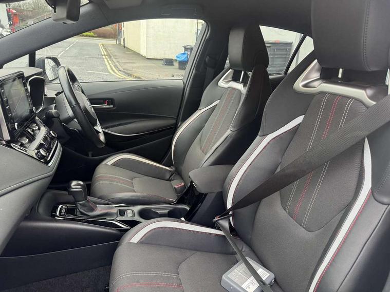 7" Multi information display screen, Bluetooth telephone connectivity, Connected car functionality upgrade, tracker, remote status and e-care, Dynamic radar cruise control (with RSA) including switch on steering wheel, E-call, Electrically assisted power steering, EV drive indicator, Head up Display, Intelligent park assist, Lane Departure Alert (LDA) switch on steering wheel, Memory on adjustable speed limiter, Push button start, Reversing camera, Smartphone integration with Apple CarPlay and Android auto, Gasoline particulate filter, Vehicle Stability Control (VSC), 6 speakers, 8" Touchscreen with MM19 Multimedia system and voice recognition, AM/FM radio, DAB Digital radio, Toyota touch 2 with go navigation system, USB and Aux in connectors + 12V front outlet, Anti-jam protection on power windows, Auto dimming inside rear view mirror, Auto up and down function on all power windows, Automatic folding mirrors, Automatic headlights with high beam assist, Black toyota logo in front, Black window frames, Body colour rear spoiler, Body coloured bumpers, Body coloured door mirrors, Body coloured outside door handles, Follow me home headlights, LED daytime running lights, LED front fog lights, LED Headlights, LED High mounted stop light, LED rear combi lights with LED lightguide, Piano black surround on lower front grille with dark chrome mesh effect, Power adjustable heated door mirrors, Power front windows, Power rear windows, Privacy glass, Rain sensing wipers, Rear bumper with satin chrome plated inserts, Rear window defogger, Rear window wiper, Reverse tilting door mirrors, Shark fin antenna, Time adjustment on intermittent wiper, Turning signal integrated indicators in door mirrors, Unique lower skirt, Unique side rocker with black insert, UV-filter on driver and passenger windows, 3 rear headrests, 3 spoke leather steering wheel + gear knob, 60/40 split folding rear seat, Adjustable speed limiter switch on steering wheel, Alcantara/partial leather upholstery, Audio, multimedia and telephone switches on steering wheel, Boot light, Centre room light, Clean air filter, Driver and front passenger personal light, Driver and passenger assist grip, Driver and passenger seatback pockets, Driver and passenger sun visor with mirror and light, Dual zone automatic air conditioning with ECO mode switch, Fabric armrests, Front and rear cup and bottle holders, Front door pockets, Front head restraints, Heated driver and front passenger seats, Illuminated entry system in room lamp, ISOFIX seat fixing (2 fixings on rear outer seats), Leather gear shift with satin chrome on gear shift console, Manual height adjustable for driver and front passenger seat, Paddle shifts, Parcel shelf, Pollen filter, Power adjustable lumbar support on driver seat, Power window switches with satin chrome inserts, Rear armrest with 2 cupholders, Rear passenger coat hooks (2), Satin chrome inside door handles, Shopping bag hooks in luggage compartment, Sliding armrest on centre console box, Slow opening glovebox with lights, Sports seats, Tilt/telescopic steering column, Voice recognition switch on steering wheel, Whiplash Injury Lessening (WIL) feature (active headrest) for seats, Parking pack - Corolla, Toyota safety sense 2 pack - Corolla, 3x3 point rear seatbelts, Adjustable driver and front passenger seat belt extender to top anchor point, Anti lock braking system + Electronic brake force distribution, Brake assist function, Downhill Assist Control (DAC), Electronic parking brake, Emergency brake light signal (EBS), Front passenger airbag on/off switch, Front seatbelt reminder, HAC - Hill start assist control, Rear seat belt reminder, Seatbelt pretensioners and force limiters, Supplemental restraint system (SRS) 7 airbags - dual driver, dual side curtain, side impact and driver knee airbags, Traction control, Tyre pressure warning system, Acoustic vehicle alert system (AVAS), Alarm with motion sensor and immobilizer, Remote central locking + deadlocks, Smart entry, Satin chrome dash trim, Soft touch texture on upper dashboard, Space saver spare wheel, Unique wheel finish with red wheel cap,