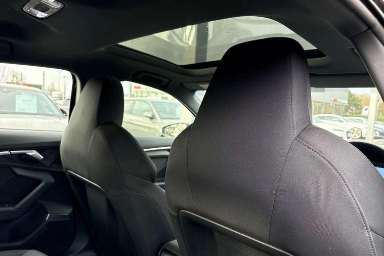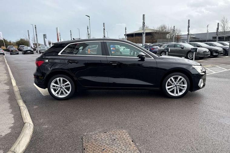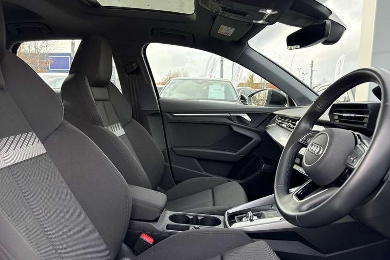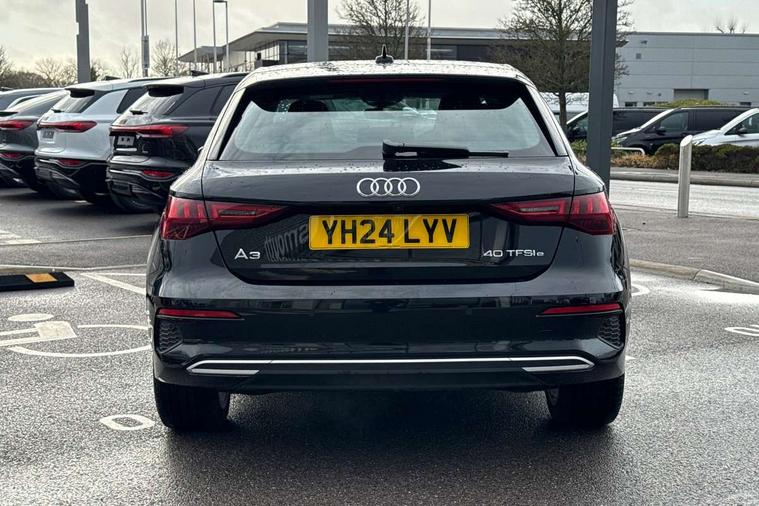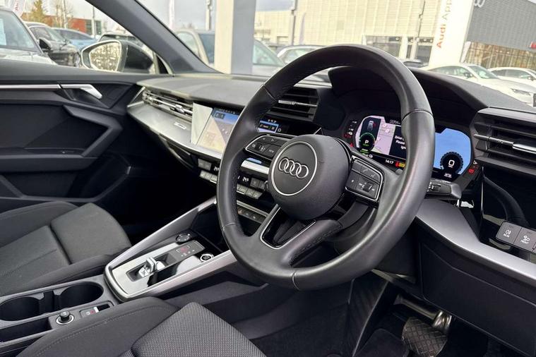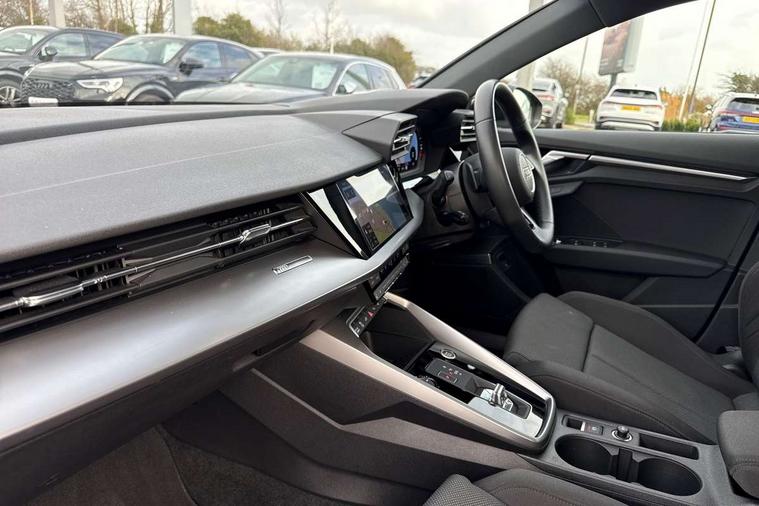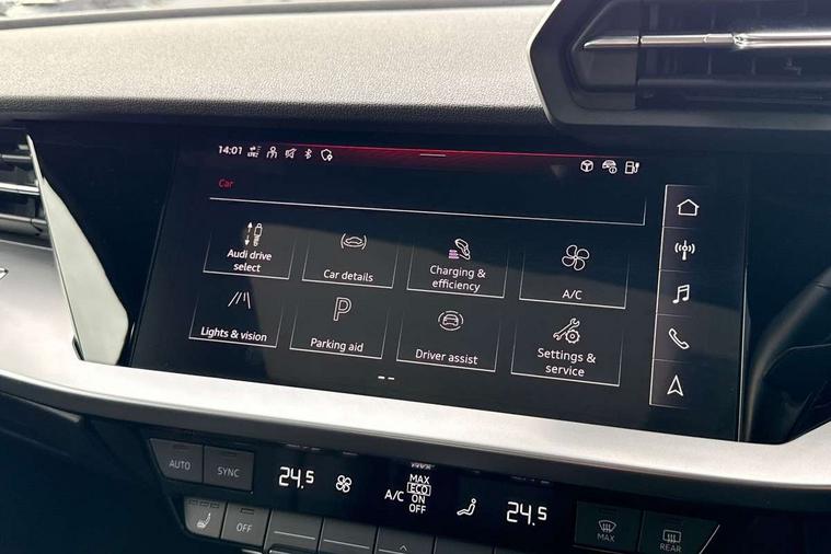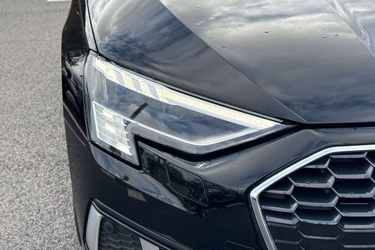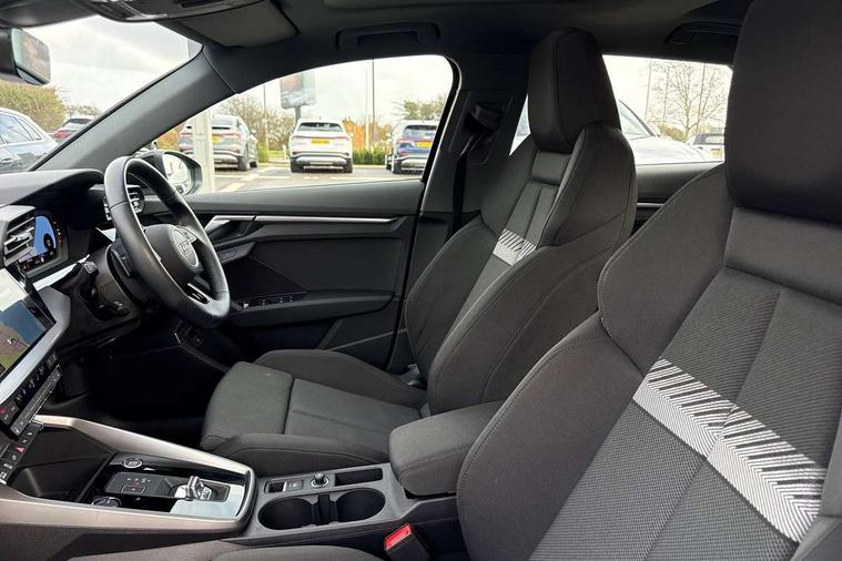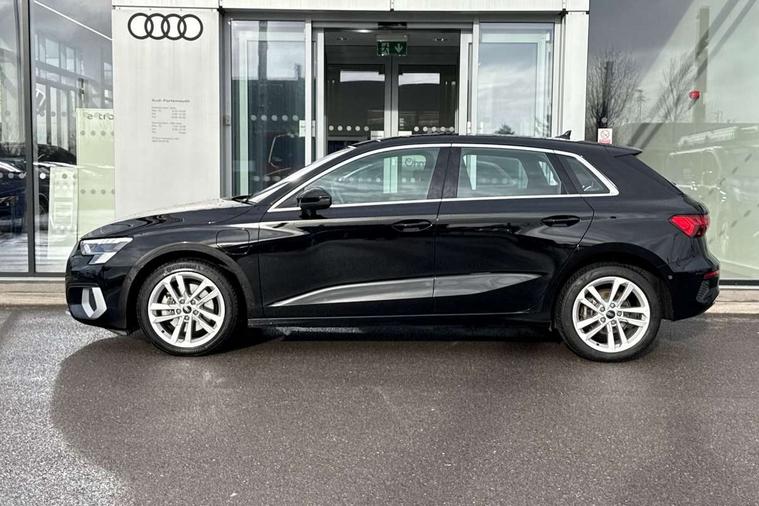 Audi drive select (Auto, Comfort, Dynamic, Efficiency and Individual), Audi smartphone interface, Audi Virtual Cockpit - 10.25" digital and colour instrument cluster, Automatic start/stop system with recuperation, Bluetooth interface, Camera based traffic sign recognition, Collision avoidance assistant, e-Call (emergency call), Electromechanical power speed sensitive steering, Lane departure warning system, MMI Navigation Plus with high resolution 10.1" colour touch screen display, Service indicator, Trip computer, Voice control system with natural language interaction, 3 pin 10 amp domestic charging cable, 3.6 kw On-board charger, Standard suspension, Type 2 mode 3 32 amp charging cable, Type 2 socket for AC charging, 2xUSB-C connection with data and charging functions, 6 passive loudspeakers, DAB Digital radio, 3rd brake light, Acoustic glass windscreen, Aluminium window trim, Auto dimming frameless rear view mirror, Body colour exterior mirrors, Body colour roof spoiler, Electrically adjustable/heated/folding/auto dimming door mirrors with integrated LED indications + kerb view function for passenger side, Front electric windows, LED daytime running lights, LED headlights and halogen rear lights, Light and rain sensors, Rear electric windows, Rear side wing doors, Rear window, rear door windows and rear side windows in clear glass, Rear wiper, 12V socket and storage compartment in front centre console, 3 seat bench in 2nd row, 3 spoke leather multifunction steering wheel with paddle shift, 4 way electrically adjustable lumbar support for driver and front passenger, 60/40 split folding rear seat bench, Dual zone electronic climate control, Front and rear headrests, Front centre armrest, Front door sill trims with aluminium inlay, Front/rear floor mats, Height and reach adjustable steering wheel, Interior lighting - Front and rear roof module including reading lights, glove compartment light and right hand side, Interior lighting - glove compartment light and right hand side, Luggage compartment floor covering, Manual boot compartment lid, Manually adjustable front seats, Routine cloth upholstery with front sports seats, Seat side bolsters, Single front passenger seat, Steel grey cloth headlining, Aluminium interior elements pack - A3 Sportback, LED interior lighting pack - A3 Sportback, Sport styling pack - A3 Sportback, 3x3 point rear seat belts, Driver and front passenger airbag with passenger airbag deactivation, Electronic Stabilisation Control (ESC) including ABS, ASR and EDL, First aid kit with warning triangle and 2 safety vests, Front side airbags with head airbags and interaction airbag, Pre-sense front with pedestrian and cyclist detection, Seatbelt monitoring, Tyre pressure loss indicator, Anti theft alarm, Anti-theft wheel bolts, Electronically operated child locks, Immobiliser, Remote control central locking, Inlays with silk effect paint in platinum grey, Tool kit, Tyre repair kit,