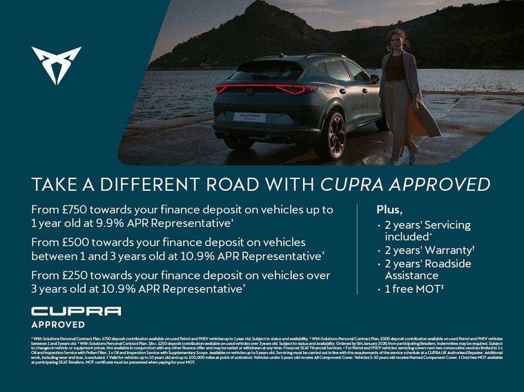 Digital cockpit and configurable dashboard, Driver alert system, Driving profile selection, Forward collision warning with automatic braking, Lane assist, Navigation system with 12'' Touchscreen Display, Park assist (inc front/rear parking sensors), PAS, Predictive adaptive cruise control with speed limiter, Rear view camera, RPM, trip computer, outside temp gauge, instrument light brightness, low fuel warning light, lights on reminder, gearshift indicator, Service interval indicator, Start/stop system with regenerative braking, Voice control system, Wireless apple carplay, Wireless phone charger, Electronic locking differential and dynamic traction support, Standard suspension, 2 front and 2 rear USB type C sockets, Auxiliary input socket, DAB radio, Auto dimming rear view mirror, Body colour door handles, Body coloured bumpers, Dark grey wing mirror, Daytime running light with automatic headlight control and coming home feature, Dynamic headlight range control, Electric front/rear windows, Electrically adjustable heated and folding door mirrors with memory function, Front fog lamps with cornering function, Gloss black roof rails and window surrounds, LED Headlights, LED Taillights with dynamic indicator, Rain sensing wipers, Rear diffuser with black simulated exhaust pipes, Rear side wing doors, Rear wash/wipe, Third brake light, Tinted rear windows, Welcome lights, 12v power supply in centre console, 12V socket, 12v socket in loadspace, 2 front and 2 rear reading lights, 230V socket, 3 seat bench in 2nd row, 60/40 split rear bench seat with armrest and mechanical seat release, Black headlining, Dust/pollen filter, Front and rear head restraints, Front centre armrest, Height/reach adjust steering wheel, Illuminated interior front door sills, Illuminated sunvisor with mirror, Isofix, Leather multi function heated steering wheel with gear shift paddles, Luggage tie-down hooks, Single front passenger seat, Three zone climate control with control panel in rear, Variable luggage/load compartment floor, Wraparound lighting, Genuine Nappa leather Pack - Cupra, 3 point seatbelts on all rear seats, ABS, Brake control system - ESC and brake booster, Child proof door locks, Driver and front passenger airbags with front passenger airbag de-activation, Electronic parking brake, Front and rear disc brakes, Front side curtain airbags, Hill hold control, Public e-call, Seat belt reminder for front and rear seats, Tyre pressure monitoring system, Anti theft alarm system, Keyless entry and start system (KESSY), Locking wheel bolts, Copper and aluminium interior detailing, 19" 'Exclusive' machined sport matte black and silver alloy wheels,