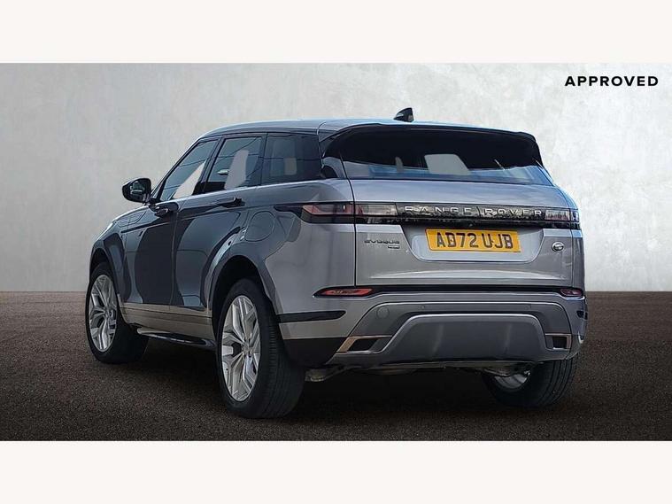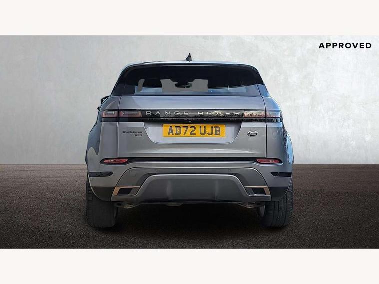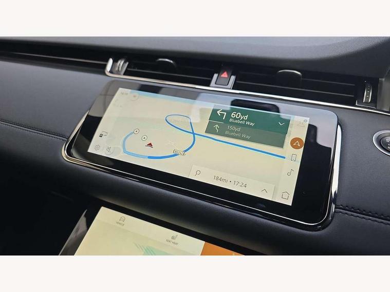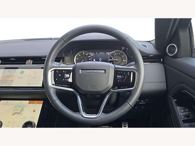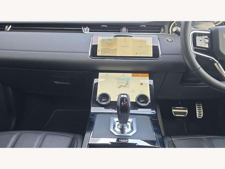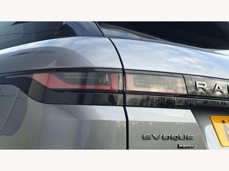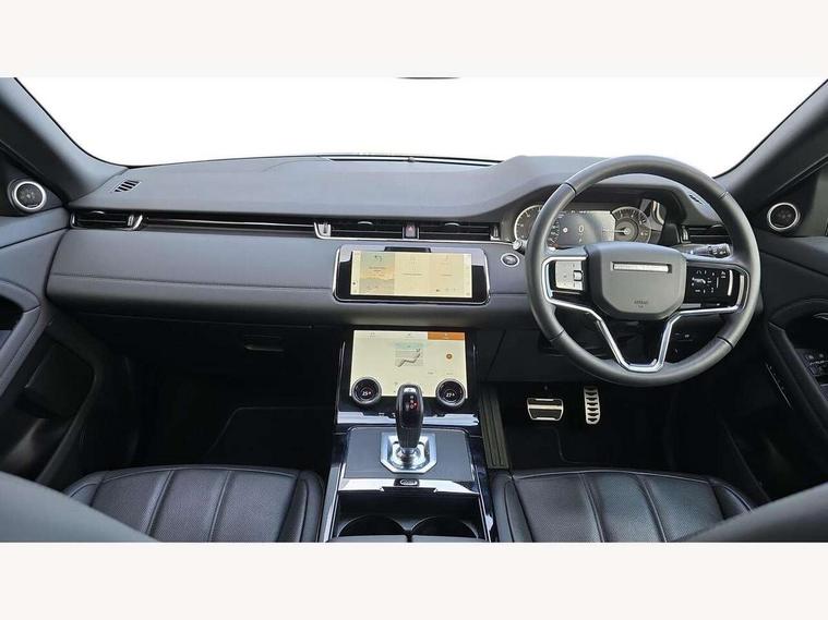 Adaptive cruise control, Android Auto, Apple car play, Blind spot assist, Bluetooth connectivity, Brake pad wear indicator warning light, Driver condition monitor, eCall emergency system, Electronic power assisted steering (EPAS), Front and rear parking aid, InControl remote, Land Rover InControl apps, Lane keep assist, Pivi pro connected includes upgraded infotainment, connected navigation pro, Nuance speech licence, Push button starter, Rear collision monitor, Rear traffic monitor, Traffic sign recognition with adaptive speed limiter, Voice control system, 7 kW onboard charger, All terrain progress control, Electric rear axle drive, Home charging cable, Large fuel tank, Passive suspension, Public charging cable, Terrain Response 2 Auto, Digital Audio Broadcast radio-DAB, Steering wheel mounted controls, Auto headlights, Automatic headlight levelling, Electric windows with one touch open/close and anti trap, Evoque and R-Dynamic badge, Flush deployable exterior door handles, Heated rear window with timer, Heated washer jets, Heated windscreen, P300e badge, Power fold, auto-dimming, heated door mirrors with approach lights and auto dimming driver side, Rain sensing windscreen wipers, Rear fog lights, Rear side wing doors, Rear wiper, Tailgate spoiler, Third brake light, 40:20:40 split folding rear seats with centre headrest and armrest, Ambient interior lighting, Bright metal pedals, Isofix system on outer rear seats, Overhead lighting console, Overhead stowage for sunglasses, Passive front head restraints, Rear air vents, Rear centre headrest, Rear head restraints, Satin chrome gearshift paddles, Single passenger seat, Sunvisors with illuminated vanity mirrors, Twin sliding front centre armrest, 3 rear 3 point seatbelts, Anti-lock braking system (ABS), Customer configurable autolock, DSC - Dynamic Stability Control, Electronic brake force distribution, Electronic parking brake, Electronic traction control, Emergency braking, Front and rear seatbelt reminder, Hill descent control, Hill launch assist, Low traction launch, Power operated child locks, Roll stability control, Six airbags - Driver and passenger airbags/driver knee airbag/front side airbag and curtain airbags, Torque vectoring brake, Tyre pressure monitoring system, Alarm, Immobiliser, Intrusion sensor, Keyless entry, Locking wheel nuts,