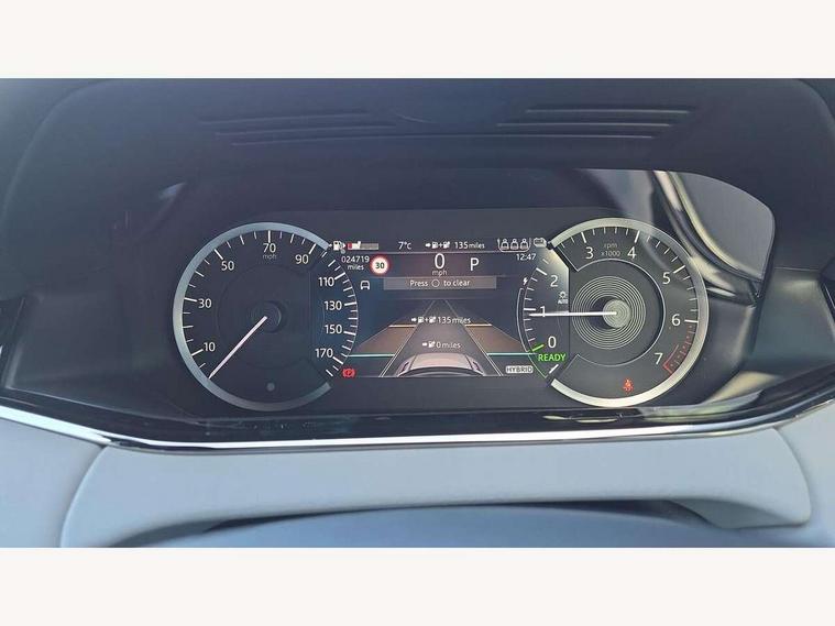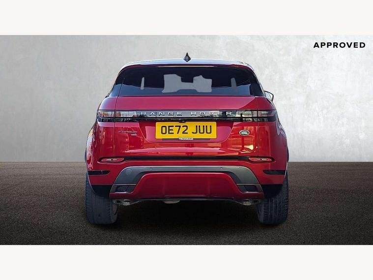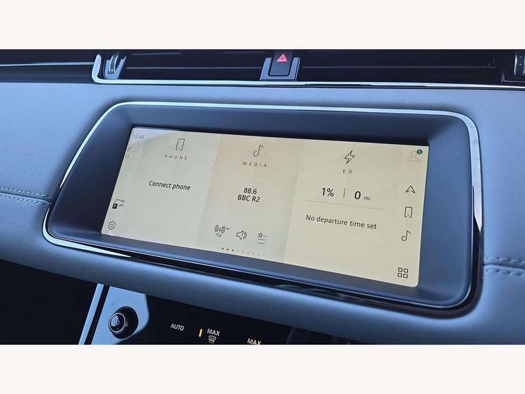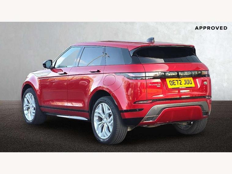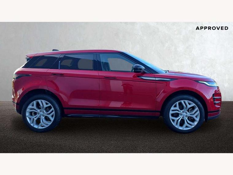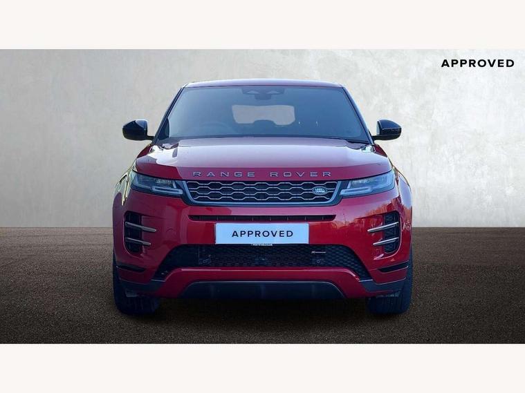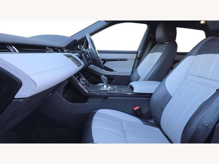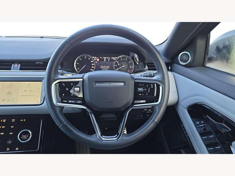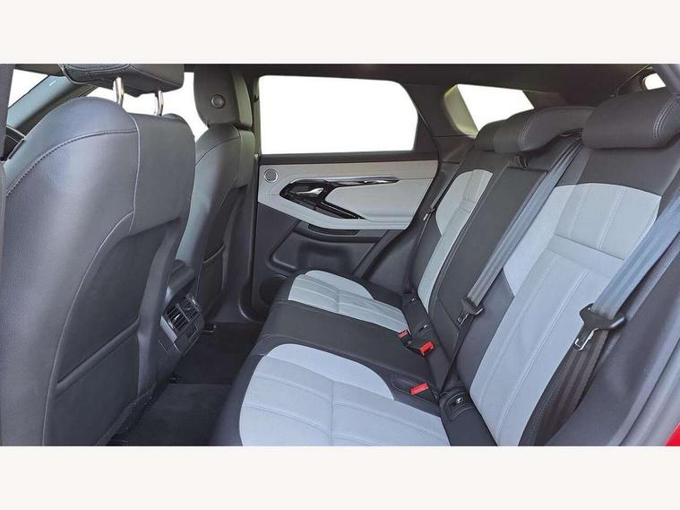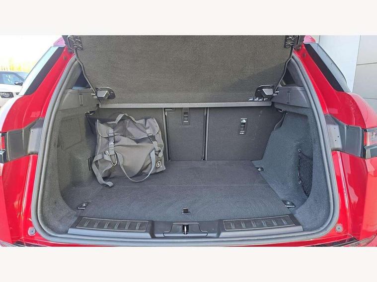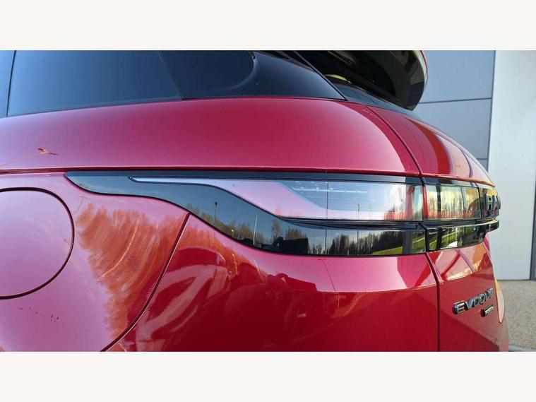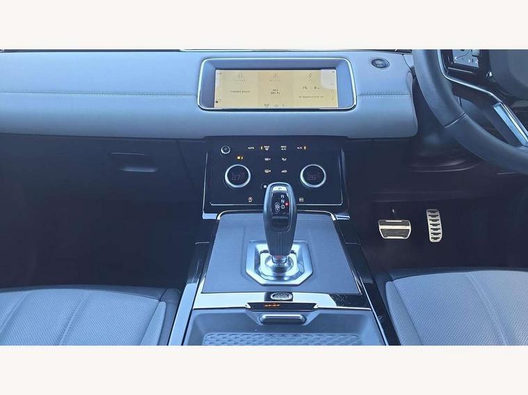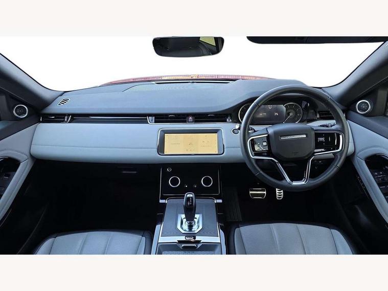Adaptive cruise control, Android Auto, Apple car play, Blind spot assist, Bluetooth connectivity, Brake pad wear indicator warning light, Driver condition monitor, eCall emergency system, Electronic power assisted steering (EPAS), Front and rear parking aid, InControl remote, Land Rover InControl apps, Lane keep assist, Pivi pro connected includes upgraded infotainment, connected navigation pro, Nuance speech licence, Push button starter, Rear collision monitor, Rear traffic monitor, Traffic sign recognition with adaptive speed limiter, Voice control system, 7 kW onboard charger, All terrain progress control, Electric rear axle drive, Home charging cable, Large fuel tank, Passive suspension, Public charging cable, Terrain Response 2 Auto, Digital Audio Broadcast radio-DAB, Steering wheel mounted controls, Auto headlights, Automatic headlight levelling, Electric windows with one touch open/close and anti trap, Evoque and R-Dynamic badge, Flush deployable exterior door handles, Heated rear window with timer, Heated washer jets, Heated windscreen, P300e badge, Power fold, auto-dimming, heated door mirrors with approach lights and auto dimming driver side, Rain sensing windscreen wipers, Rear fog lights, Rear side wing doors, Rear wiper, Tailgate spoiler, Third brake light, 40:20:40 split folding rear seats with centre headrest and armrest, Ambient interior lighting, Bright metal pedals, Isofix system on outer rear seats, Overhead lighting console, Overhead stowage for sunglasses, Passive front head restraints, Rear air vents, Rear centre headrest, Rear head restraints, Satin chrome gearshift paddles, Single passenger seat, Sunvisors with illuminated vanity mirrors, Twin sliding front centre armrest, 3 rear 3 point seatbelts, Anti-lock braking system (ABS), Customer configurable autolock, DSC - Dynamic Stability Control, Electronic brake force distribution, Electronic parking brake, Electronic traction control, Emergency braking, Front and rear seatbelt reminder, Hill descent control, Hill launch assist, Low traction launch, Power operated child locks, Roll stability control, Six airbags - Driver and passenger airbags/driver knee airbag/front side airbag and curtain airbags, Torque vectoring brake, Tyre pressure monitoring system, Alarm, Immobiliser, Intrusion sensor, Keyless entry, Locking wheel nuts,