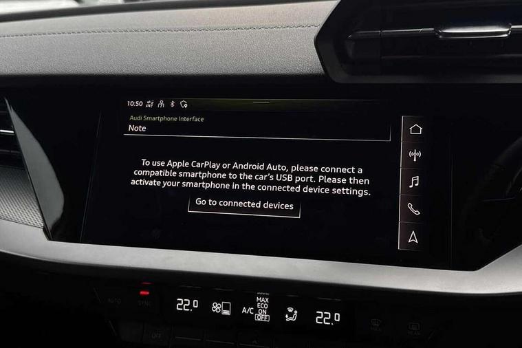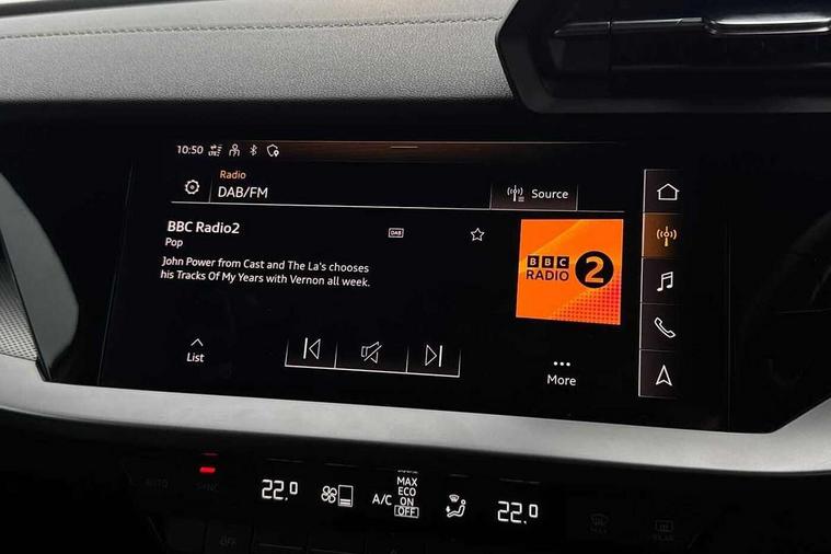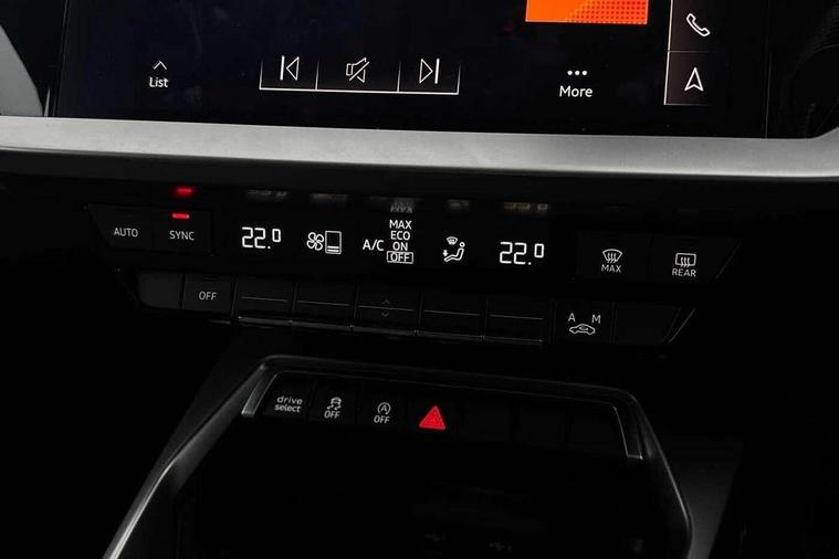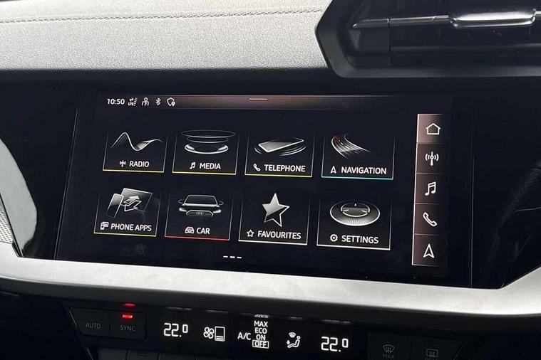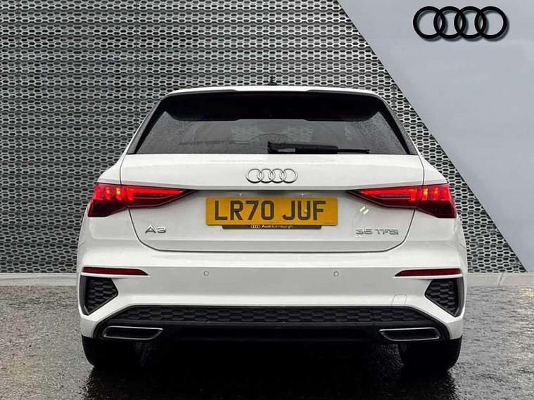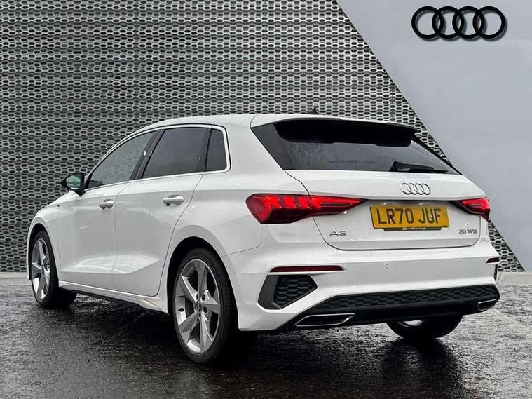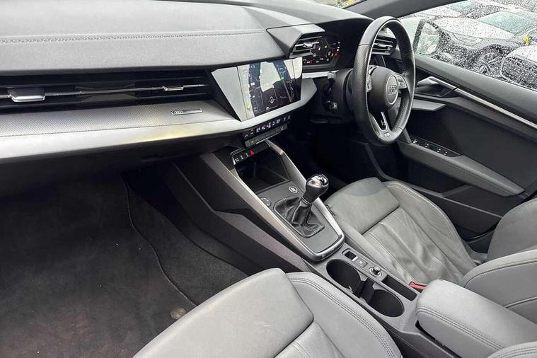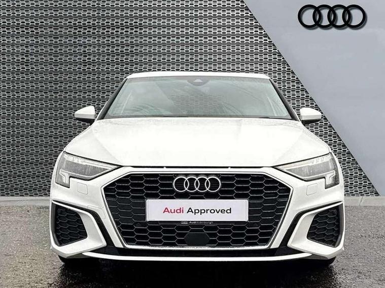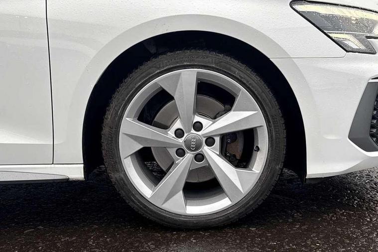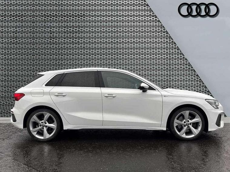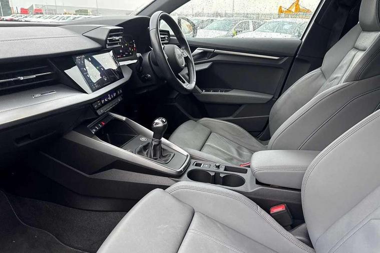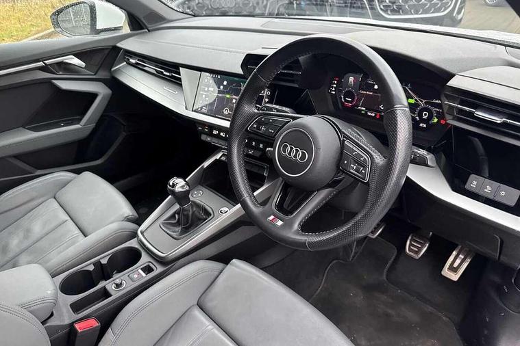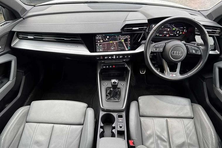 Audi connect emergency call and service, Audi drive select (Auto, Comfort, Dynamic, Efficiency and Individual), Audi smartphone interface, Audi Virtual Cockpit - 10.25" digital and colour instrument cluster, Automatic start/stop system with recuperation, Bluetooth interface, Collision avoidance assistant, Cruise control, Electromechanical power speed sensitive steering, Lane departure warning system, MMI Navigation Plus with high resolution 10.1" colour touch screen display, Rear parking sensors, Service indicator, Trip computer, Voice control system with natural language interaction, 1xUSB-A and 1xUSB-C connection, 6 passive loudspeakers, DAB Digital radio, Acoustic glass windscreen, Aluminium window trim, Auto dimming frameless rear view mirror, Body colour exterior mirrors, Electrically adjustable/heated/folding/dimming door mirrors with kerb view includes integrated LED indications + kerb view function for passenger side, Front electric windows, Illuminated aluminium inserts front door sills with S logo, LED daytime running lights, Light and rain sensors, Privacy glass - dark tinted rear window, rear door and side windows, Rear electric windows, Rear side air outlets in grained matt black, Rear wiper, S line bumpers, S roof spoiler, 12V socket and storage compartment in front centre console, 40/20/40 split folding rear seat bench with cupholder, Black cloth headlining, Dual zone electronic climate control, Front and rear centre armrest in leather, Front and rear headrests, Front/rear floor mats, Height and reach adjustable steering wheel, Interior lighting - glove compartment light and right hand side, Luggage compartment floor covering, Manual boot compartment lid, Manually adjustable front seats, Seat side bolsters, Stainless steel pedals and front footrest, Twin leather upholstery with front sports seats S embossed logo, Aluminium interior elements pack - A3 Sportback, S line styling pack - A3 Sportback, 3x3 point rear seat belts, Driver and front passenger airbag with passenger airbag deactivation, Electronic Stabilisation Control (ESC) including ABS, ASR and EDL, First aid kit with warning triangle and 2 safety vests, Hill hold assist, Pre-sense front with pedestrian and cyclist detection, Seatbelt monitoring, Tyre pressure loss indicator, Anti theft alarm, Anti-theft wheel bolts, Electronically operated child lock, Immobiliser, Remote control central locking, Accent surfaces in the dashboard and centre console in platinum grey silk effect paint finish, Dark spectrum aluminium inlays,