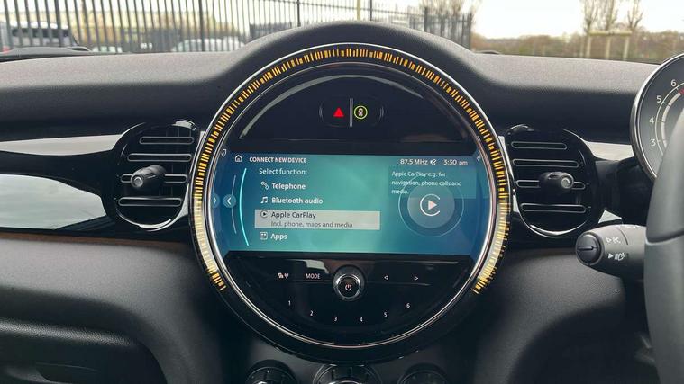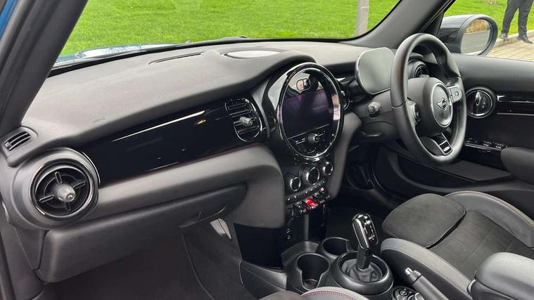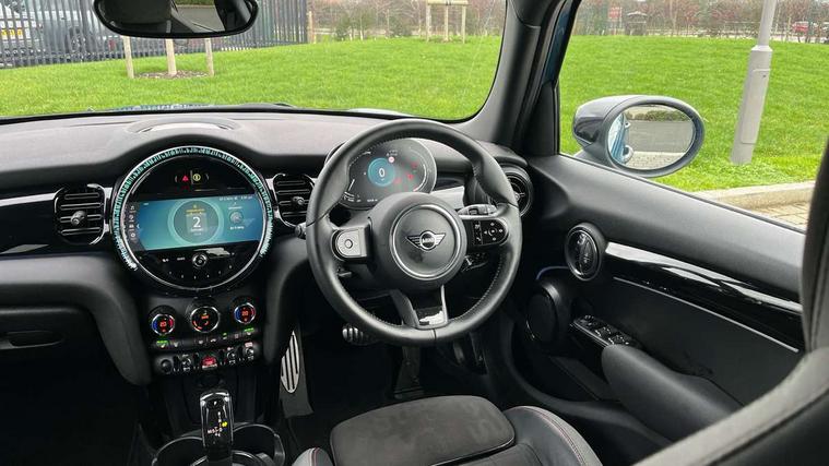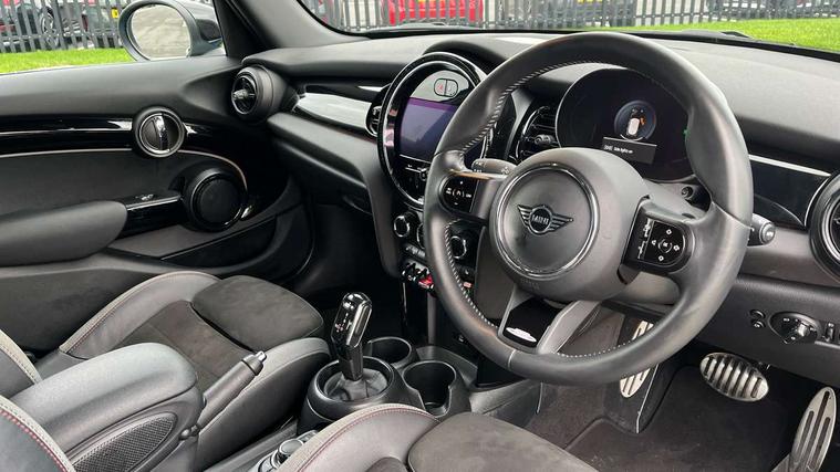 Apple CarPlay, Automatic start/stop function with brake energy recuperation, Compatible mobile phone bluetooth with audio streaming, Electro-mechanical speed dependant steering assistance, Flexible car sharing preparation, MINI Driving Modes - centre toggle switch to control driving setting (sport, mid and green), Mini E-call, MINI TeleServices, On board computer, Rear park distance control, Service interval indicator, Adaptive suspension, Double Vanos system, Fully variable valve control, Gear change indicator display, High precision injection, Performance Control, Steptronic transmission with double clutch, 8.8" touchscreen with LED ring, FM tuner and DAB digital radio, 3rd brake light, Automatic headlight activation switch, Body colour fuel filler cap, Chrome border high gloss black slats radiator grille, Dynamic brake lights, Electric front+rear windows, Exhaust tailpipe on left with chrome finisher, Heated rear window, Heated windscreen washer jets, JCW Aerodynamic kit - Front and rear bumpers with sporty JCW styling and part-painted side sills with MINI John Cooper Works door sill finishers, John Cooper Works rear spoiler, Metal door sill strips with MINI imprint, Model logo Cooper on right of tailgate, Rain sensor window wipers, Rear fog lights, Rear LED lights with union jack design, Rear side wing doors, Rear window wiper, Side scuttle panel with integrated indicator, Sun/heat protection glass, White indicator lenses, 12V Accessory socket in centre console, 3 seat bench in 2nd row, 4 lashing eyes in luggage compartment, 60/40 split folding rear seat, Anthracite headliner including grab handles and clothes hooks, Carbon black colour line - Knee roll and door armrest, Chrome interior highlights, Cupholders, Front and rear isofix with front passenger airbag deactivation, Front and rear velour floor mats, Glove compartment, Height and length steering column adjustment, Interior lighting with 12 different colours across the dashboard, underneath door bezel with illuminated laser-engraved design on central display, JCW Sport seats with integrated headrests, adjustable thigh support and John Cooper Works logo, Leatherette gearshift lever and handbrake gaiters, LED reading lights, vanity mirror lights, front foot well light and spotlight on front seats, Mechanical seat adjustment - forward/back & backrest for front seats and driver seat height adjust, Multifunction steering wheel, Single front passenger seat, Storage compartments in doors, Sunvisors with vanity mirrors, Walknappa leather steering wheel with grey seam and John Cooper Works badge on Piano Black lower steering wheel spoke, Piano black exterior pack - Mini Hatchback Cooper, 3 point seatbelts on all five seats, 6 Airbags - front, side, head and seat belt tensioners, Anti-lock braking system (ABS), Child locks on rear doors, DSC - Dynamic Stability Control, Front and rear disc brakes, Hill start assist, Single tone fanfare horn, Tyre pressure monitoring system, Alarm system with tilt sensor, monitoring doors, bonnet interior and tailgate, Electronic vehicle immobiliser, Start/stop toggle with keyless go, Piano black interior trim, Tool kit,
