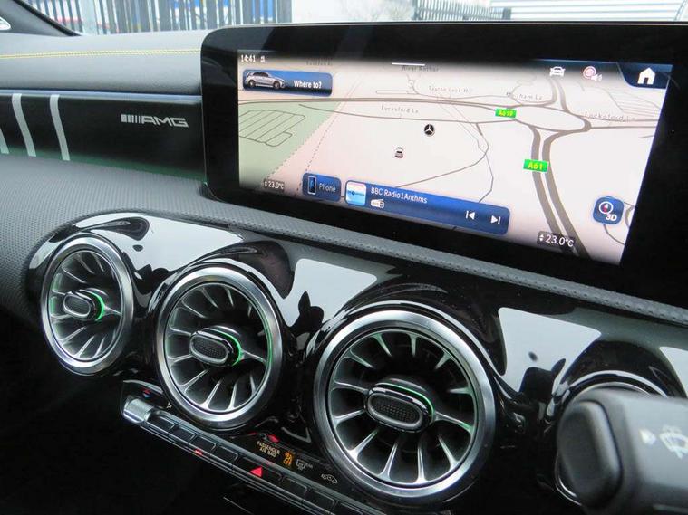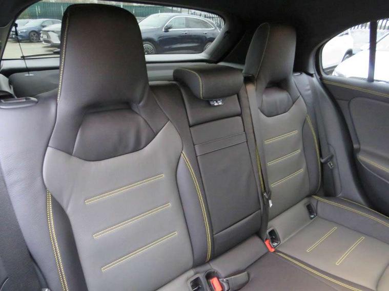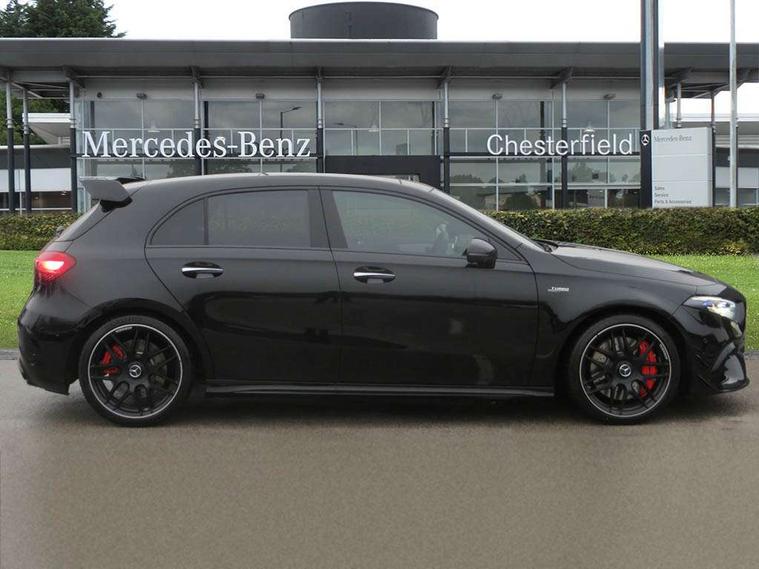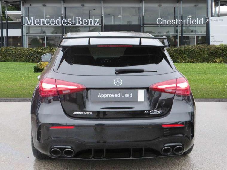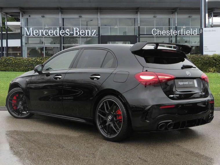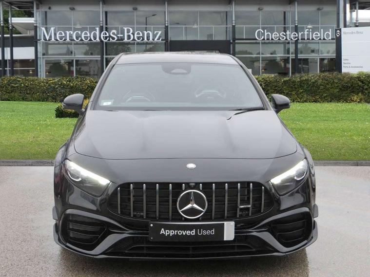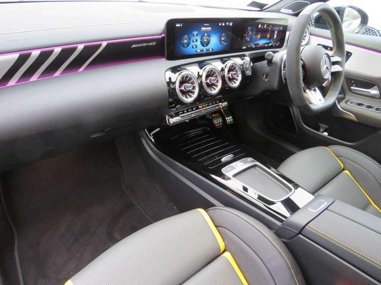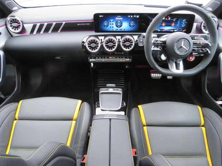 10.25 inch touchscreen central media display with AMG specific, AMG start up logo, visualisation of the AMG drive programs, vehicle and engine data, 10.25" Digital instrument cluster display screen, AMG DYNAMIC SELECT with drive modes(Slippery, Comfort, Sport, Sport+, Individual and Race) incl drift mode via steering wheel shift paddles+Race Start, AMG menu with sporty additional information - Gear indicator with yellow M symbol manual mode, Warm Up menu and Set Up menu, AMG speed sensitive steering with two sets of steering characteristics, Attention assist, Brake pad wear indicator warning light, Car wash mode, Direct steering, Dual bluetooth interfaces, ECO start/stop function, Engine start/stop button, Fluid level warning indicator for fuel, oil, coolant and washer fluid, Fluorescent jacket for driver, Hard-disk navigation, Head up Display, Hey Mercedes Voice activation, Lamp failure indicator, MBUX augmented reality for navigation, Mercedes me connect including emergency call system, accident recovery, breakdown and maintenance management, Mercedes me remote services, Outside temperature gauge, Owners manual in English, Pre-installation of private car share, Remote boot closing, Service indicator (ASSYST), Smartphone integration with Apple CarPlay and Android auto, Tailgate, Traffic sign assist, Trip computer in multifunction display with current consumption indicator, Wireless charging, AMG performance 4MATIC+ with torque control, AMG suspension including AMG specific axles and sporty spring/damper setup, Suspension with adaptive damping system, Burmester surround sound system (590W) with Dolby atmos, speakers - 1 center+4 doors+2 in C pillars, tweeter, subwoofer, DSP amp, burmester lettering, DAB Digital radio, MBUX multimedia system, 4 Electric Front and Rear windows, Adaptive brake lights, AMG A45 S bodystyling -rear apron, four vertical fins, side sill panels, roof spoiler lip, specific front apron, diffuser look and S label on boot lid, AMG real performance exhaust sound system, AMG specific radiator grille in high gloss chrome with AMG lettering, Beltline strips in High gloss Black, Body colour bumpers, Body colour door handles with chrome inserts, Body colour side skirt, Electric adjustable and heated door mirrors with integrated LED side indicators, Headlamp assist automatic headlamp activation, Heated glass rear windscreen + timer control, LED daytime running lights, LED High level third brake light, LED tail lamp, Multibeam LED headlamps with adaptive highbeam assist and cornering function, Panoramic sliding sunroof, Privacy glass, Radio aerial, Rain sensing windscreen wipers with two sensitivity settings, Rear fog lights, Rear side wing doors, Rear windscreen wiper, Surround lighting with logo projection, Two round twin tailpipe trim elements each measuring 90 mm in diameter and AMG lettering plus ribbing on the inside of the pipe, Valve control dependent on drive program, Wider wheel arches for AMG wheels, Window line trim strip in black, 3 seat bench in 2nd row, 3 Spoke flattened lower section sporty design AMG Performance steering wheel in nappa leather/microcut microfibre, 40:20:40 split folding rear seats, Air conditioning - Two zone thermotronic luxury automatic climate control with display, AMG brushed stainless steel sports pedals with rubber studs, AMG centre console finished with trim in silver chrome, AMG floor mats, AMG performance seats, AMG sporty centre console with raised front section and integral control switched for manual transmission mode, AMG steering wheel buttons, Automatic child seat recognition sensor, Black air vents with surround in silver chrome, Black roof lining, Electrically adjustable front memory seats including lumbar support and backrest inclination, Front centre armrest with stowage, Front seat head restraints, Height/reach adjustable steering column, Illuminated AMG front door sills with changeable cover, Interior lighting - 64 colour Ambient lighting, Interior mirror with reading lamps in black and frameless, Rear armrest with 2 cupholders, Rear head restraints, Seat occupancy sensor for front passenger seat, Silver coloured aluminium gear shift paddles on steering wheel, Single front passenger seat, Stowage compartment in centre console with retractable cover, Sunvisors with illuminated vanity mirrors, Twin front cupholders, Aerodynamic pack - A Class, AMG Driver's pack - A Class, AMG night pack - A Class, AMG performance high-end seat pack - A Class, Light and sight package - A Class, Mirror package - A Class, Multi-contour seat pack - A Class, Parking pack with 360 degree camera - A Class, Seat comfort pack - A Class, USB pack plus - A Class, Winter pack - A Class, 3 rear 3 point seatbelts, 3 stage electronic stability programme, ABS with Brake Assist, Active bonnet, Adaptive brake assist with hold function and hill start assist, AMG high performance brake system with red painted brake callipers and black AMG lettering at the front, ventilated and perforated brake discs, Black seatbelts, Bonnet with power domes, Childproof locks manually operated for rear doors and electrically operated for rear power windows, Crash responsive emergency lighting, Driver and passenger head and side airbags, Drivers knee airbag, Dual stage driver/passenger airbags, Electronic parking brake, ESP curve dynamic assist, ESP with ASR, Exit warning, Front and rear seatbelt reminder, ISOFIX and top tether child seat fixing points in two outer rear seats, Tyre pressure monitoring system, Warning triangle and first aid kit, Window airbags, Alarm system/interior protection/immobiliser, Guard 360 degree vehicle protection, Keyless entry lock/unlock, Keyless Go, Remote central locking and crash sensor with emergency opening function, Aluminium AMG design black/silver interior trim, 19" AMG cross spoke forged wheels painted in matt black with high sheen rim flange, Summer tyres, Tirefit sealant kit, Wheel arches with flared AMG wings with TURBO 4MATIC+ letterin