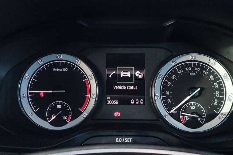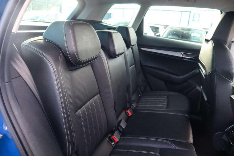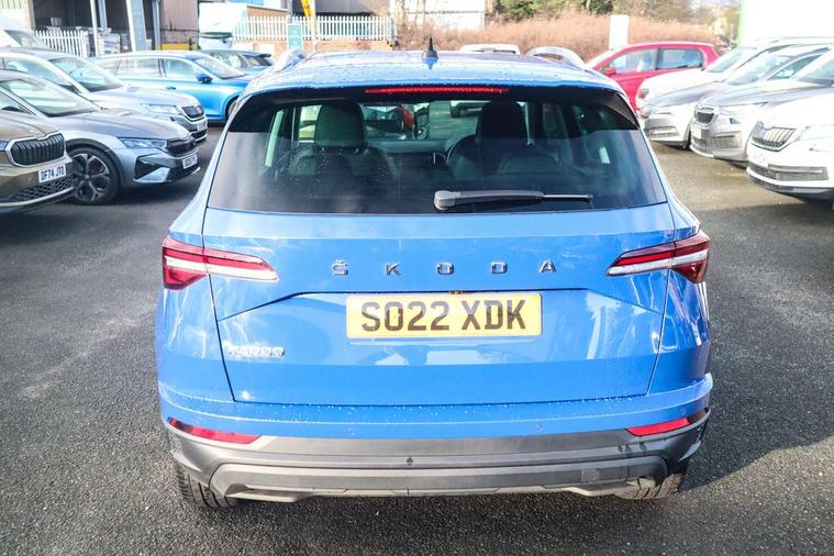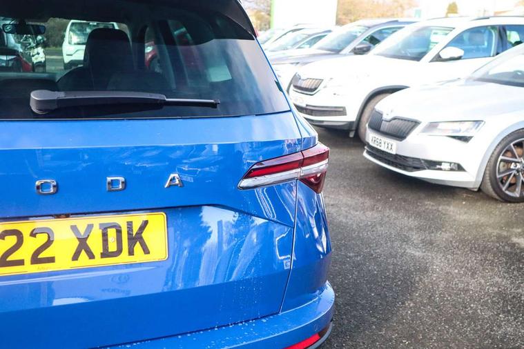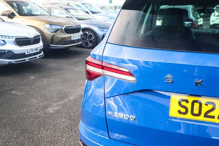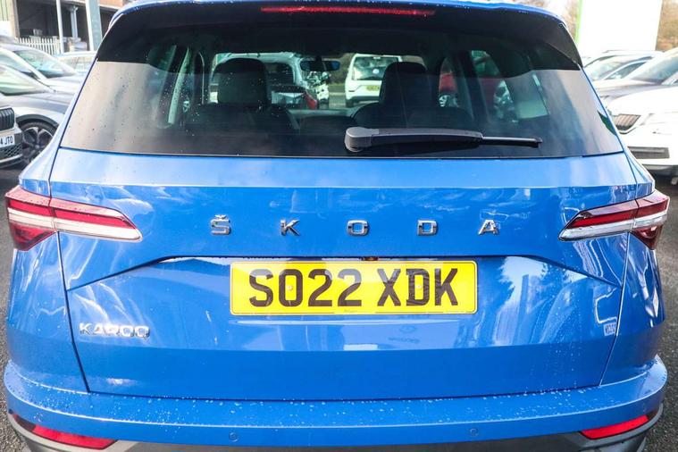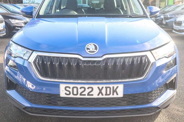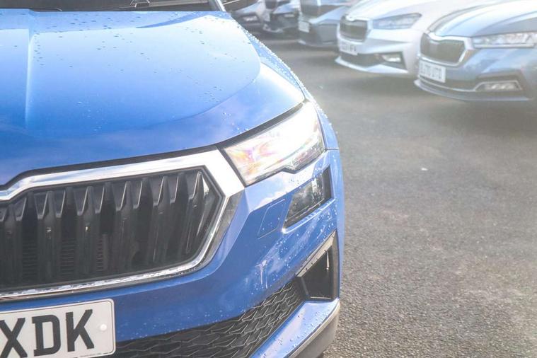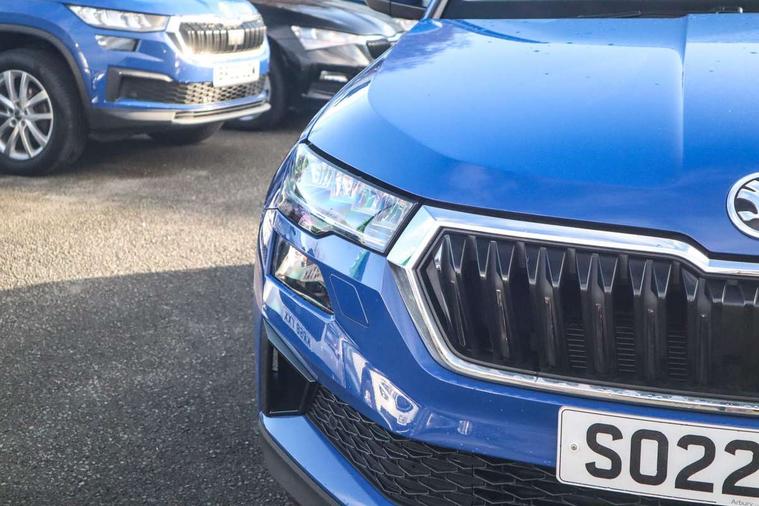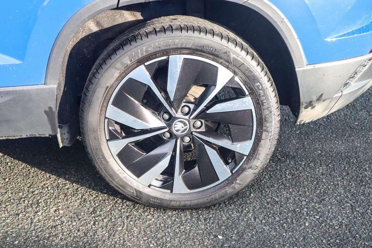 Care connect, Drive mode selector, Driver fatigue sensor, Electro-mechanical PAS, Emergency services call system, Multifunction colour trip computer, Outside temperature gauge, Service interval indicator, SmartLink wireless for Apple and wired for Android, Start/stop system with regenerative braking, USB C Port x 2 in front centre console, 8 speakers, DAB radio with Bluetooth, USB connection, Acoustic glass, Aero front windscreen wipers with intermittent function, Auto dimming rear view mirror with light and rain sensors, Automatic headlight control system, Black electric window control buttons, Body colour door mirrors and handles, Body coloured bumpers, Electric front and rear windows with child proof lock, Electrically adjustable heated folding and auto dimming door mirrors, Heated rear windscreen, LED daytime running lights, LED Headlights, LED rear lights with high functionality welcome effect and dynamic indicators, Light assistant (coming/leaving home/tunnel light), Privacy glass, Rear side wing doors, Rear spoiler, Rear wiper, Safety reflectors on front doors, Third brake light, 1.5 litre bottle holders in driver and front passenger door panels, 12V socket in boot, 12v socket in front centre armrest with storage compartment and rear air vents, 2 Folding hooks and nets in boot, 2 spoke leather heated multifunction steering wheel, 2 x Tablet holder, 3 rear height adjustable headrests, 3 seat bench in 2nd row, 4 foldable roof handles with rear coat hooks, Black floor carpet, Chrome inner door handles, Decorative door sills with KAROQ badging, Double sided boot floor, Foldable hooks in the boot, Folding tables on the front seat backrests, Front head restraints, Height adjustable driver and passenger seat, Height adjustable front three point seats belts with tensioners, Height/reach adjust steering wheel, Ice scraper, Illuminated and cooled glovebox, Illuminated luggage compartment, Isofix child seat preparation for front passenger seat, Isofix child seat preparation outer rear, Manual lumbar support for front seats, Pen holder, Pollen filter, Rear boot cover, Rear reading lights, Retractable parcel shelf attachable to tailgate, Rubbish bin door, Safety vest holder, Single front passenger seat, Storage box in upper central dashboard closed, Sunvisors with illuminated vanity mirrors, Textile floor mats, Umbrella under passenger seat, VarioFlex seats with standard rear seat release, Chrome roof rails + chrome pack - Karoq, Parking pack - Karoq, Airbags - Front side, head, knee and curtain, Automatic door unlocking in case of crash, Automatic fuel cut off in case of crash, Child locks on rear doors, Driver airbag, Electronic parking brake with auto hold function, Emergency rear braking signal, ESC including ABS, MSR, ASR, EDS, HBA, DSR, RBS, MKB and traction control, Front assist radar scanning of the space in front of the car with automatic braking, Hill hold control, Passenger airbag with switch-off function, Pedestrian monitor, Seatbelt reminder signalisation and pretensioner for all seats, Three point seatbelts rear, Two tone horn, Tyre pressure display, Tyre pressure monitor, Alarm with interior monitoring, back up horn and tilt sensor with safe function, Electronic engine immobiliser, Keyless entry and start/stop system with SAFE system, Remote central locking with 2 remote folding keys, Chrome framed air vents, 18" Miran alloy wheels in black, Anti-theft wheel bolts protection, Storage on wheel cover,