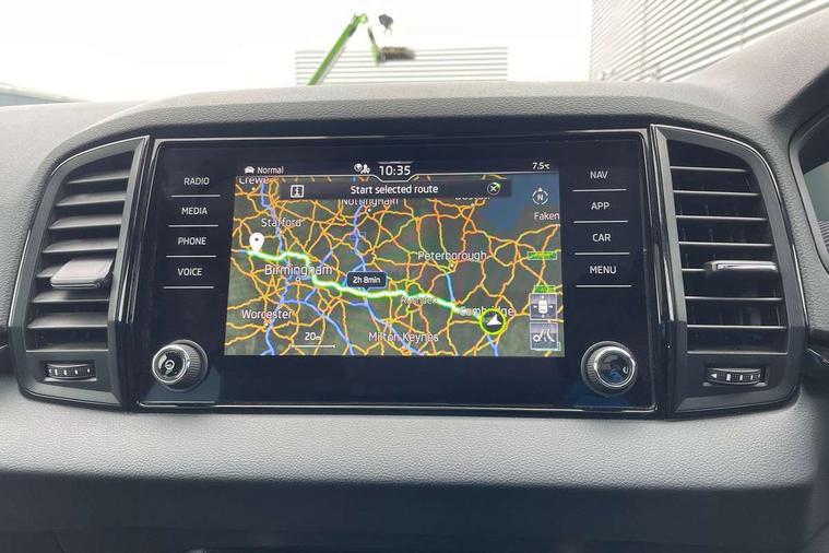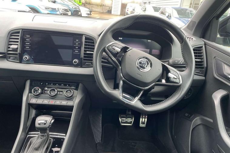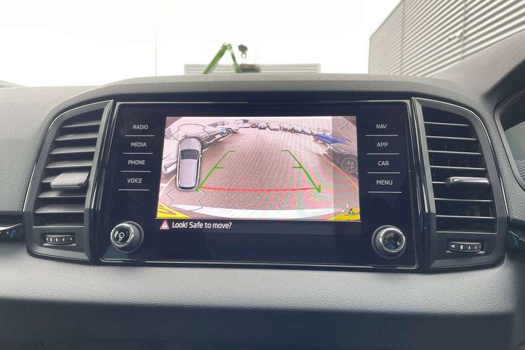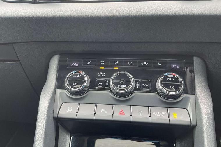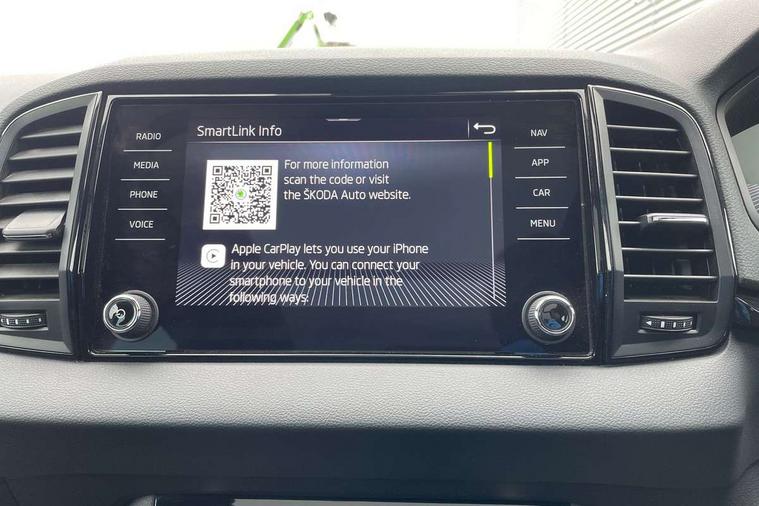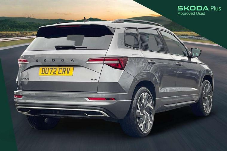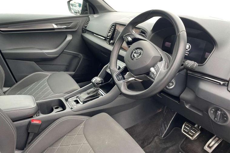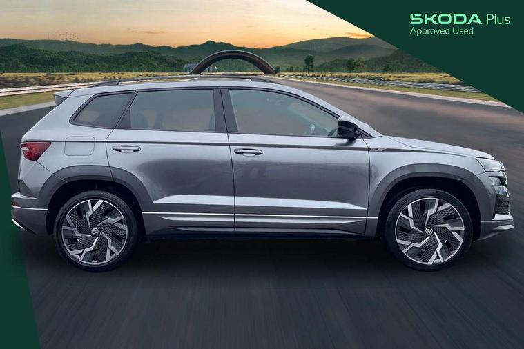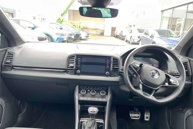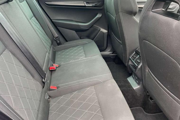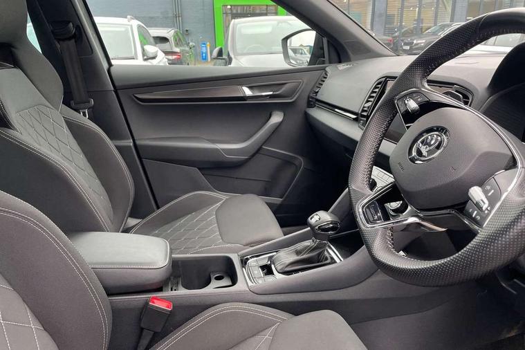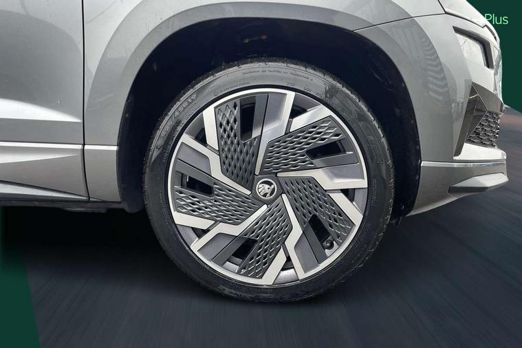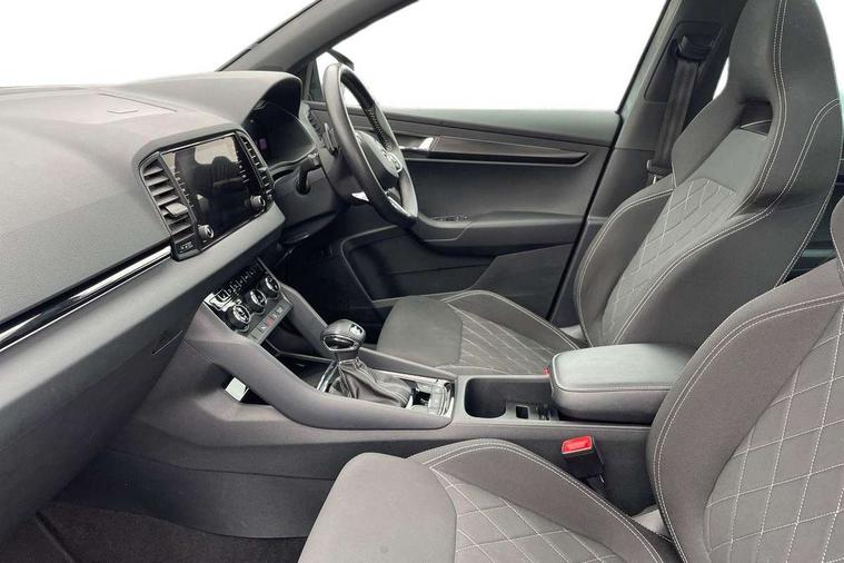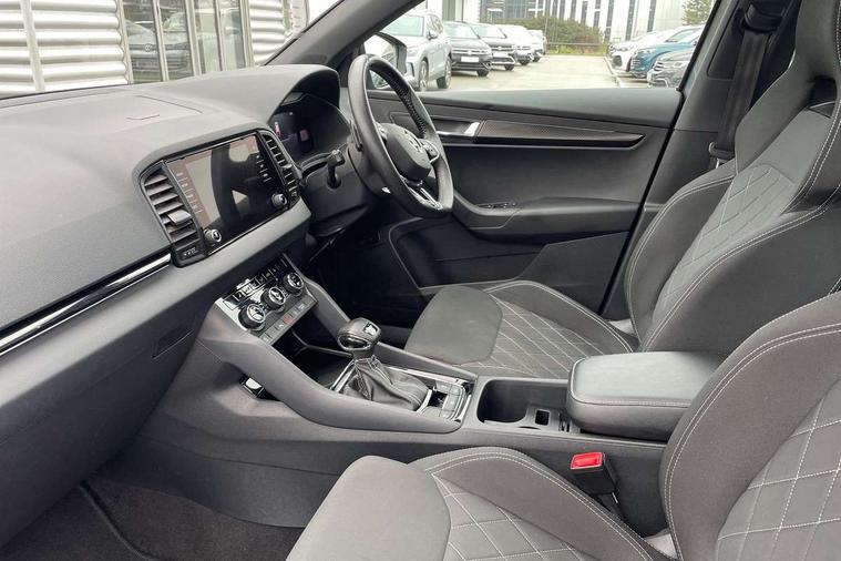 8" Digital display, Care connect, Colour multifunction trip computer, Driver fatigue sensor, Emergency services call system, Outside temperature gauge, Service interval indicator, SmartLink wireless for Apple and wired for Android, Start/stop system with regenerative braking, USB C Port x 2 in front centre console, Virtual pedal with electrically operated boot door, 8 Speakers, DAB radio with Bluetooth, USB connection, Acoustic glass, Aero front windscreen wipers with intermittent function, Auto dimming rear view mirror with light and rain sensors, Automatic headlight control system, Black door mirrors, Black electric window control buttons, Black radiator grille, Black roof rails, Body colour door handles, Electric front and rear windows with child proof lock, Front door steps with SportLine logo, Heated rear windscreen, LED daytime running lights, LED rear lights with high functionality welcome effect and dynamic indicators, Light assistant (coming/leaving home/tunnel light), Panoramic sliding sunroof, Plastic scuff plates, Privacy glass, Protective door side sills in body colour, Rear diffuser, Rear side wing doors, Rear spoiler, Rear window wiper with washer system and intermittent control, Safety reflectors on front doors, Skoda lettering on tailgate in black, Sportline badge on front fender, Sportline decorative inserts with badging, Sports front and rear bumpers, 1.5 litre bottle holders in driver and front passenger door panels, 12V socket in boot, 12v socket in front centre armrest with storage compartment and rear air vents, 2 Folding hooks and nets in boot, 3 rear height adjustable headrests, 3 seat bench in 2nd row, 3 spoke leather sports multifunction steering wheel and silver stitching with gear shift paddles, 4 foldable roof handles with rear coat hooks, Black floor carpet, Black roof headlining, Chrome inner door handles, Double sided boot floor, Foldable hooks in the boot, Front head restraints, Height adjustable front three point seats belts with tensioners, Height/reach adjust steering wheel, Ice scraper, Illuminated glovebox, Illuminated luggage compartment, Interior noise suppression, Isofix child seat preparation outer rear, Manual lumbar support for front seats, Pen holder, Pollen filter, Rear boot cover, Rear reading lights, Rear seats fixed folding and divided 60:40, Rubbish bin door, Safety vest holder, Single front passenger seat, Storage box in upper central dashboard closed, Sunvisors with illuminated vanity mirrors, Textile floor mats, Ticket holder, Titan black interior ceiling, Welcome animation with sportline logo, Light Pack - Karoq, Parking pack - Karoq, Automatic door unlocking in case of crash, Automatic fuel cut off in case of crash, Child locks on rear doors, Driver airbag, Electronic parking brake with auto hold function, Emergency rear braking signal, ESC including ABS, MSR, ASR, EDS, HBA, DSR, RBS, MKB and traction control, Front side airbags, Hill hold control, Knee airbags, Passenger airbag with switch-off function, Pedestrian monitor, Seatbelt reminder signalisation and pretensioner for all seats, Three point seatbelts rear, Two tone horn, Tyre pressure display, Tyre pressure monitor, Alarm with interior monitoring, back up horn and tilt sensor with safe function, Electronic engine immobiliser, Keyless entry and start/stop, Remote central locking with 2 remote folding keys, Black air vent surround, Black centre console, Satin black dashboard, Satin black door trim, 19" Sagitarius anthracite alloy wheels with matt black aero inserts, Anti-theft wheel bolts protection, Matt black aero hub caps, Storage on wheel cover, Tool kit,