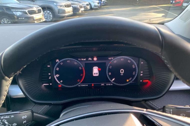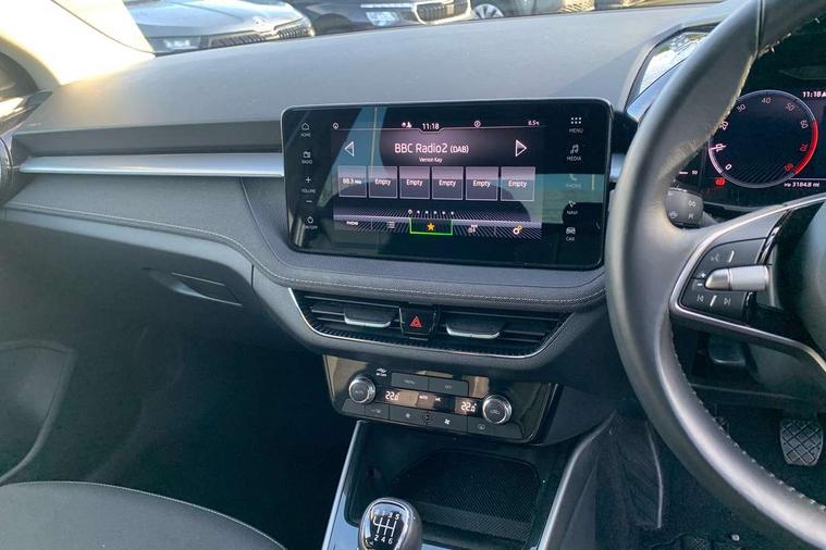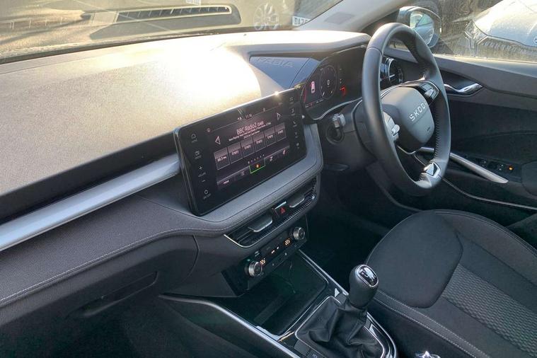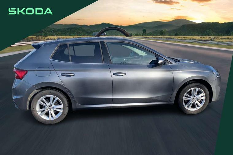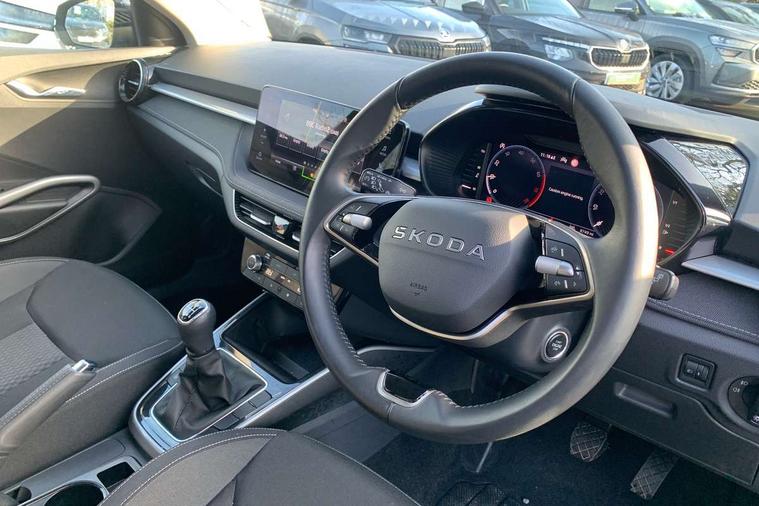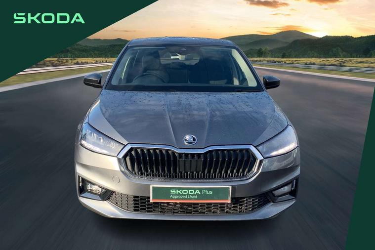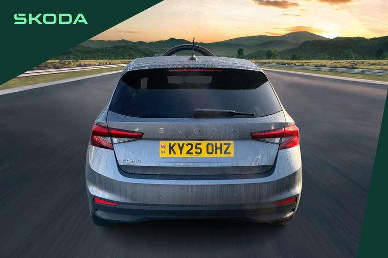 Advanced driver attention and drowsiness monitor, Bluetooth connection, Electromechanical power steering, Exterior temperature gauge, Service interval indicator, Traffic sign recognition, Virtual cockpit with 10.25" colour display, Wireless SmartLink for Apple CarPlay and Android Auto, 6 Speakers (4 in front and 2 in rear), 9.2" colour display skoda navigation system with voice control and web radio, Auxiliary socket for external MP3 player, DAB digital radio reception, Auto dimming rear view mirror, Body colour door mirrors, Body coloured bumpers, Chrome window surround, Door mirror integrated indicators, Front and rear electric windows, Front window wiper intermittent control, Headlight range control - Automatic, Ice scraper in fuel cap, LED 3rd brake light, LED daytime running lights with coming and leaving home feature, LED rear lights, Privacy glass, Rear LED fog light, Rear side wing doors, Rear window wiper with washing nozzles, Roof mounted spoiler, SKODA tailgate lettering in chrome, Unique dark chrome design logo on alloy wheels, 2 LED reading lights in front and rear, 3 rear headrests, Backrest split and folding, Central console with removable cup holder and storage box, Chrome handbrake release button, Comfort seats, Door sills with fabia badging, Dual zone air conditioning with climatronic electronic control, Fabric upholstery, Front centre armrest, Gearshift knob/handle in leather, Hand brake lever handle in leather, Height adjustable front headrests, Height adjustable front seats, Height adjustable steering wheel, ISOFIX and TopTether anchorage points to the outer rear seats, ISOFIX and TopTether on the front passenger seat, Luggage compartment lighting, Manually adjustable lumbar support in front seats, Metallic grey interior door handles, Pollen filter, Rear seat bench unsplit, Single front passenger seat, Skoda lettering on steering wheel, Storm grey headlining, Sun visors with mirror and airbag label on passenger side, Textile floor mats, Ticket holder, Umbrella in drivers door, 3-point height adjustable front seats belts with pretensioner and force limiter, Automatic warning lights in case of crash, Driver and passengers airbag with switch off function, e-Call+, ESC including ABS, MSR, ASR, EDS, HBA and XDS, Front and rear seat belt warning, FRONT ASSIST (AEB City and AEB Inter Urban), Front side airbags, Head airbags, One tone horn, Pedestrian protection, Three rear 3-points safety seat belts with pretensioner and force limiter including stop function for outer rear seat belts, Tyre pressure monitoring system, Anti-theft alarm system including immobiliser, interior monitoring, backup horn, and towing protection, Central locking with radio remote control, interior controls, SAFE function and 2 foldable keys, Black painted air vents, Metallic grey central console cover, Metallic grey upper decorative trim, Satin black door and side trim panel in front, Textile microsuede grey lower decorative trim with art grey stitching, Anti-theft wheel bolts protection, Super-low rolling resistance tyres,