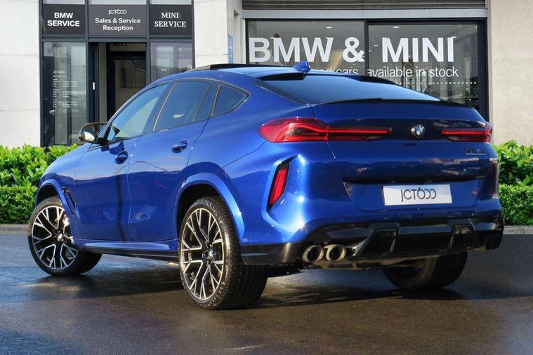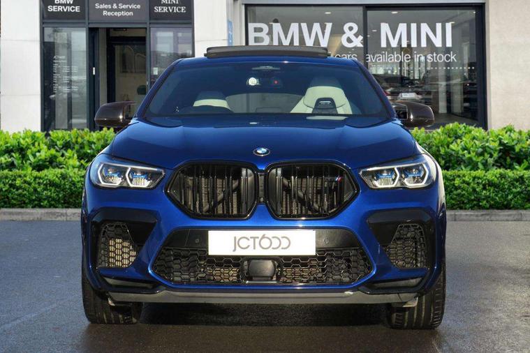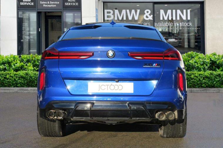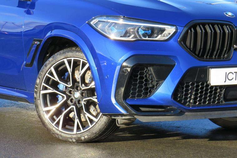 32GB hard disc drive (HDD) memory, Attentiveness assist, Automatic tailgate with top hinged section open and manual bottom hinged section, BMW ConnectedDrive online services, BMW digital live cockpit professional - 12.3" digital instrument panel and 12.3" CID, with touch/voice command, BMW Drive recorder, BMW gesture control, BMW Head up display, BMW legal emergency call, BMW Teleservices, Brake force display, Brake pad wear indicator warning light, Electric Power Steering (EPS) with Servotronic, Enhanced bluetooth hands free facility with Telephony wireless charging, Front/rear park distance control (PDC), iDrive touch controller with shortcut buttons, Infinity symbol with line graphic on reset of average consumption, Oil sensor for level and grade, On board computer inc. average speed, fuel consumption, liquid crystal Info display, journey computer, outside temperature display, personal profile, Parking assistance plus with ultrasound based assistance system, reversing assistant, lateral parking aid and surround view system, Run flat indicator, Service interval indicator, Stop/start button, Wi-Fi hotspot, 8 speed automatic with steptronic transmission including launch control and gearshift paddles on the steering wheel, Adaptive M suspension professional, Double VANOS, High precision injection, M Sport differential, M xDrive system, Petrol Particulate Filter, Safety battery terminal clamp, Turbocharger with Valvetronic, DAB Tuner enables digital radio reception, Favourite buttons, USB connection, USB type A 1.5A in cupholder, USB Type C 3A in centre armrest, Automatically dimming rear view mirror, BMW Individual high gloss shadow line, BMW Individual high gloss shadow line with extended contents, Body colour bumpers, Body colour door handles, Dynamic brake lights with LED technology, Follow me home headlight function, Front and rear bumper system, Front and rear door sill strips, Front and rear electric windows with open and close fingertip control, anti trap facility and comfort closing, Heated windscreen washer jets, High beam assistant, LED daytime running lights, LED fog lights, LED rear lights, M Sport exhaust system, Rain sensor with automatic headlight activation and windscreen wiper control, Third brake light in rear spoiler, Variable intermittent rear wash/wipe, Welcome light carpet, X6 M competition badging on tailgate high gloss black right finished, 12V - Power sockets with 2x centre console and 1x luggage compartment, 3 rear headrests, 4 zone control automatic air conditioning, 40:20:40 split folding rear seats, Child seat ISOFIX attachment with rear outer seats includes top tether, Driver + front passenger lumbar support, Electric front seats with memory function, Electrical steering column with adjustable height and length with activation and control on the steering column, Front and rear cupholders x 2, Front and rear door pockets, Front and rear side armrest integrated into door trim, Front reading lights, Light inside glove compartment, Lockable glove compartment, Luggage compartment floor panel with integral storage tray, Luggage compartment lighting, M leather steering wheel, M multifunctional driver and front passenger seats, Make-up mirror lights, Multifunction controls for leather steering wheel, Multifunctional hooks, Seat back with flap pocket, Securing rings in luggage compartment, Storage bins on all doors, Storage tray and compartment with cover in centre console, Sunvisors with illuminated vanity mirrors, Toolkit located in luggage compartment, Velour floormats, Ambient light interior pack - X5 M/ X6M, Connected Package Professional - X6 M, Expanded exterior mirror pack - X6/X6 M, Heated front comfort pack - X5/X6 M, Active protection, Airbags - driver/front passenger, rear and side, first and second row seats head airbags, front passenger seat airbag deactivation + knee airbag, Anti-lock braking system (ABS), Automatic Stability Control (ASC), Black M seatbelts with coloured M seam for all seats, Brake drying, Brake energy regeneration, Brake fade compensation, Braking pre-tensioning, Cornering brake control (CBC), Crash sensor activating central locking release, hazard warning lights, fuel cut off, interior lighting + activation of safety battery terminal clamp, Deformation zones - front and rear with door reinforcements and bumpers up to 2.5 mph, DSC - Dynamic Stability Control, Dynamic brake control, Dynamic Traction Control - DTC, Electromechanical parking brake with automatic drive away release and auto hold function, Electronic brake force distribution, Front and rear brake discs with interior ventilation, Front and rear M seatbelts stopper, seatbelt tensioner for front and outer rear seats and belt force limiter, Front head restraints with anti-whiplash, Height adjustable front seatbelts, Hill start assistant, Integrated brake system, Mechanical child proof lock on rear doors, Passive protection for pedestrians, Seat occupancy detection for driver and passenger side, Side impact protection, Three 3 point inertia reel seatbelts, Two tone horn, Tyre pressure indicator, Warning triangle and first aid kit, Closing system with central locking, Comfort access system, Driver and front passenger door centre lock switch, Locking wheel bolts, Thatcham 1 alarm system with remote control and engine immobiliser, Vehicle key, BMW Individual leather finished instrument panel, Tyre repair kit,